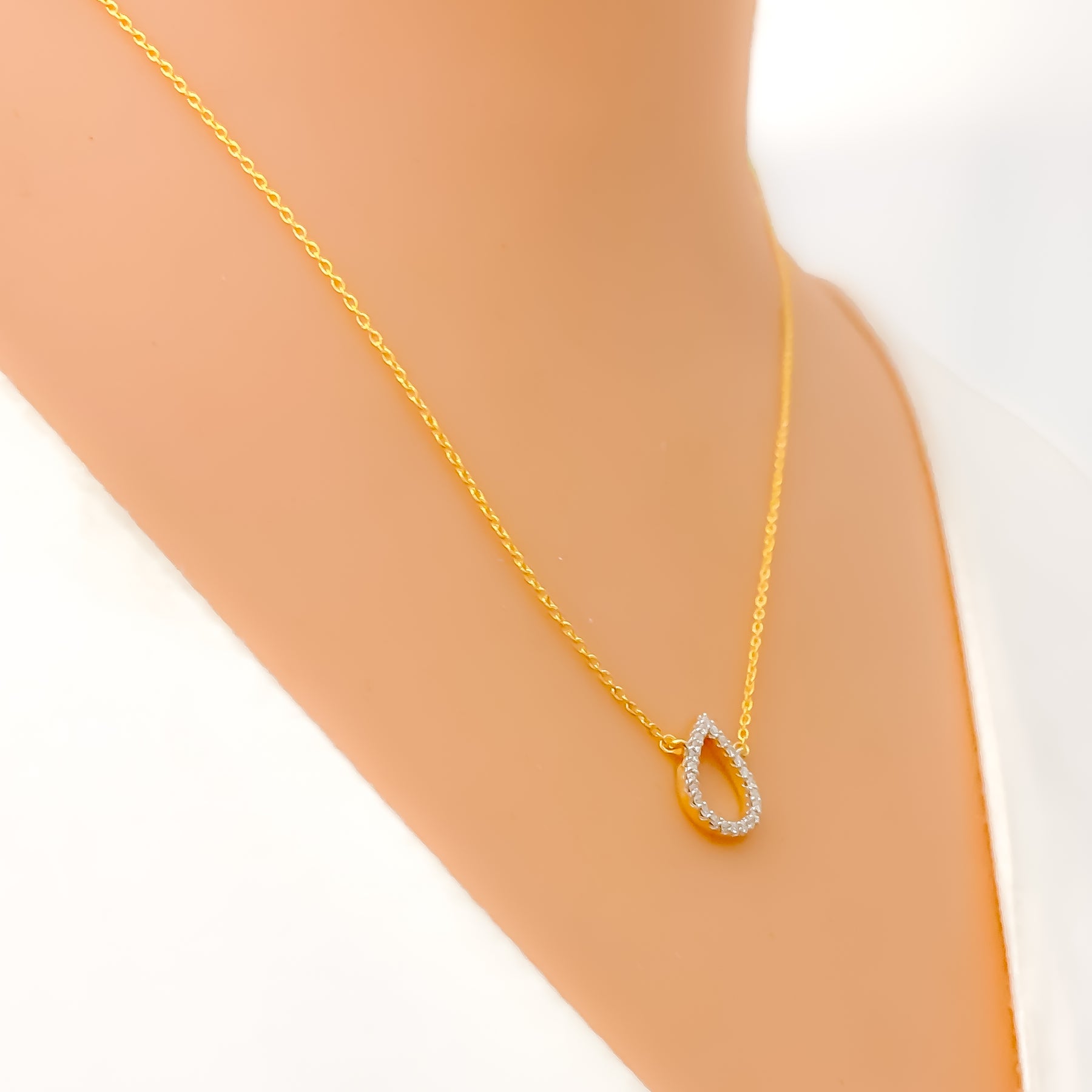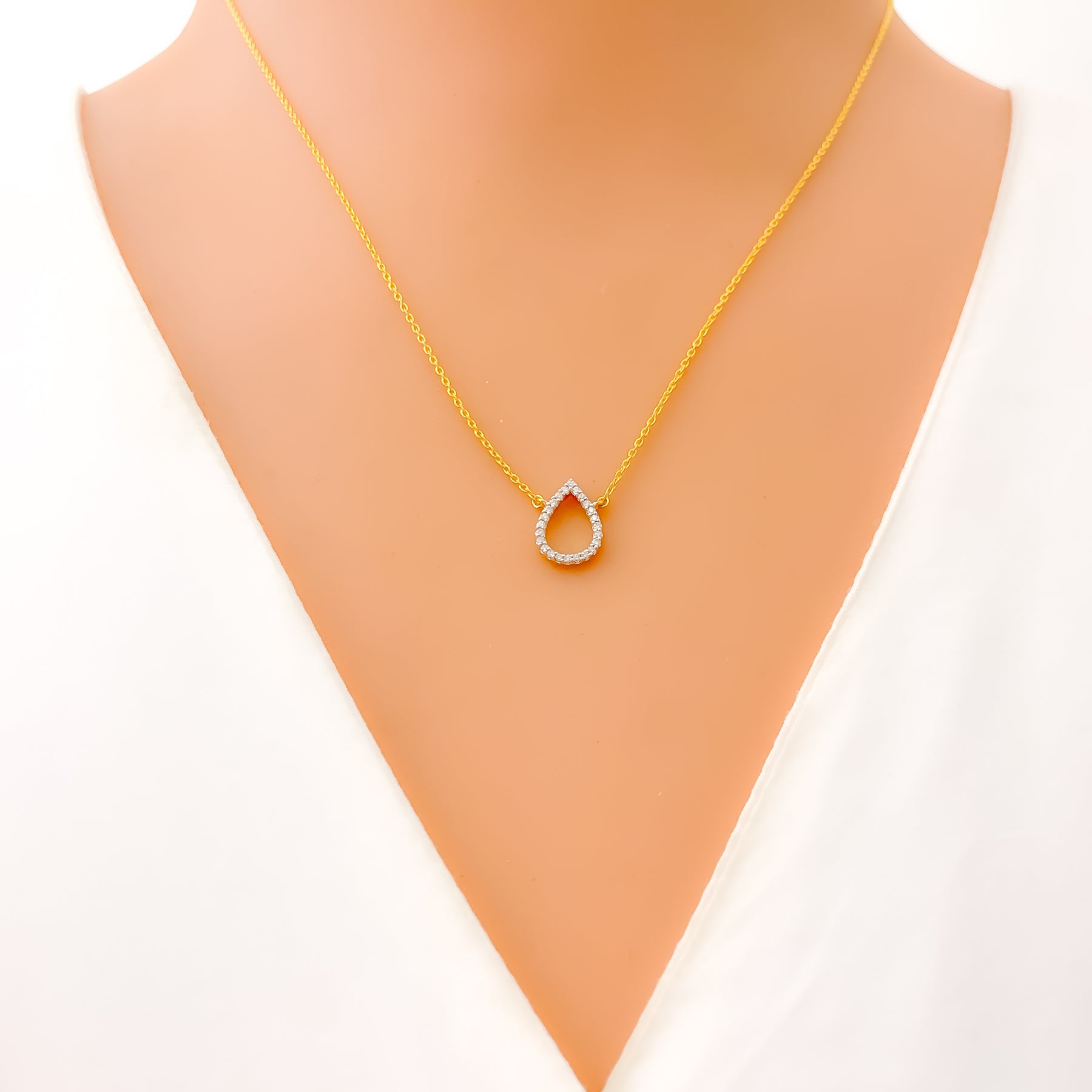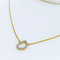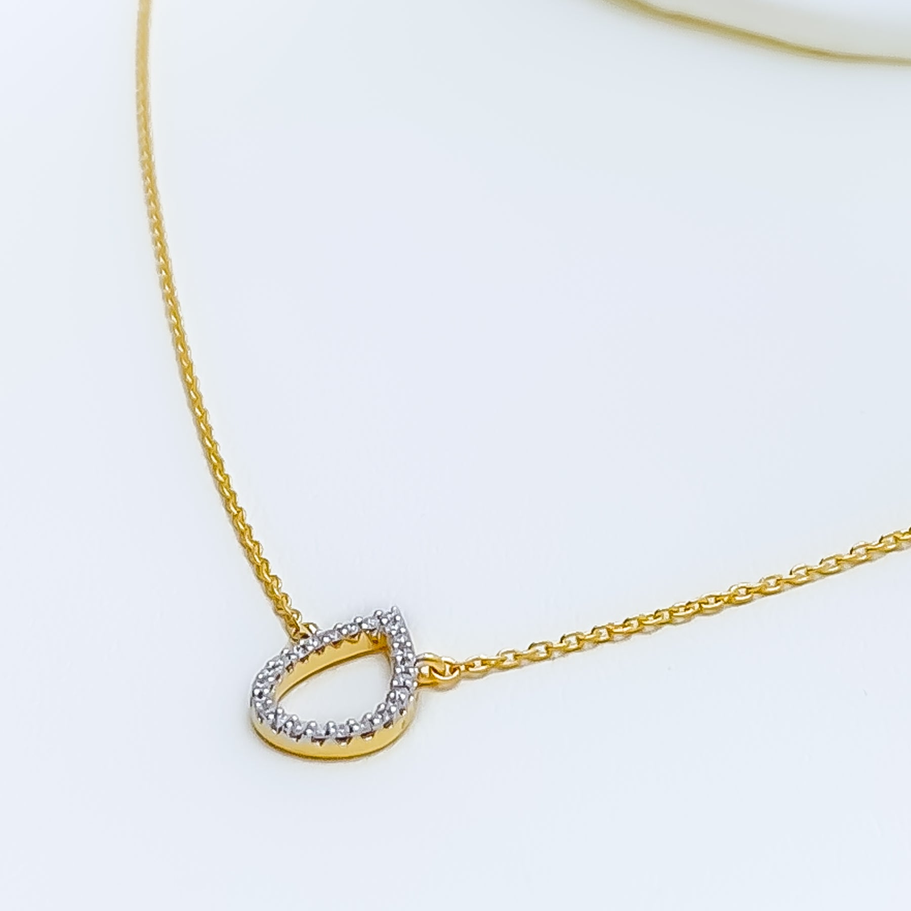 Radiating graceful brilliance, this 18k yellow gold necklace weighs 1.8 grams and features a refined drop-shaped pendant set with 0.08ct of round brilliant cut diamonds in G-H color and VS clarity. The 17-inch chain includes 2 inches of adjustable links and fastens securely with a lobster ring lock for a custom fit. With a 0.4-inch drop, this piece offers soft movement and shimmering elegance—ideal for those who appreciate delicate sparkle and timeless sophistication in a GGL-certified design.