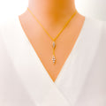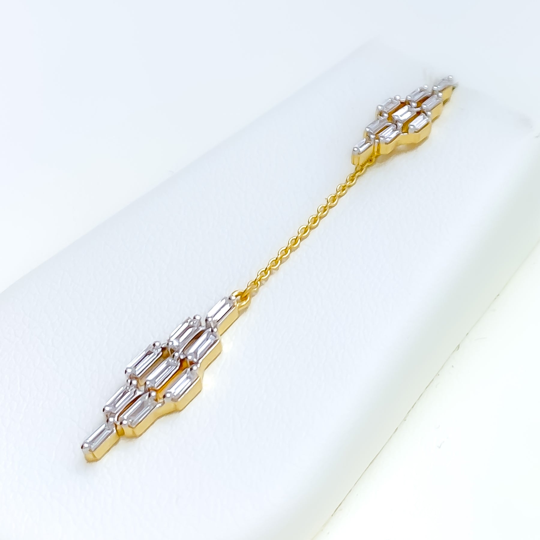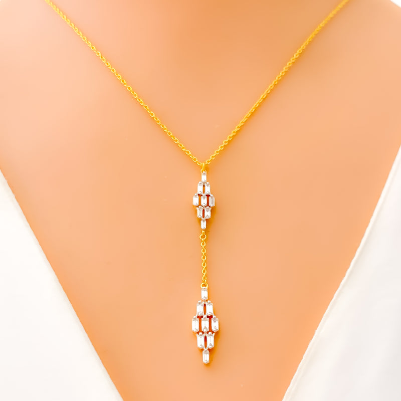 Crafted in gleaming 18k yellow gold, this luminous necklace set features 1.08 carats of radiant baguette-cut diamonds that offer a sleek, linear brilliance. The 18" chain flows into a striking 1.8" drop, blending modern design with graceful charm. Included are matching 2" detachable earrings that elevate versatility and elegance for any occasion. GGL certified, this refined set is a sophisticated fusion of artistry, light, and lasting allure.