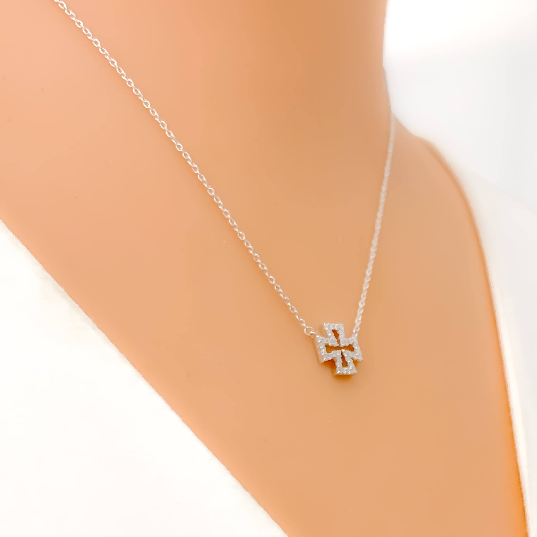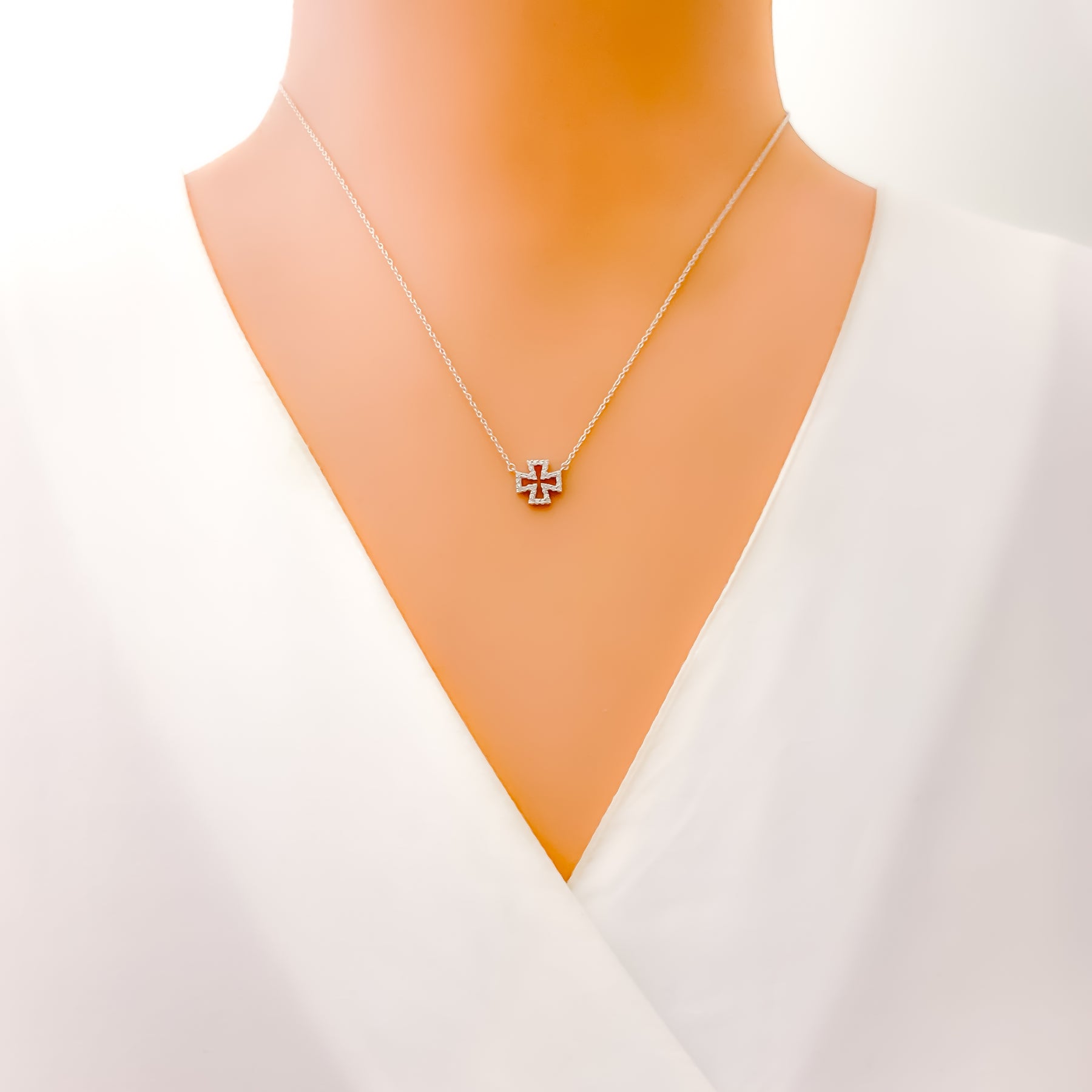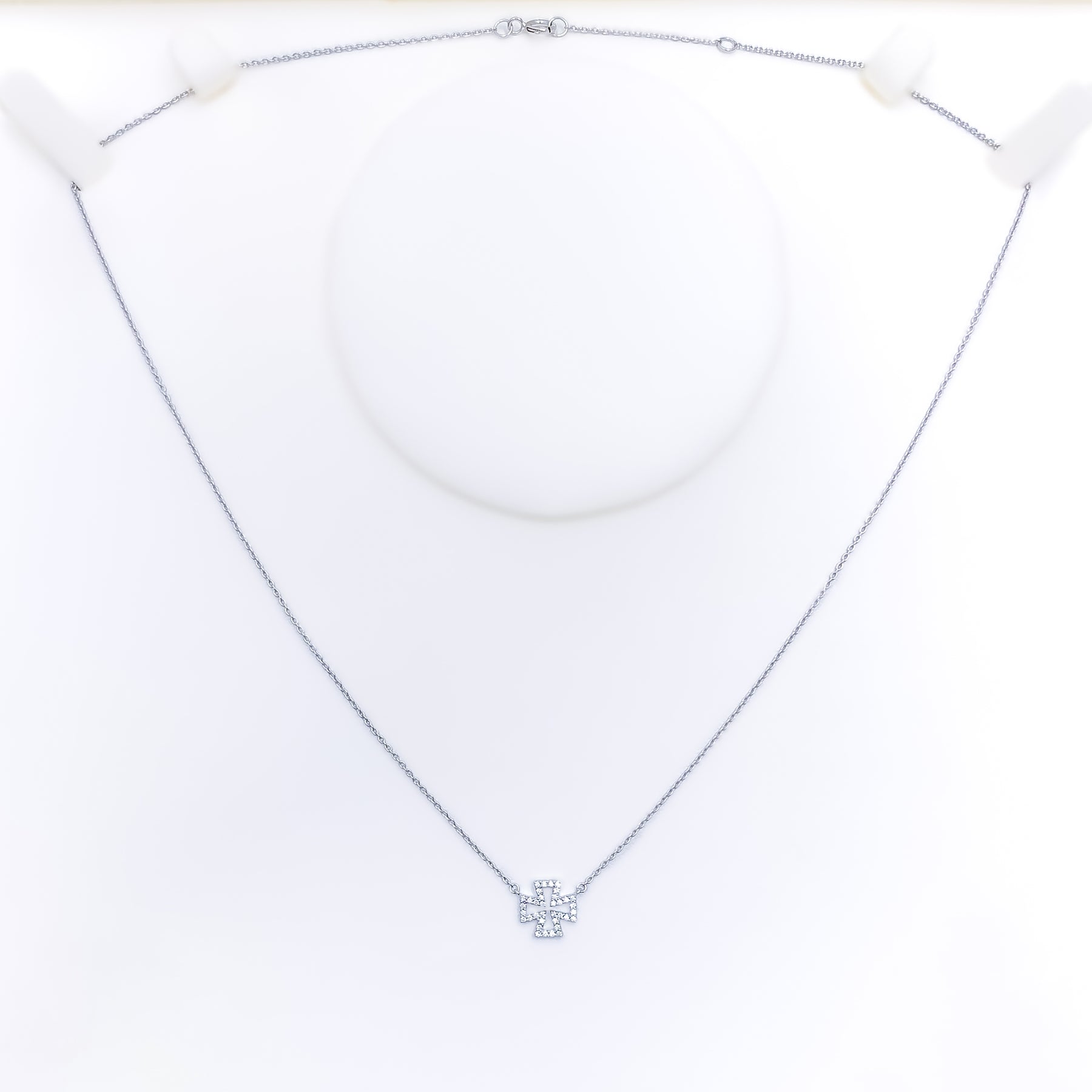 Chic and artfully designed, this 18k white gold necklace weighs 1.9 grams and features a distinctive pendant adorned with 0.13ct of round brilliant cut diamonds in G-H color and VS clarity. The 17-inch chain includes 2 inches of adjustable links and fastens with a secure lobster ring lock for a perfect fit. With a refined 0.3-inch drop, this GGL-certified piece blends modern elegance with eye-catching sparkle—ideal for those who appreciate standout style with a touch of luxury.