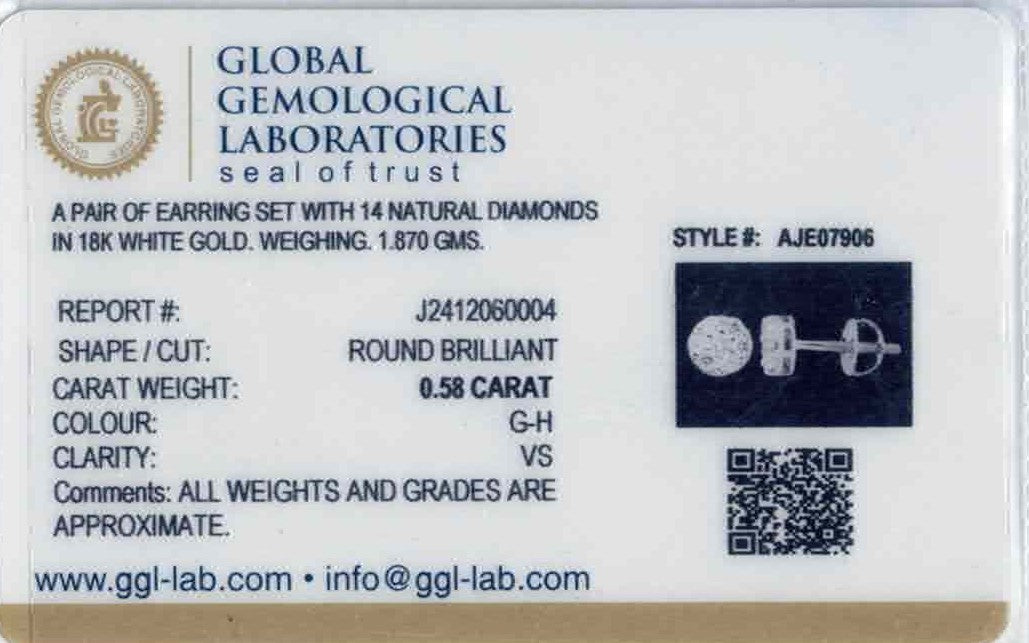 Elegantly enduring, these 18k white gold diamond earrings weigh 1.87 grams and feature round brilliant cut diamonds totaling 0.58 carats in G–H color with VS clarity, finished with a luminous polished shine. Designed as classic tops, the refined buttoned silhouette measures 0.25 inches in diameter, offering concentrated sparkle with timeless balance. Secure screw-back posts provide comfortable, confident wear while maintaining a sleek, structured profile. GGL certified and heirloom-inspired, these earrings deliver lasting sophistication ideal for everyday luxury and special occasions.