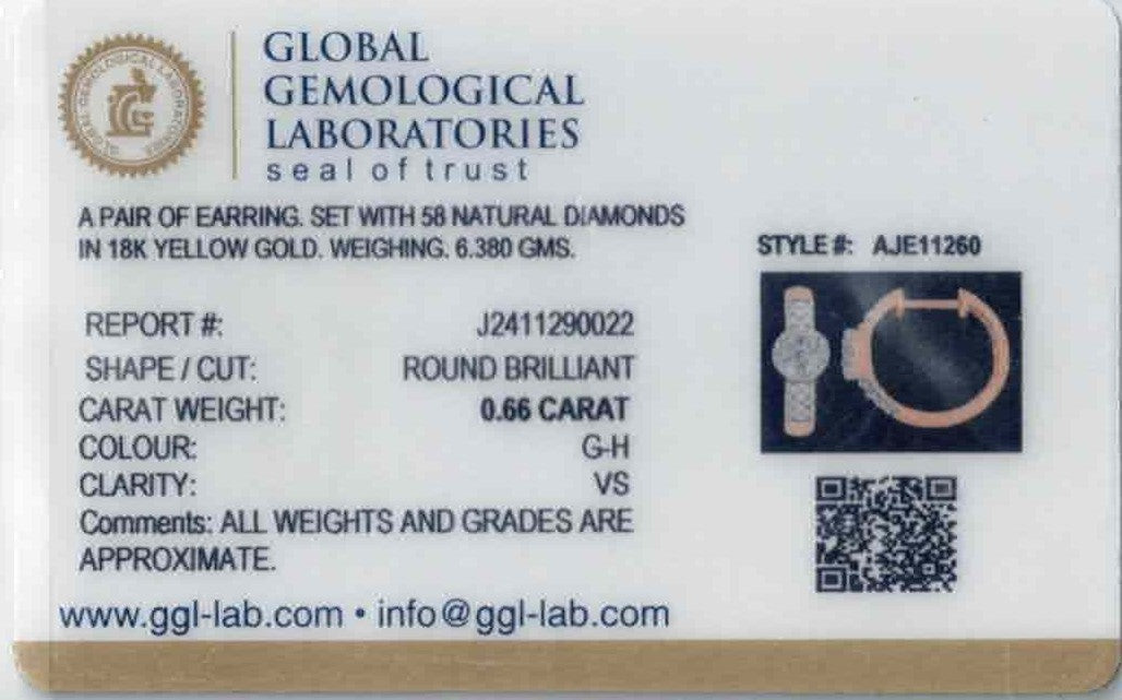 These striking earrings highlight 0.66ct of radiant round brilliant diamonds, offering exquisite sparkle in a refined 18k yellow-gold silhouette. Weighing 6.38 grams, they balance presence and comfort with an elegant 0.6-inch Bali profile. The polished push-lock mechanism ensures smooth, secure wear for any occasion. Certified by GGL, they deliver timeless brilliance with a gracefully blooming aesthetic.