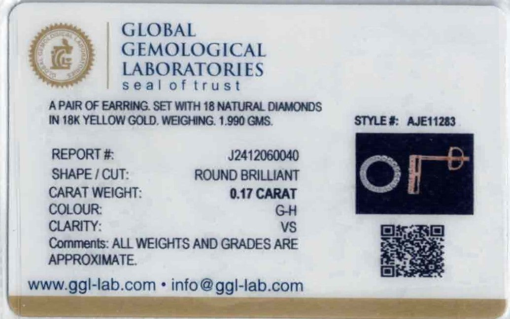 Purely refined, these 18k yellow gold diamond earrings weigh 1.99 grams and feature round brilliant cut diamonds totaling 0.17 carats in G–H color with VS clarity, finished with a luminous polished glow. Designed as elegant tops, the clean silhouette measures 0.3 inches in diameter, delivering subtle sparkle with balanced proportion. Secure screw-back posts provide comfortable, confident wear while maintaining a sleek, modern profile. GGL certified and timeless in appeal, these earrings offer understated luxury ideal for everyday sophistication and polished occasions.