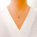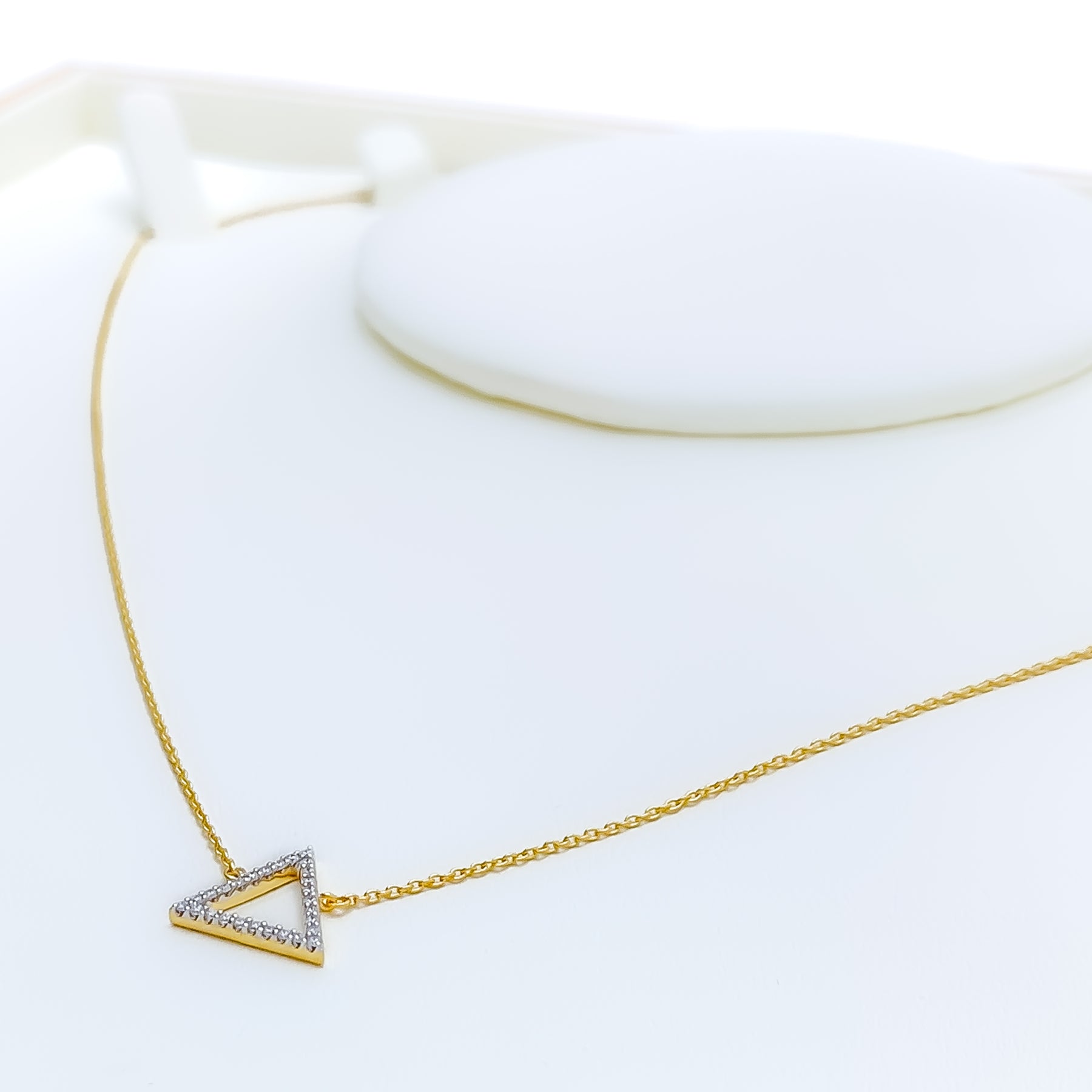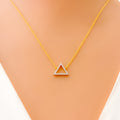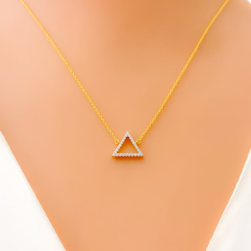 Chic and contemporary, this 18k yellow gold necklace weighs 1.7 grams and highlights a sleek triangle pendant adorned with 0.10ct of round brilliant cut diamonds in G-H color and VS clarity. The 17-inch chain features 2 inches of adjustable links and secures with a lobster ring lock for a custom fit. With a 0.5-inch drop and GGL certification, this piece blends geometric flair with timeless sparkle—perfect for those who appreciate bold shapes paired with refined elegance.