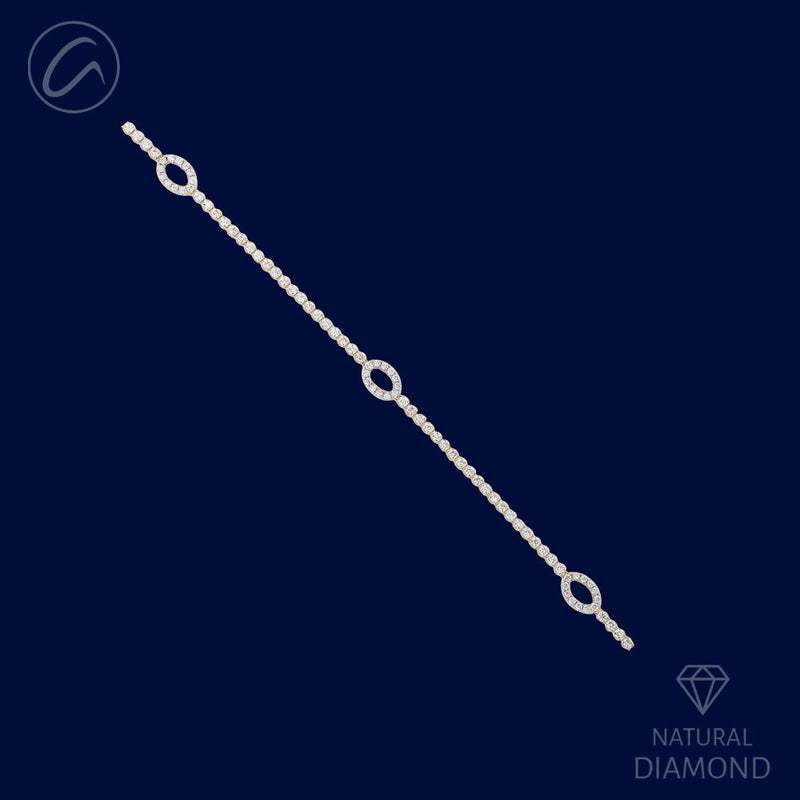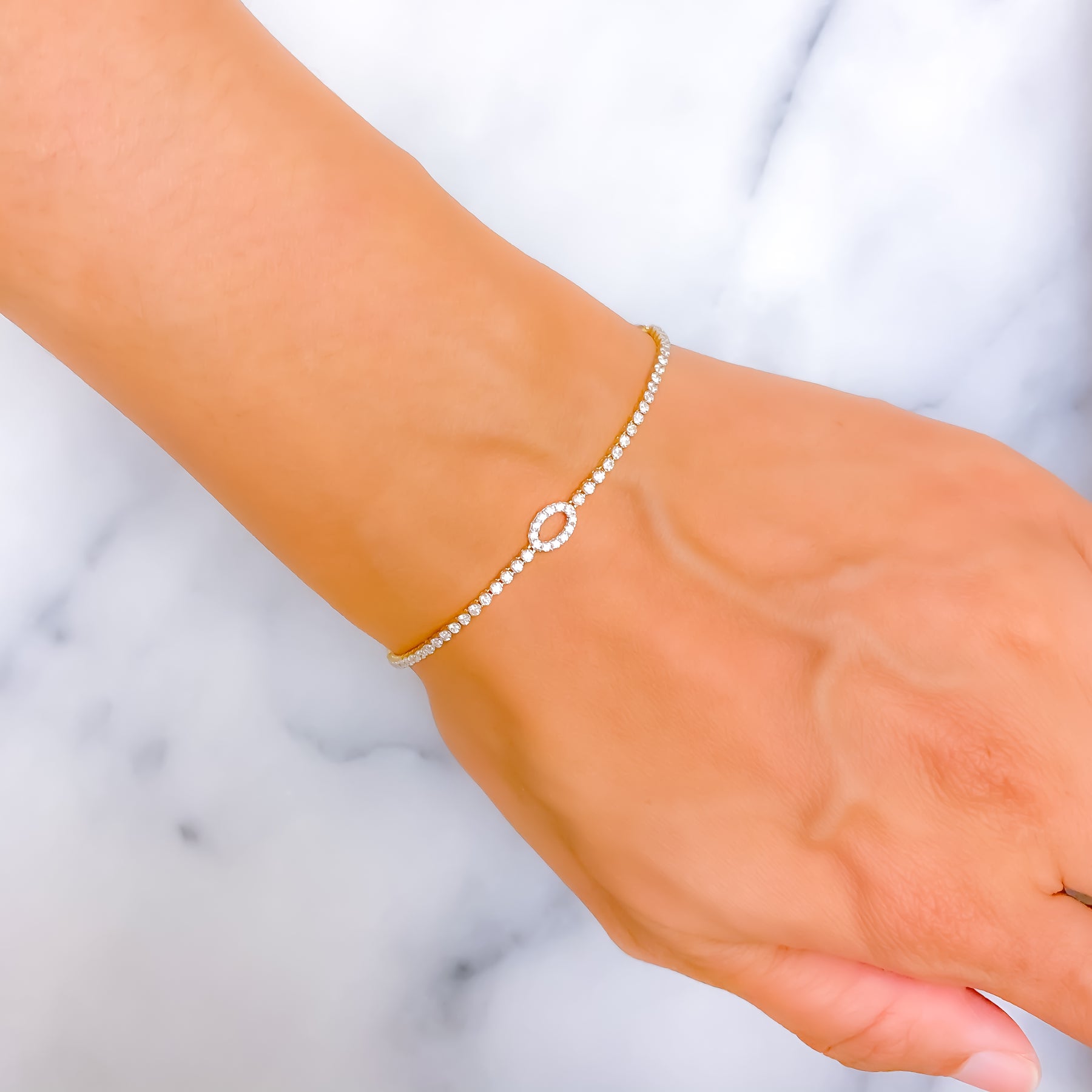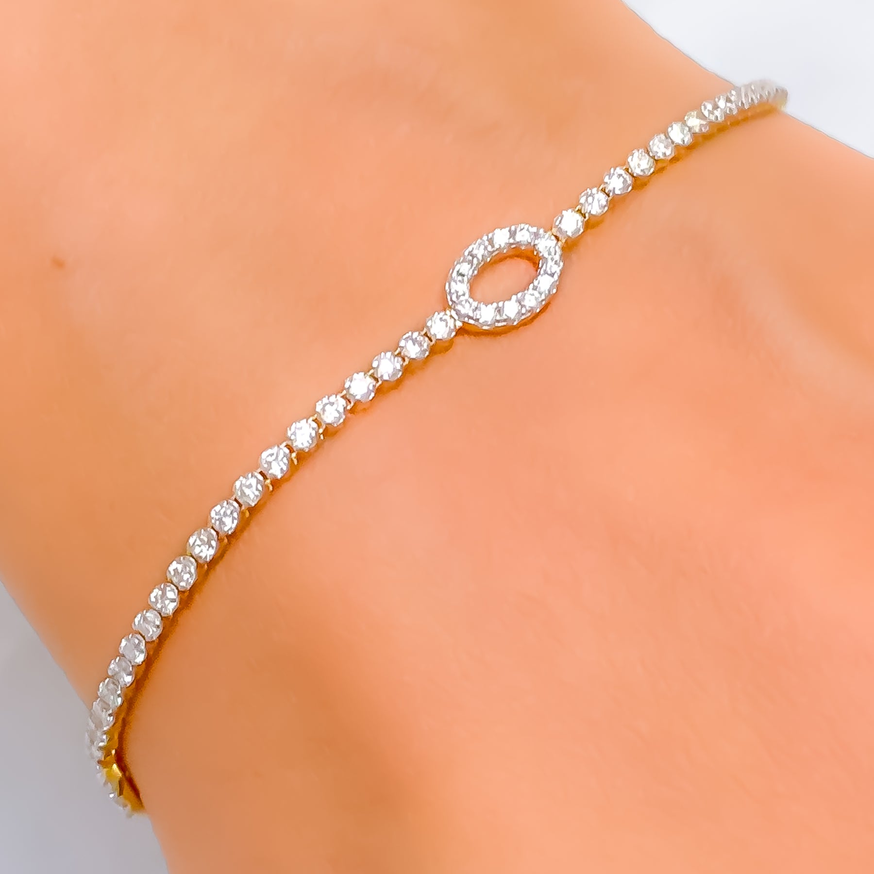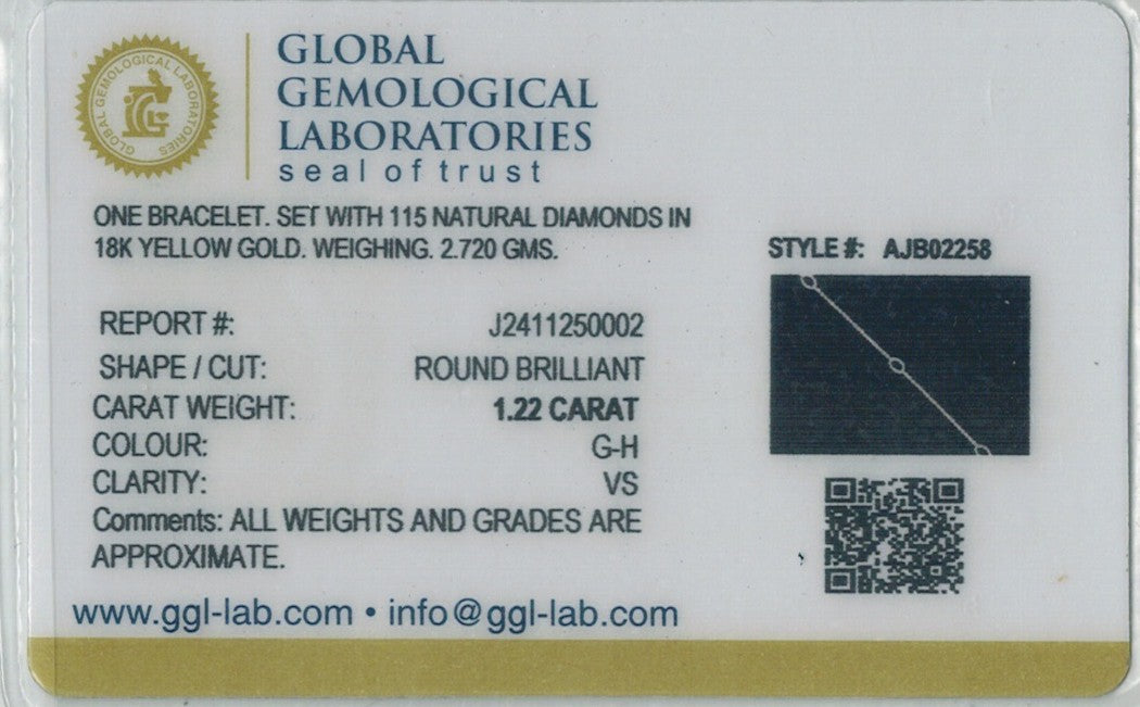 Crafted in sleek 18k yellow gold and weighing 2.7 grams, this bracelet showcases a stylish open oval centerpiece adorned with 1.22 carats of round brilliant cut diamonds. Graded G-H in color and VS in clarity, the diamonds deliver radiant sparkle and refined detail. Measuring 7 inches in length and secured with a slim lobster lock, it offers a polished fit with modern appeal. Effortlessly chic, this piece blends contemporary design with classic brilliance for a fashionable and versatile statement.