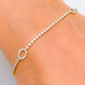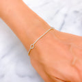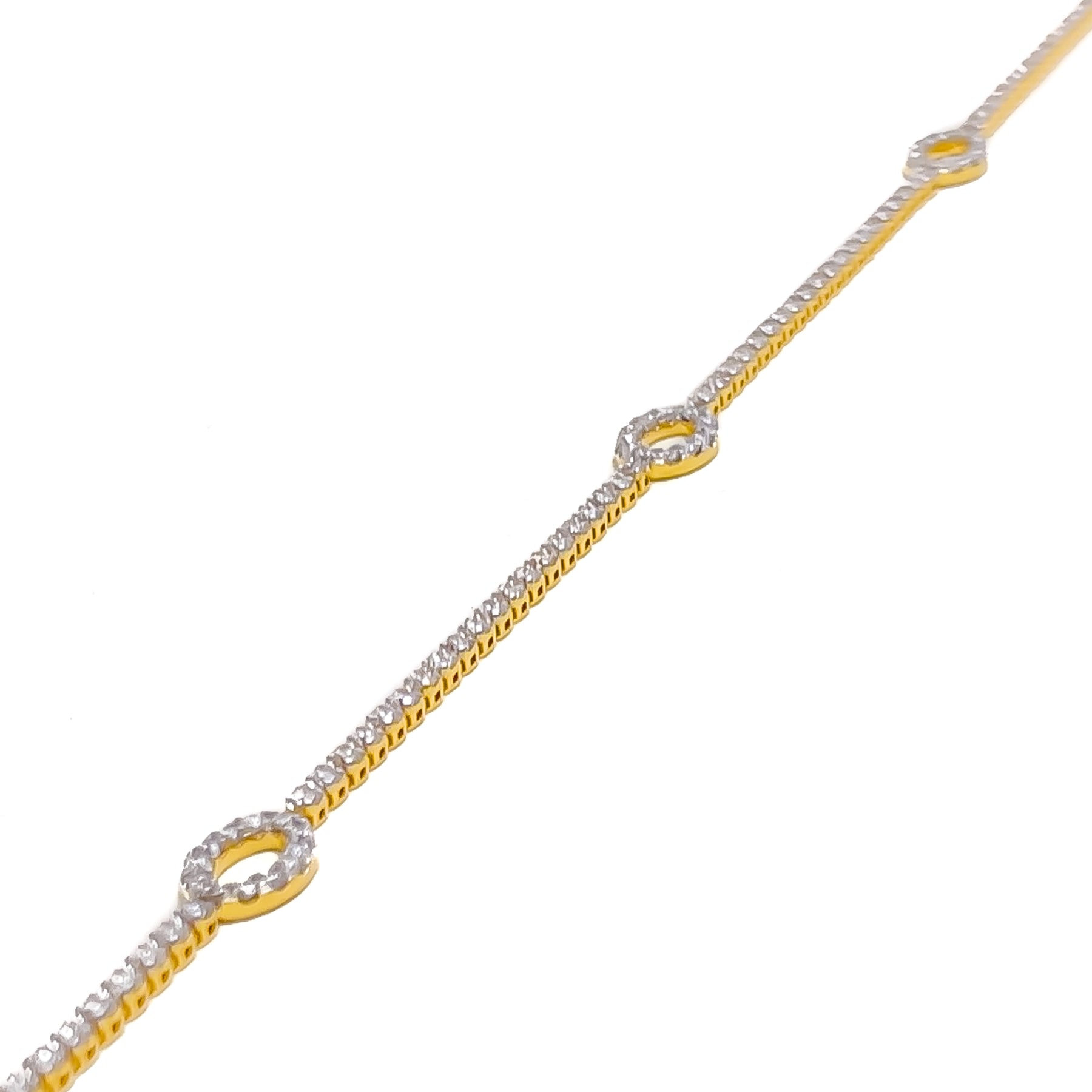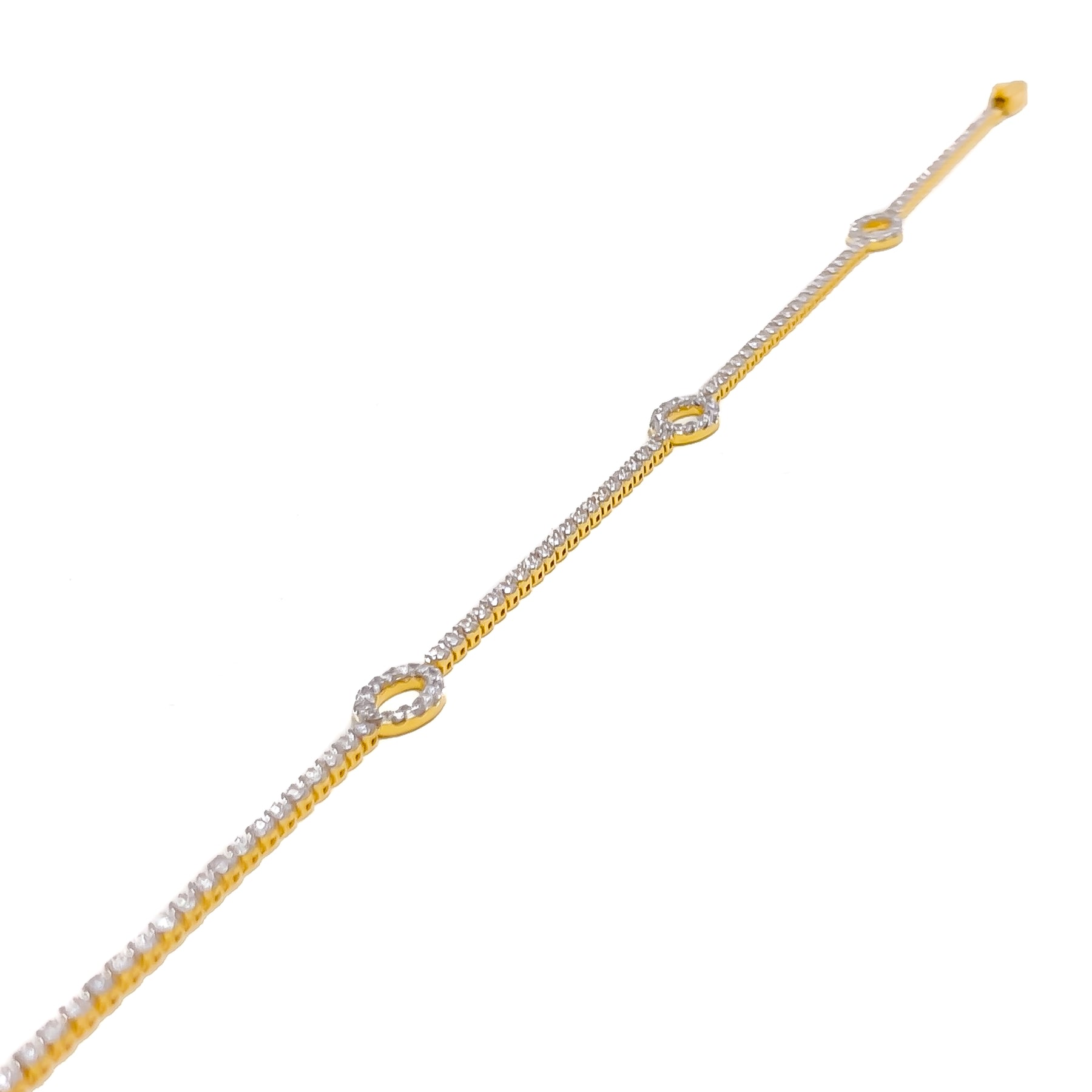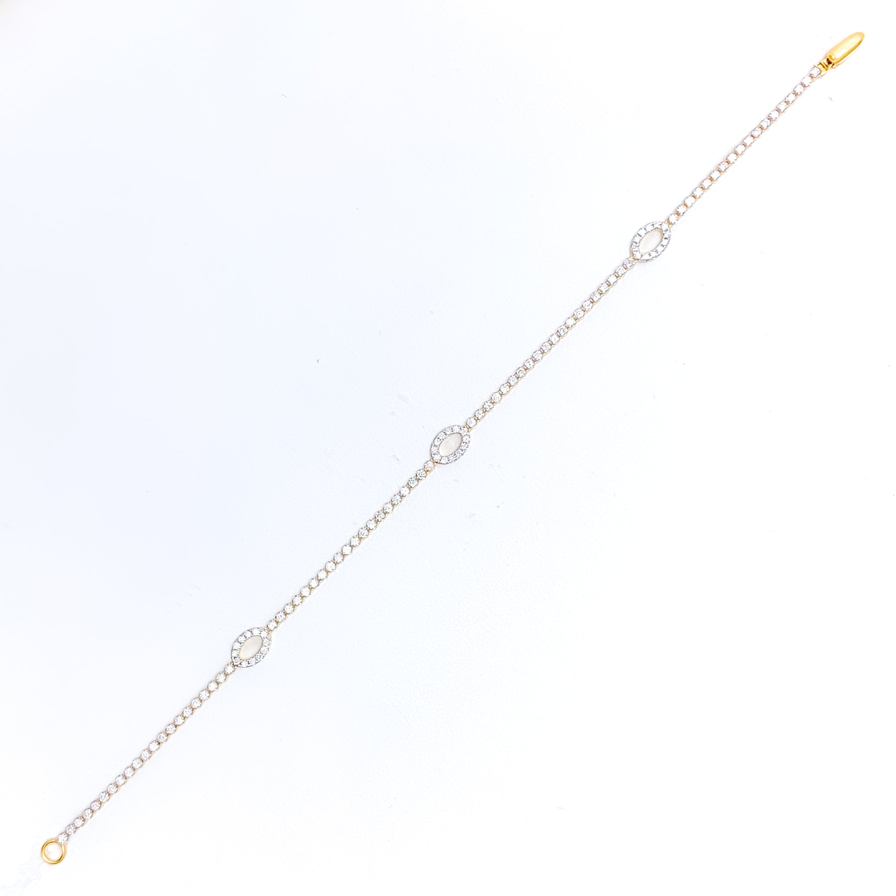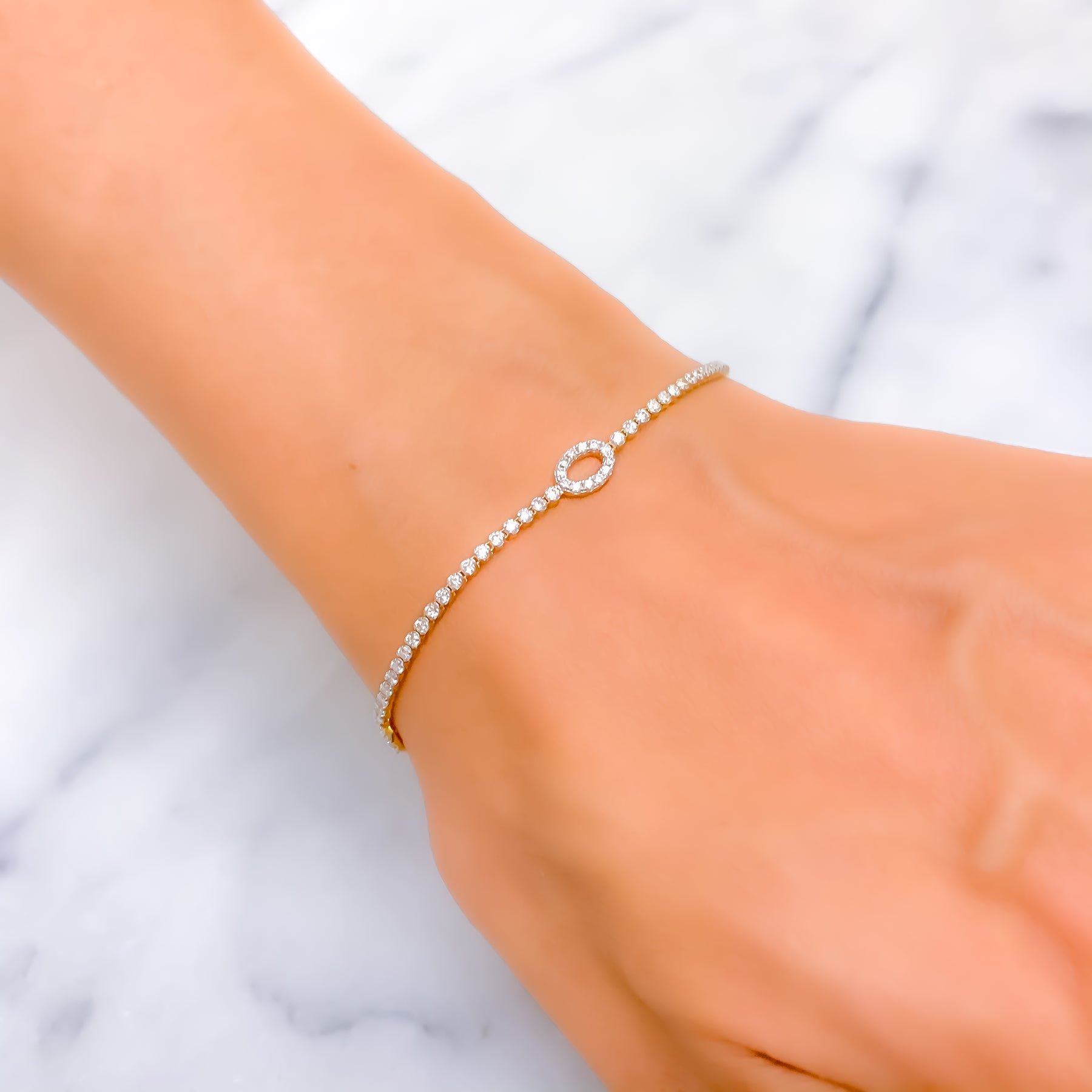 Crafted in sleek 18k yellow gold and weighing 2.7 grams, this bracelet showcases a stylish open oval centerpiece adorned with 1.22 carats of round brilliant cut diamonds. Graded G-H in color and VS in clarity, the diamonds deliver radiant sparkle and refined detail. Measuring 7 inches in length and secured with a slim lobster lock, it offers a polished fit with modern appeal. Effortlessly chic, this piece blends contemporary design with classic brilliance for a fashionable and versatile statement.