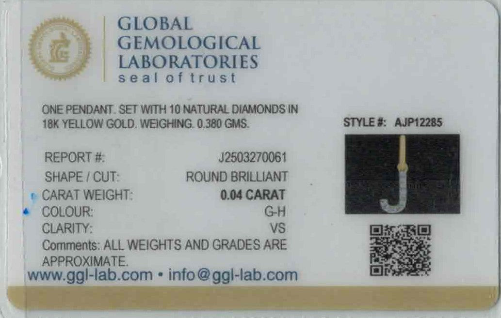 Charming and petite, this 18k yellow gold pendant features the letter J highlighted by a sparkling 0.04ct VS-quality diamond. Weighing just 0.38 grams and measuring 0.6 inches in length, it offers a delicate, personalized accent with timeless appeal. The warm gold tone adds a graceful glow to its sleek design. Chain not included, and it is GGL certified for verified quality and authenticity.