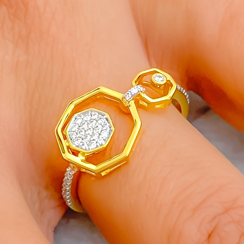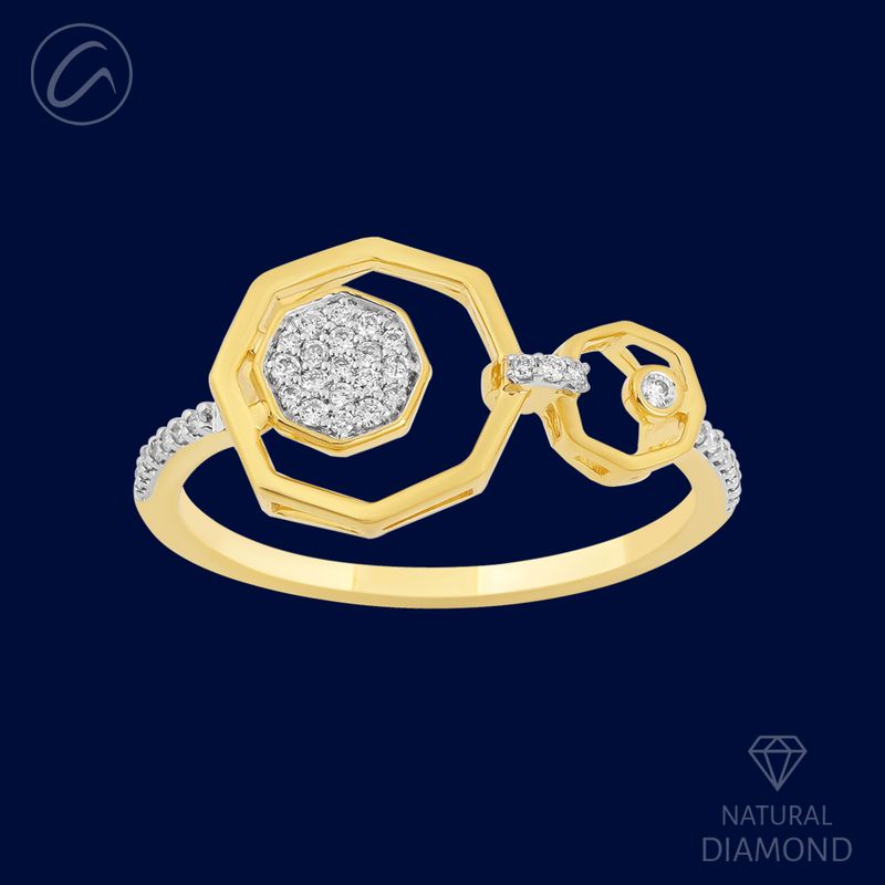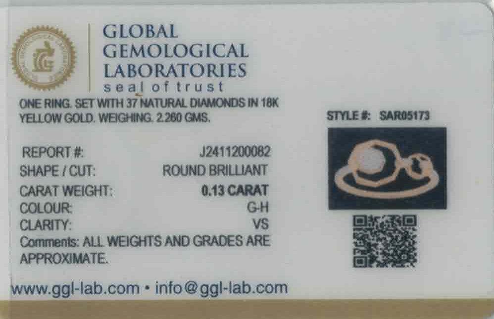 Blending modern geometry with timeless sparkle, this 18k yellow-gold ring features a refined 0.13ct round brilliant diamond arrangement in luminous G–H color and VS clarity for a radiant, eye-catching finish. Its balanced 2.26-gram weight provides a polished feel while maintaining effortless wearability for daily or special-occasion styling. Sized at 7.25 with full re-sizing support, it offers a personalized fit designed to suit a wide range of preferences. Accompanied by a GGL certificate, it delivers both sophistication and assurance, making it a graceful standout in any fine-jewelry collection.