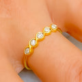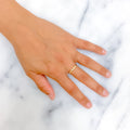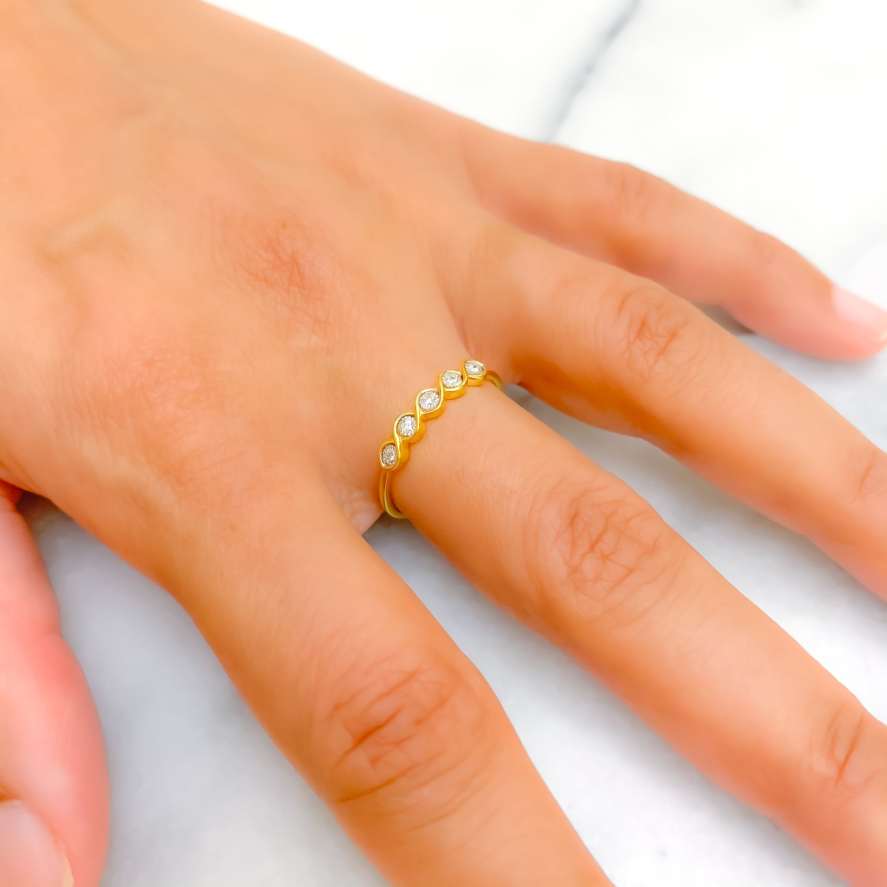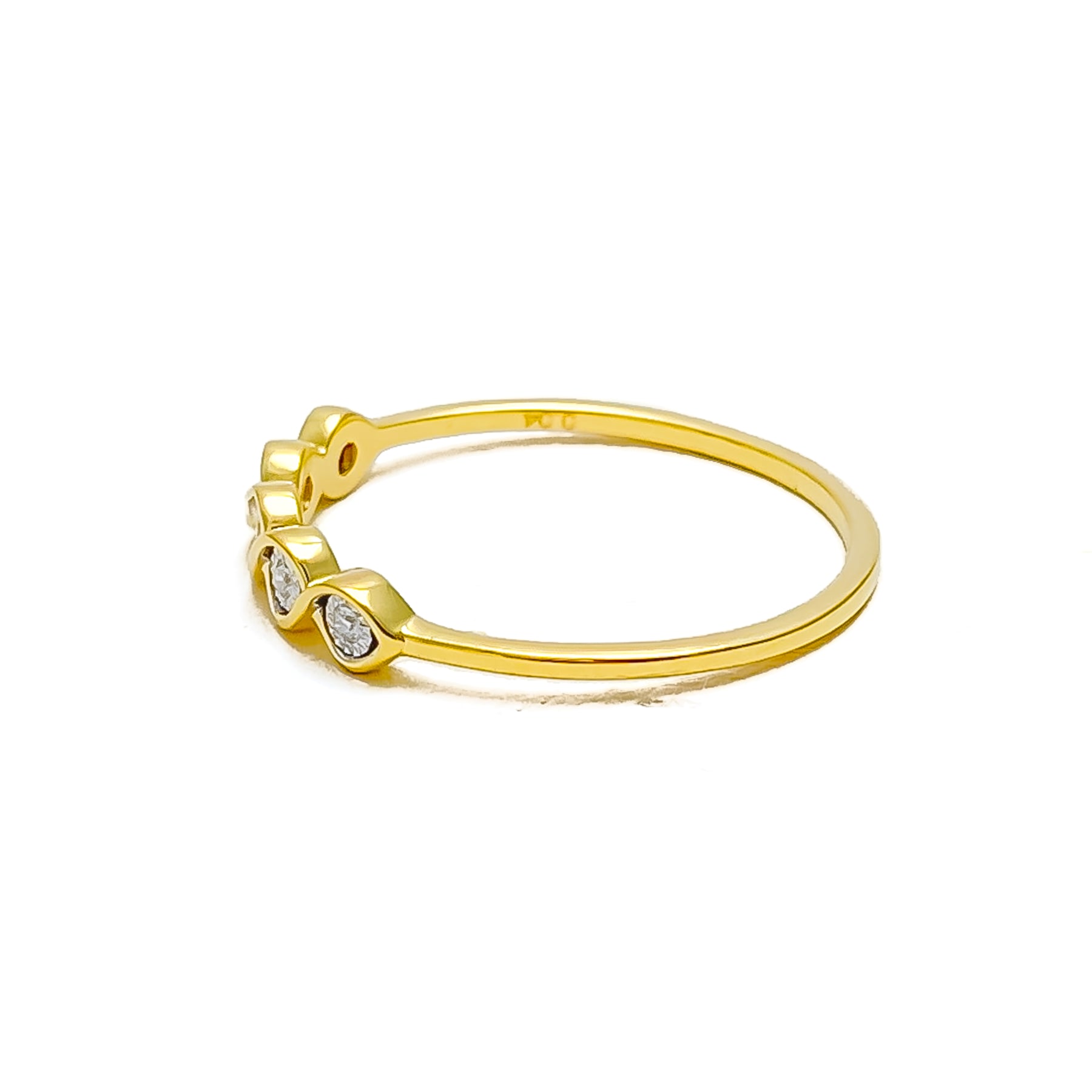 Gracefully sculpted, this 18k yellow gold band weighs 1.3 grams and features a flowing contour design accented with 0.04 carats of round brilliant cut diamonds. Graded G-H in color and VS in clarity, the diamonds add a soft, elegant sparkle to its artistic silhouette. Sized at 7 with re-sizing available, this polished ring offers a modern interpretation of minimal luxury—perfect for stacking or wearing solo with understated creativity.