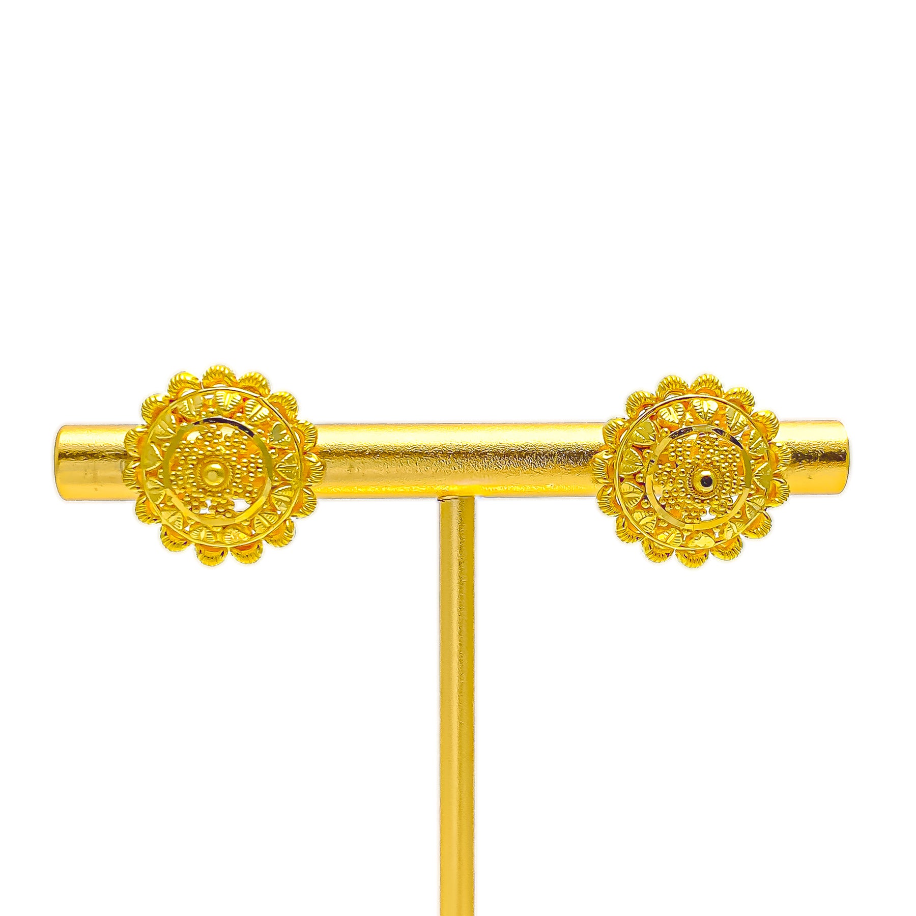 Refined and effortlessly elegant, these 22k yellow gold top earrings showcase a beautifully balanced design with a smooth, polished finish. Crafted with a graceful 0.5" diameter and a comfortable 4.4-gram gold weight, they offer understated sophistication ideal for everyday wear. The clean silhouette lends itself seamlessly to both casual ensembles and dressier looks. Completed with secure screw-back posts, they ensure reliable comfort and timeless appeal throughout the day.