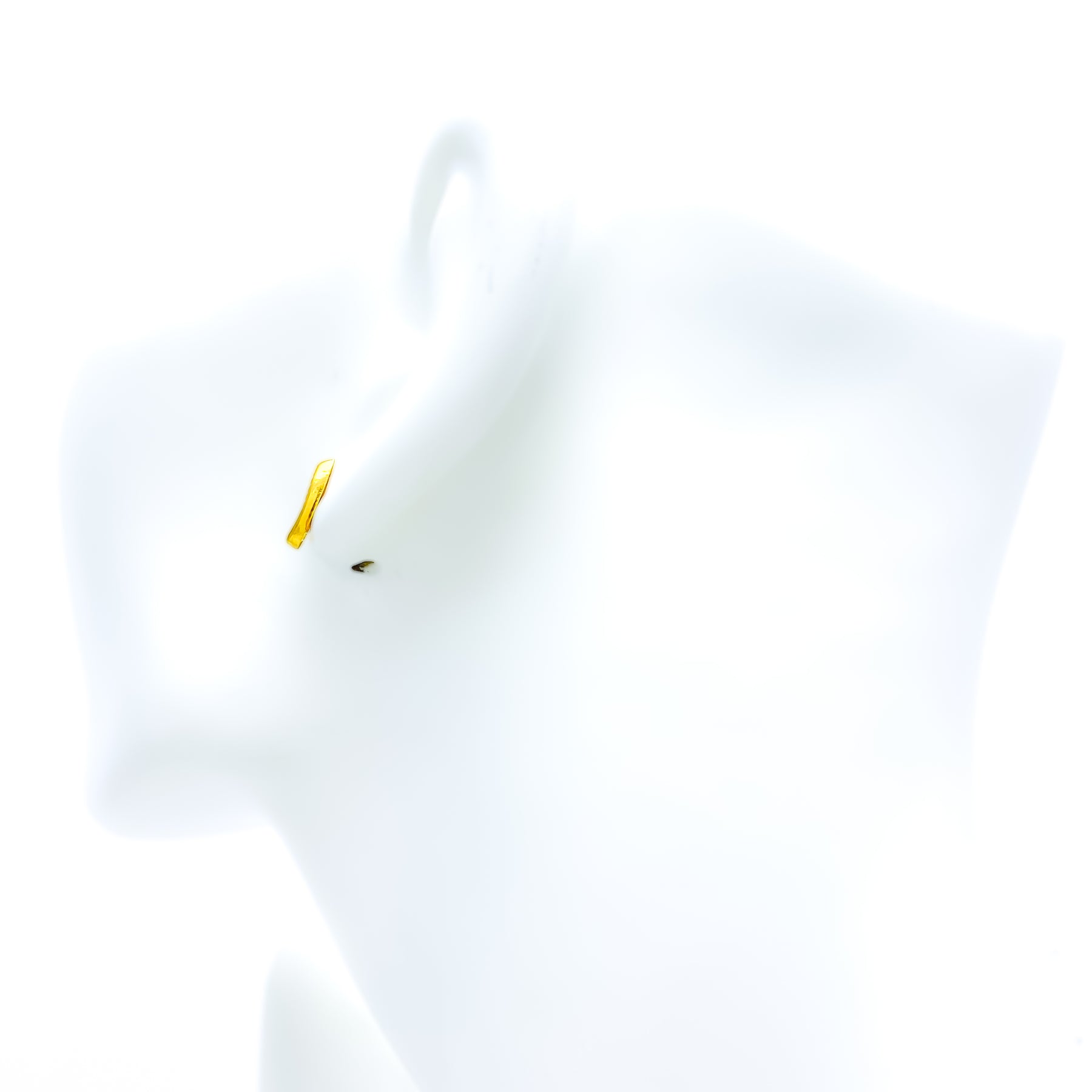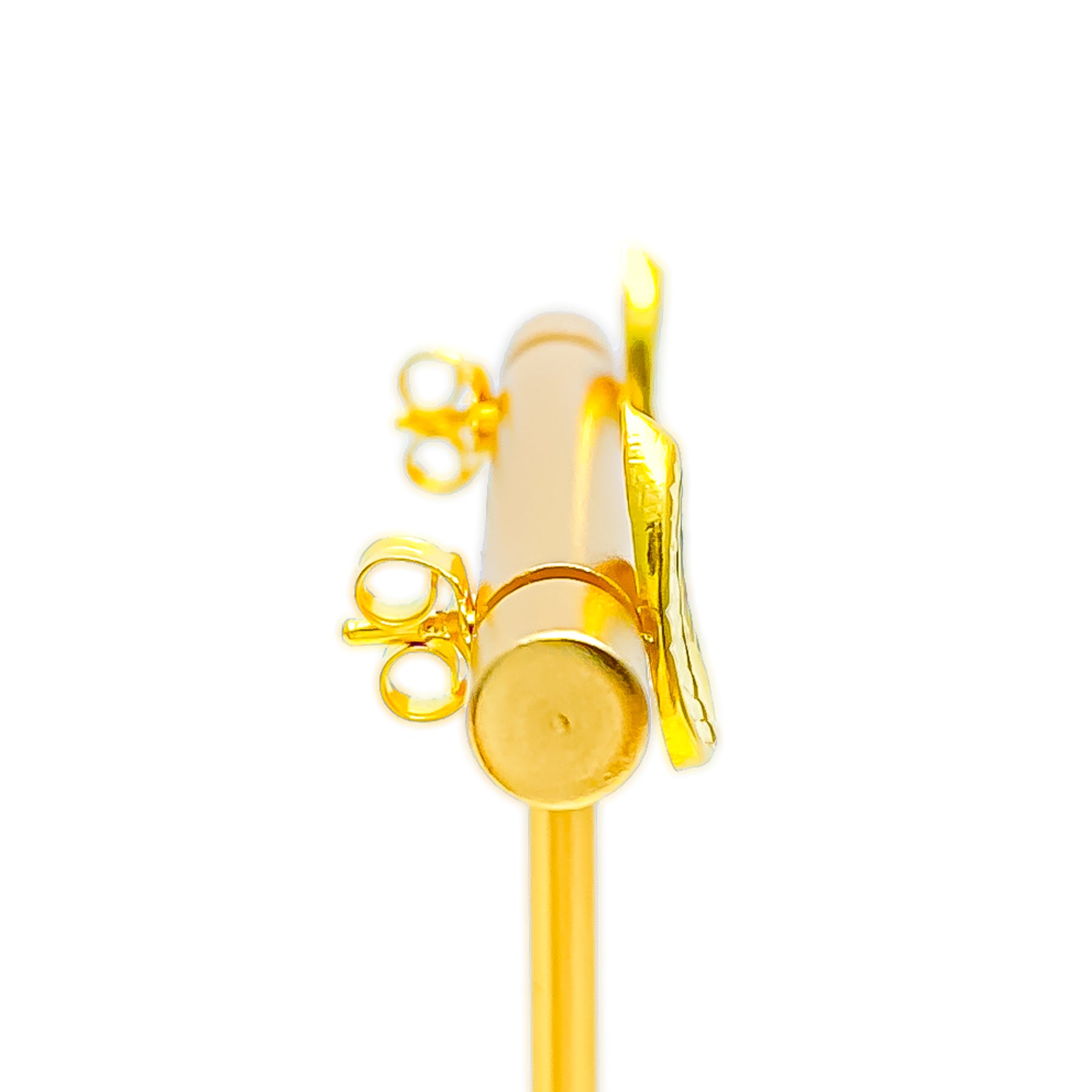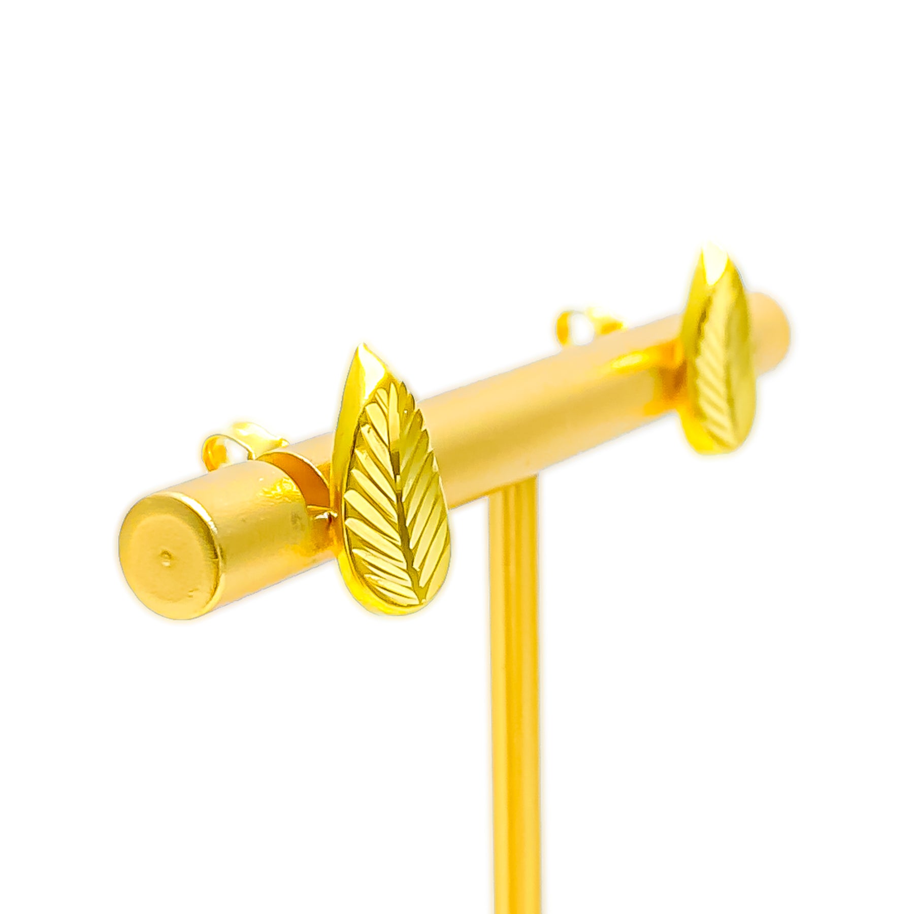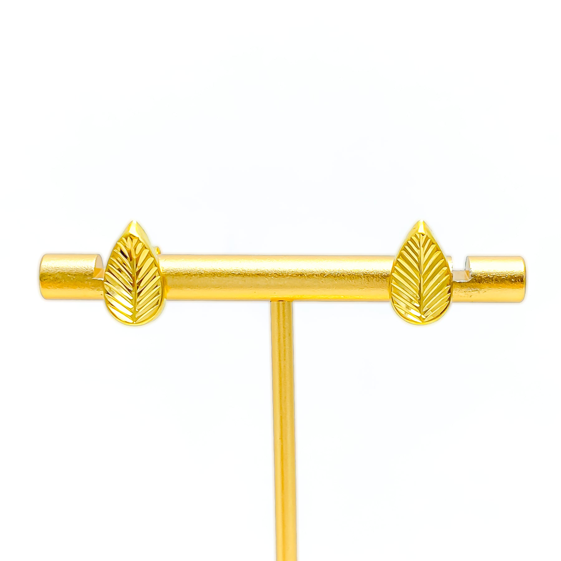 These refined earrings showcase an elegant leaf design, expertly crafted in radiant 22k yellow gold. Their petite size makes them ideal for understated daily elegance or pairing with layered jewelry looks. Lightweight and comfortable, they offer effortless wear all day. Finished with secure push backs, they blend sophistication with ease.