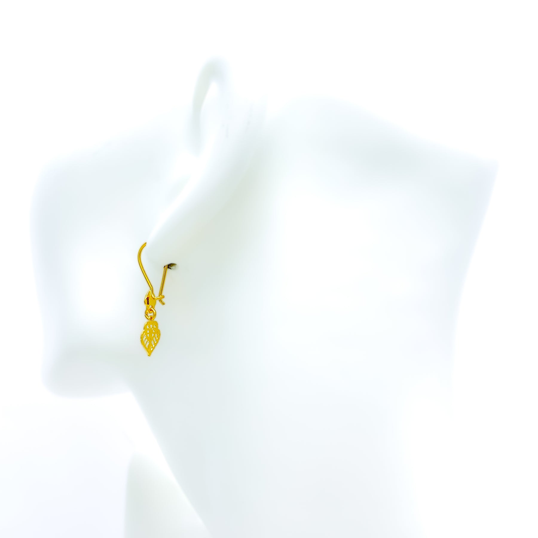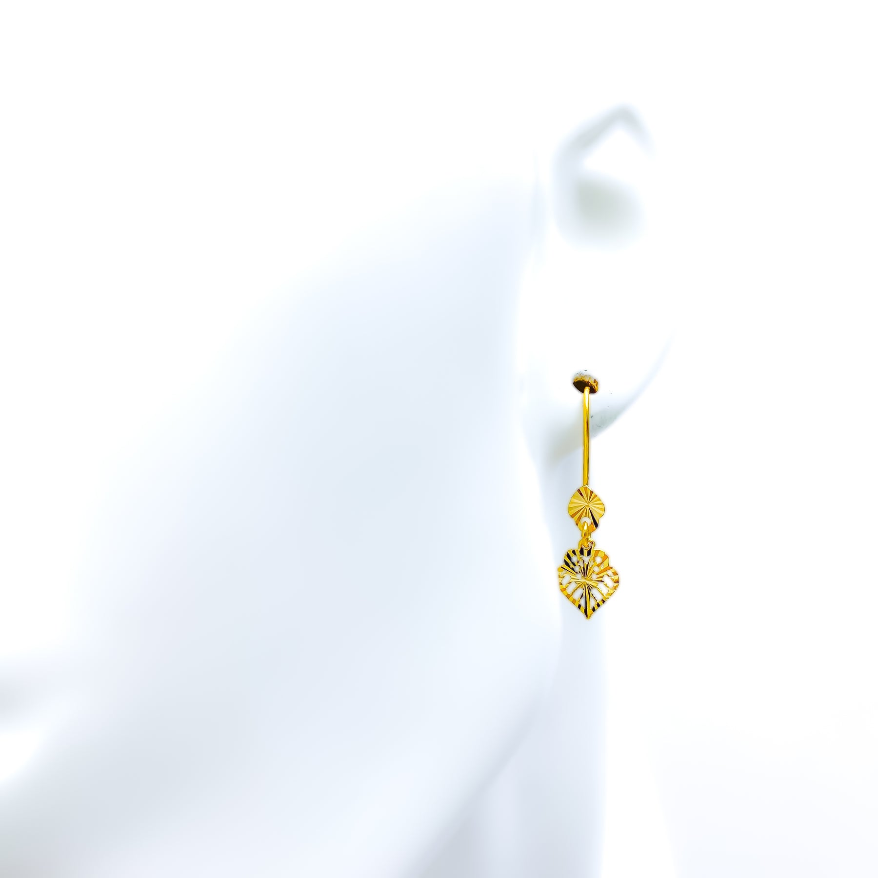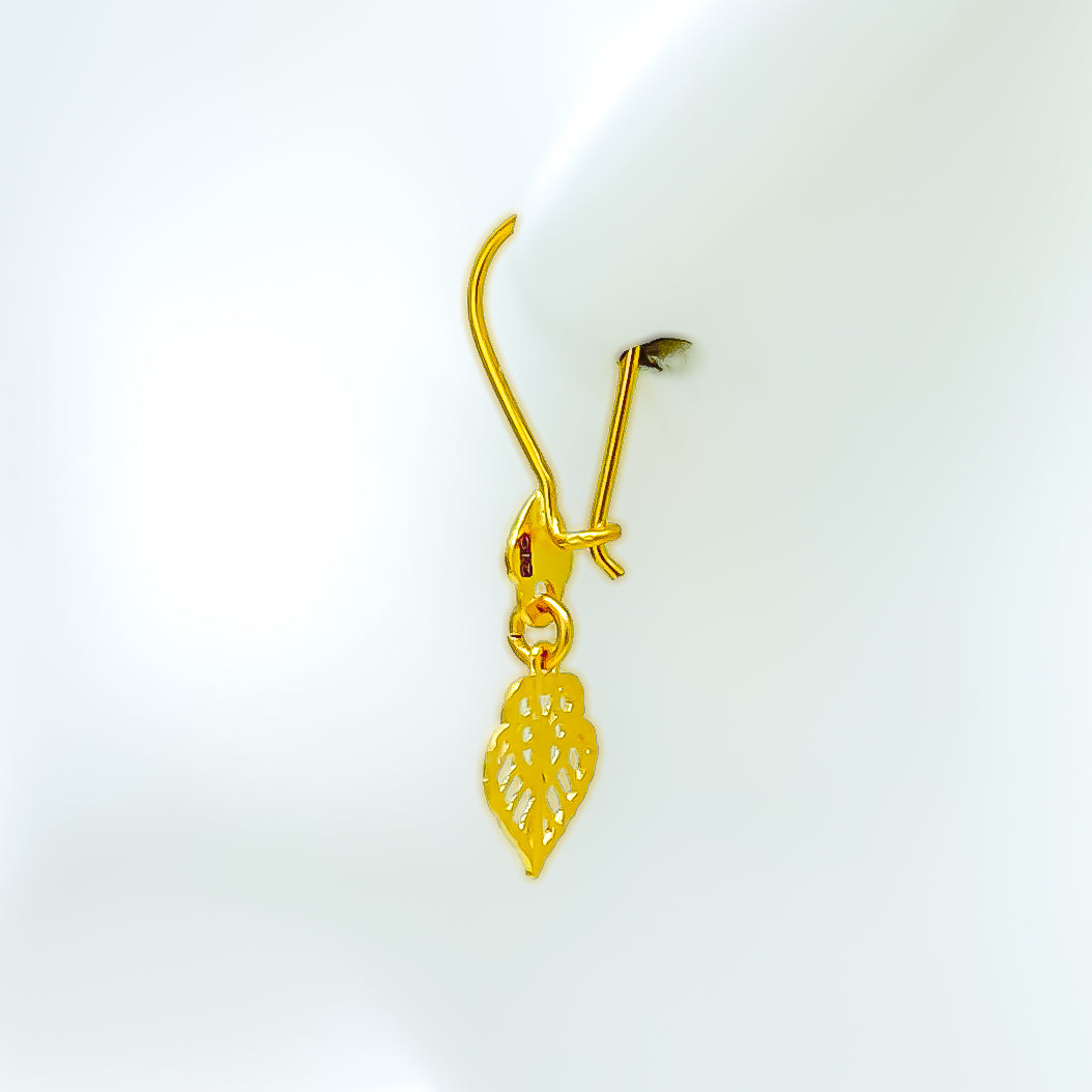 Delightful 21k yellow gold earrings weigh 1.6 grams, presenting charming hanging accents with warm radiant glow. The 1.25 inch length creates graceful movement and an elegant elongated silhouette along the neckline. Hook back posts allow easy comfortable wear while maintaining a secure balanced fit. Their delicate flowing design delivers timeless sophistication with gentle contemporary charm.