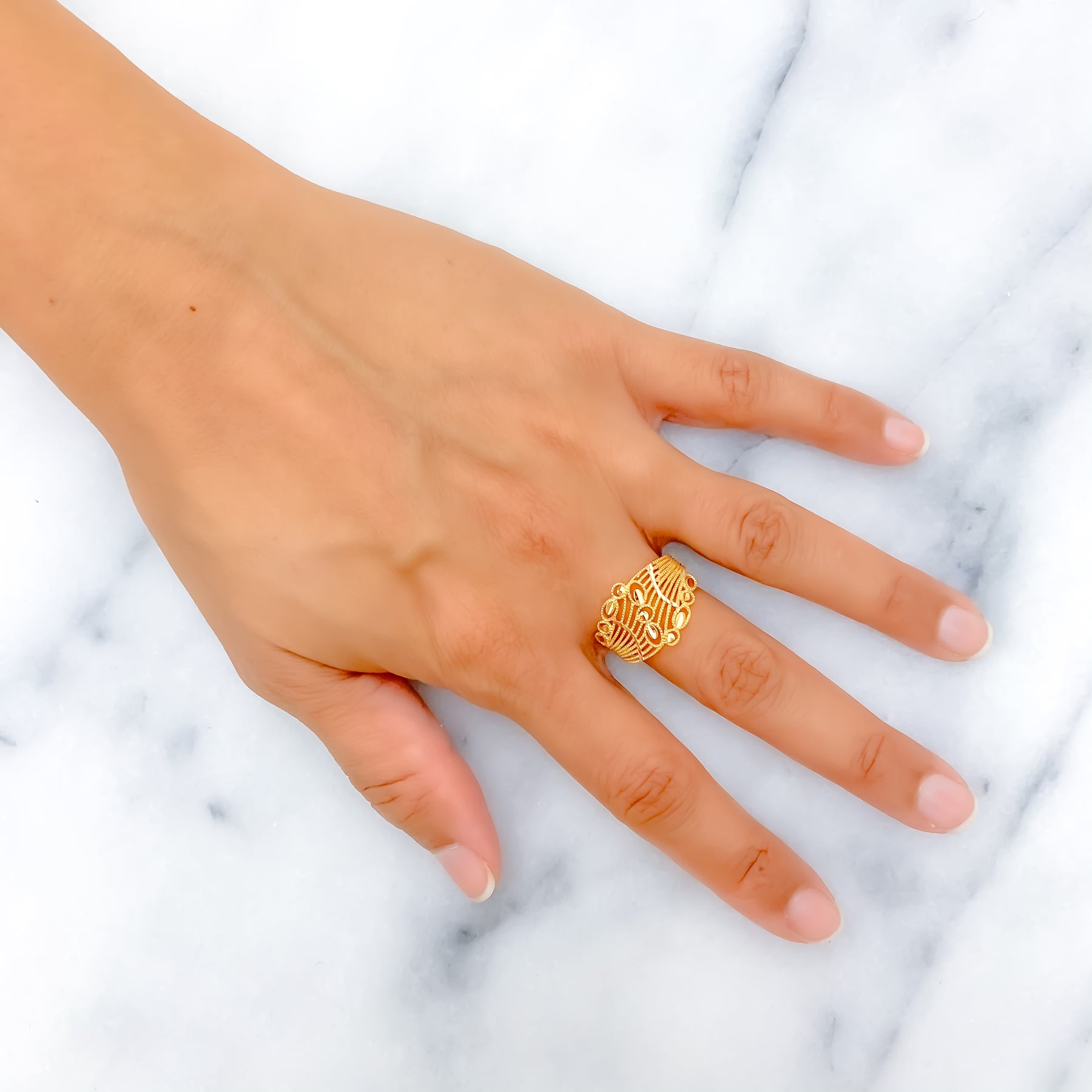 Gracefully designed, this polished 21k yellow-gold ring brings a refined charm with its radiant detailing. Its 3.3-gram weight offers a balanced feel, making it both striking and wearable for any occasion. Crafted in size 8.75, it can be resized for a flawless custom fit. A timeless, versatile piece that adds luminous elegance to every ensemble.