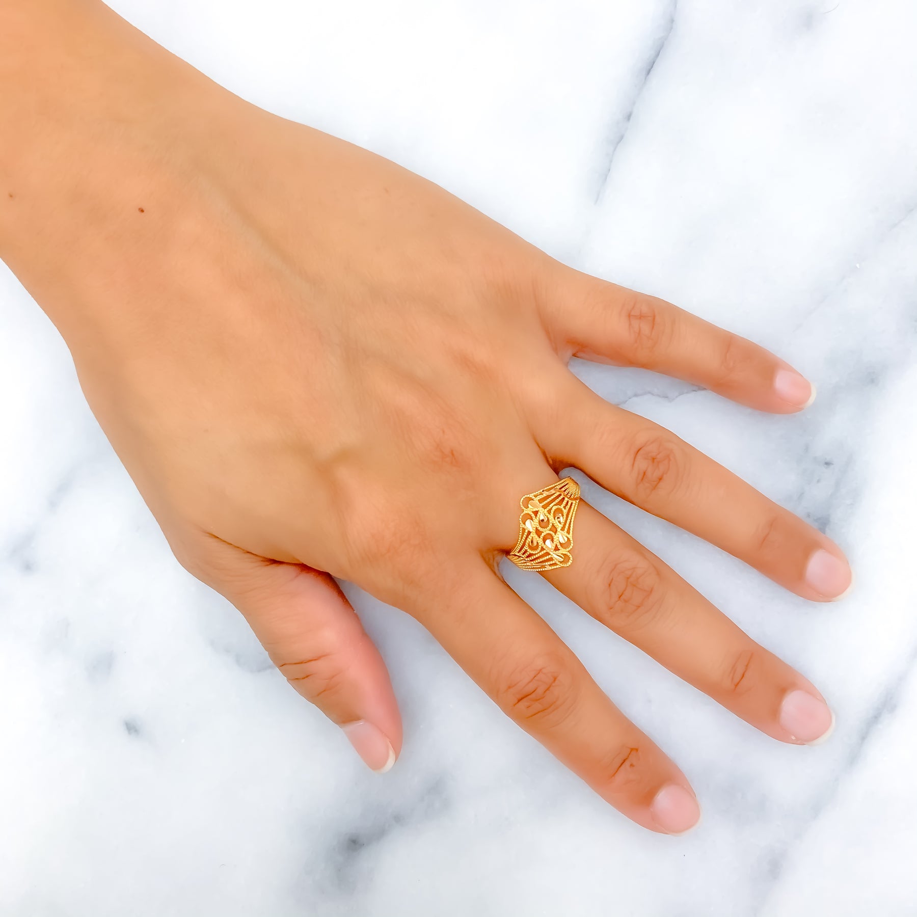 Showcasing a soft, luminous presence, this 21k yellow-gold ring delivers graceful radiance with its thoughtfully placed detailing. Its 2.4-gram weight provides an airy yet refined feel, complementing the elegant 8.75 size. Professional resizing is available for a custom, comfortable fit. A charming piece that blends delicate sparkle with timeless appeal.