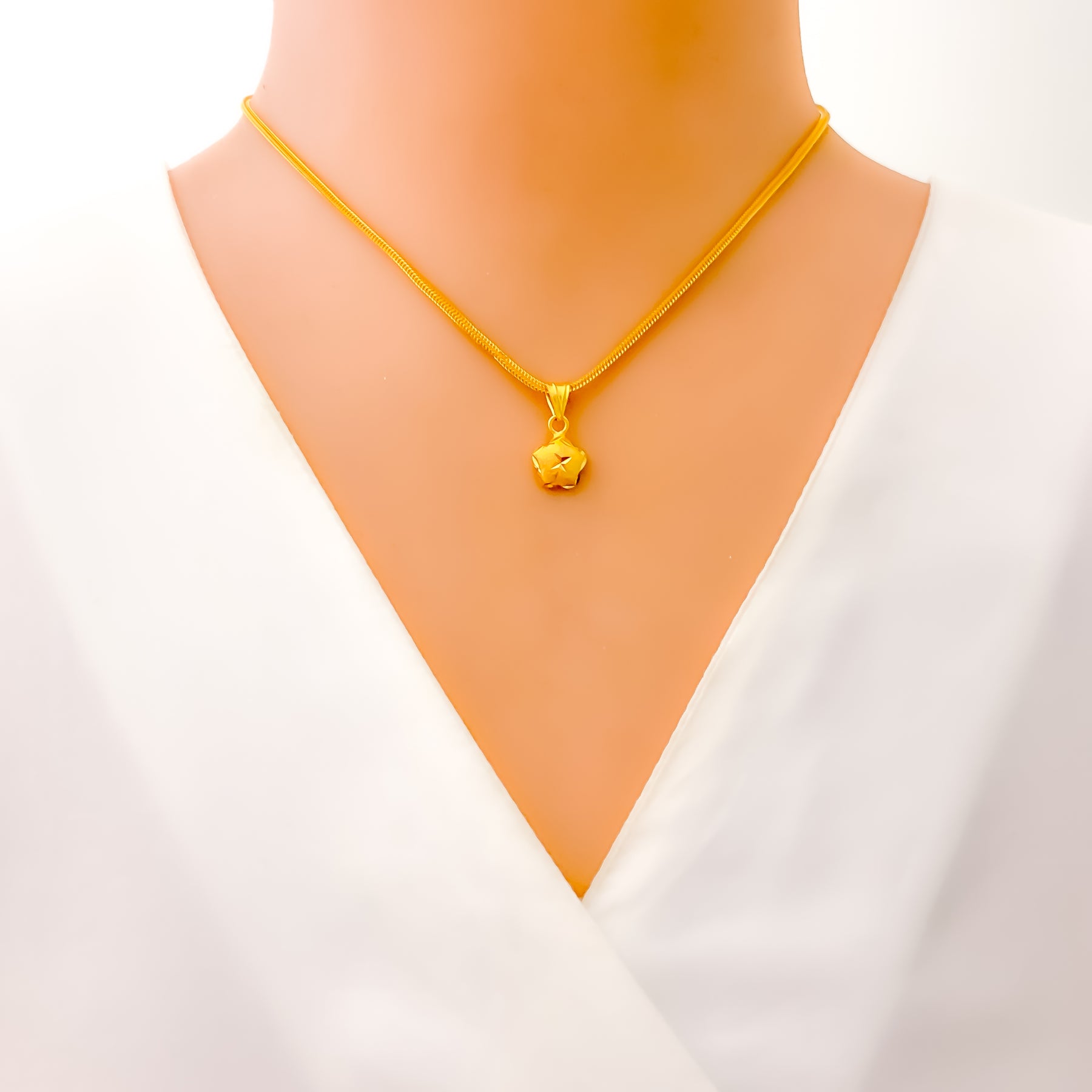 Thoughtfully crafted for refined elegance, this 22k yellow gold pendant set weighs 2.4 grams and features a 0.75" pendant with matching 0.2" push-back earrings. Its polished finish enhances the adorned detailing. A bespoke three-piece ensemble perfect for subtle glamour and everyday sophistication.