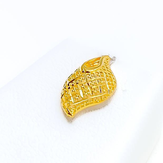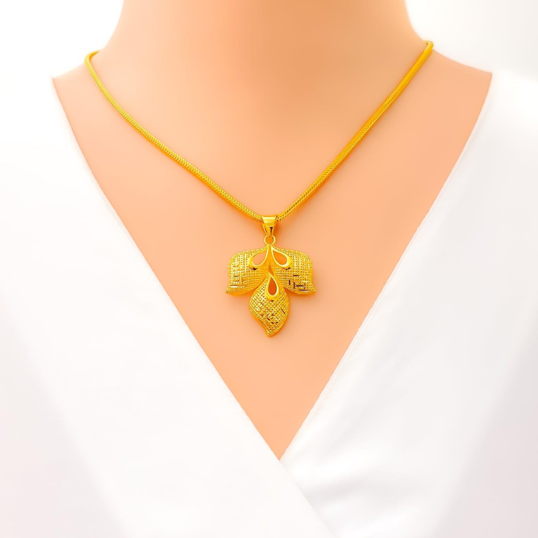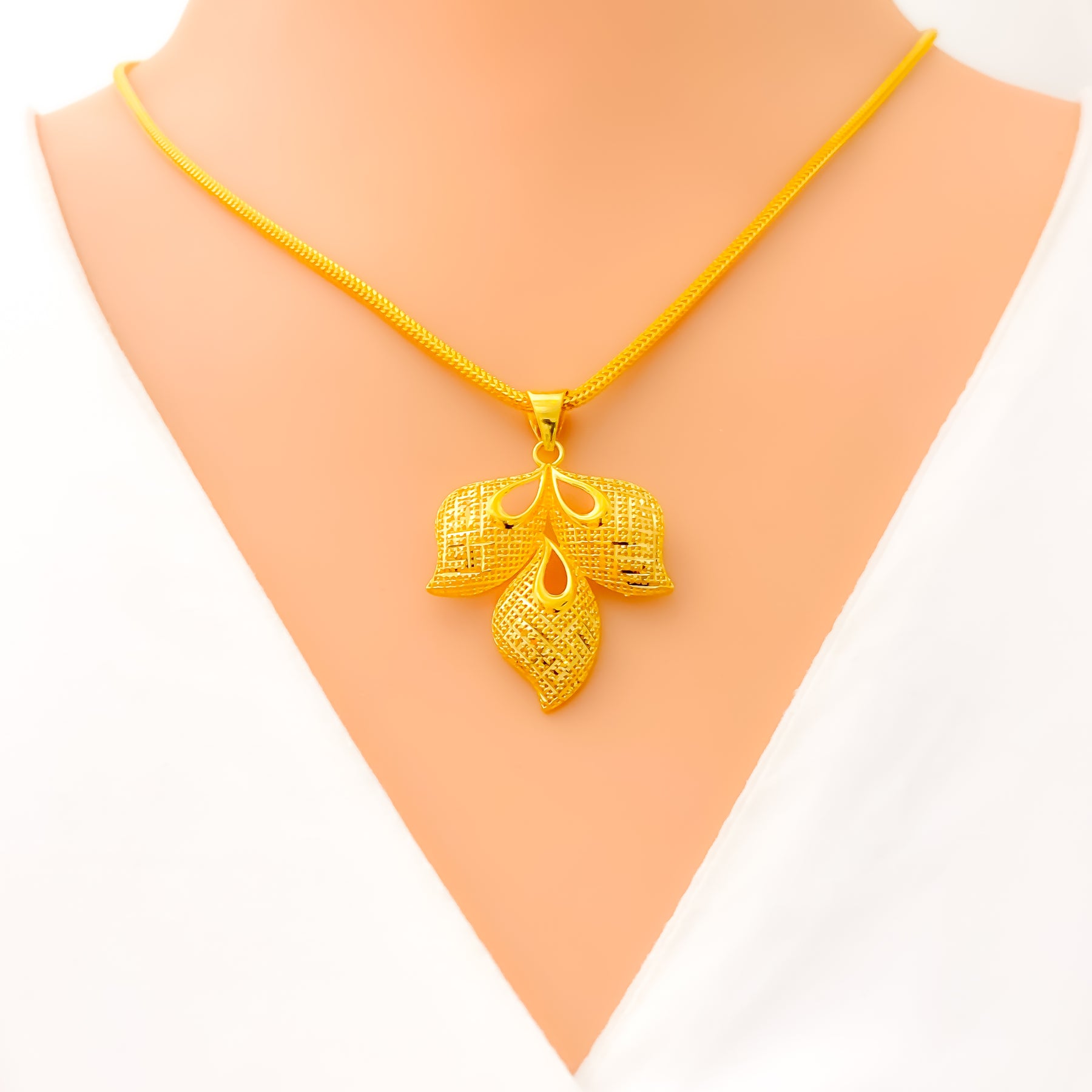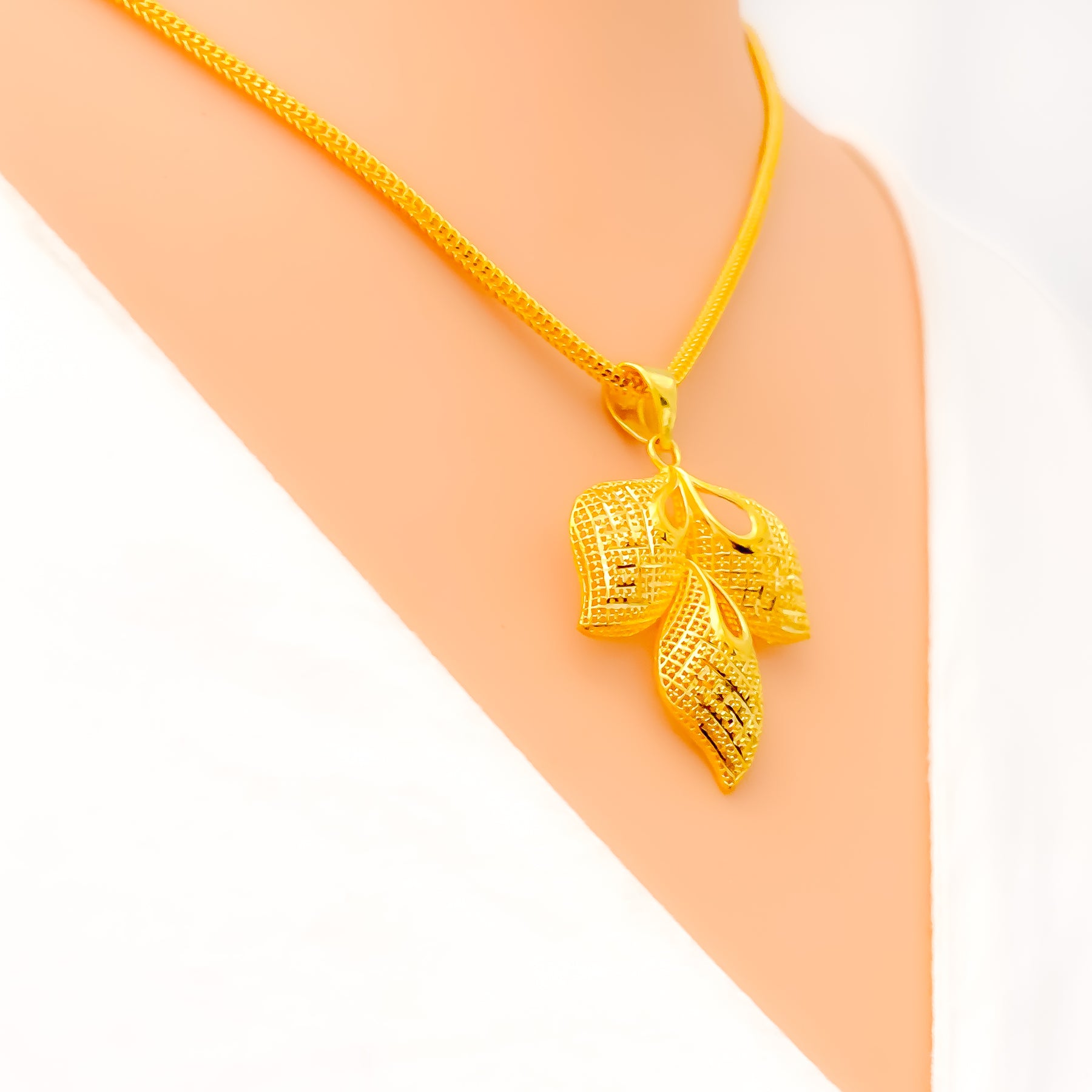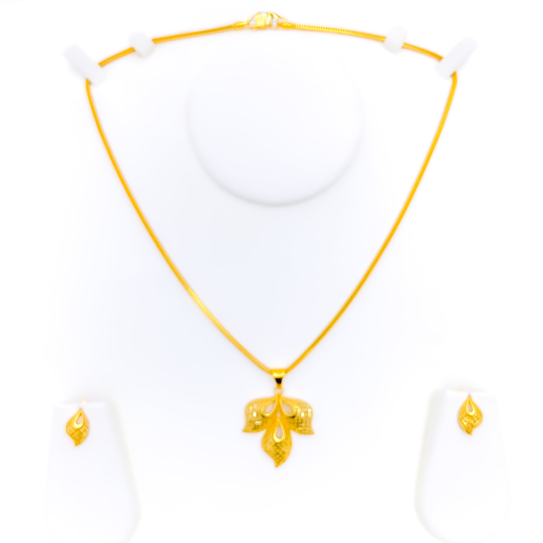 Vintage-inspired in character, this 22k yellow gold pendant set weighs 4.5 grams and features a polished finish that highlights its graceful leaf detailing. The pendant measures 1.6 inches in length and is paired with matching earrings measuring 0.6 inches for a harmonized, elegant look. Designed for comfort and security, the earrings feature classic push-back posts, and the complete set includes three pieces with the chain not included. Timeless yet wearable, this set offers refined charm suited for both cherished occasions and everyday sophistication.