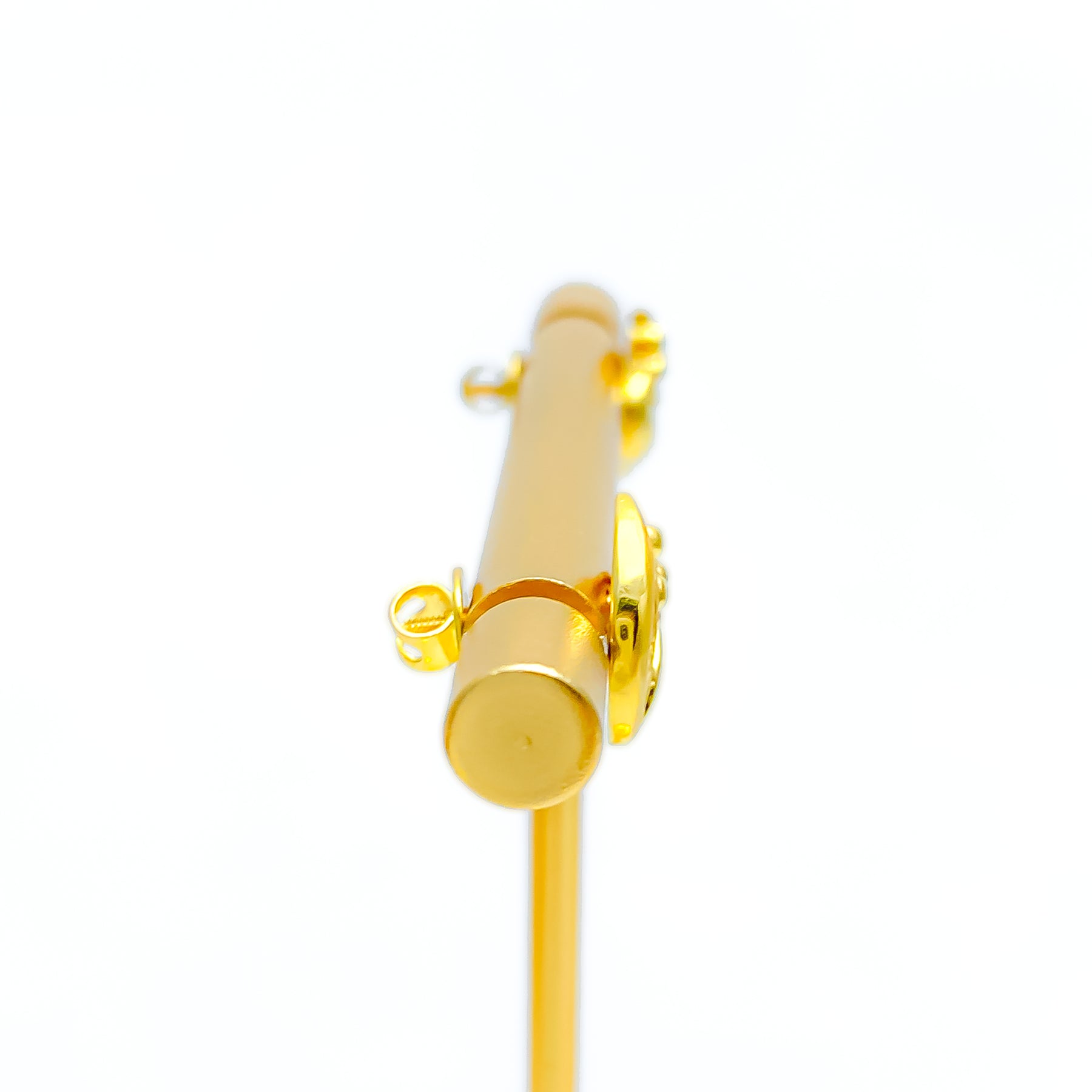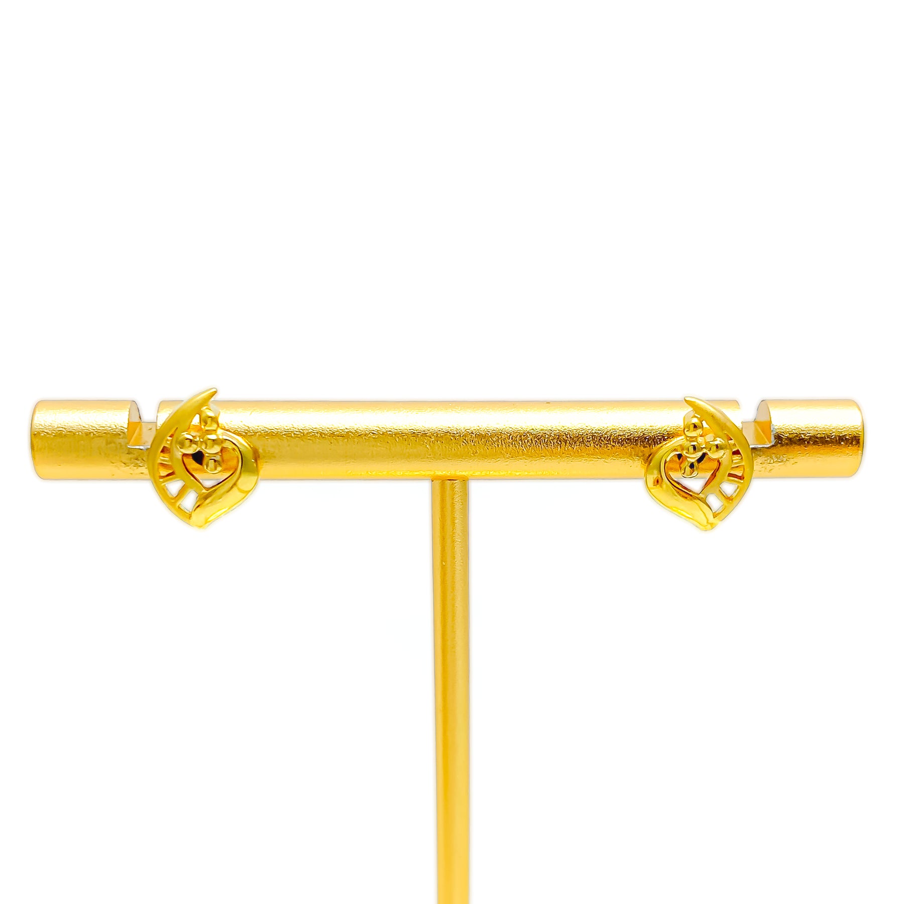 Playfully radiant, these 22k gold earrings bring a lively sparkle to any look with their sleek 0.3-inch design. Weighing 2.1 grams, the polished yellow gold finish enhances their vibrant glow. Their refined shape adds modern charm and versatility. A perfect accent for both casual and elegant ensembles.