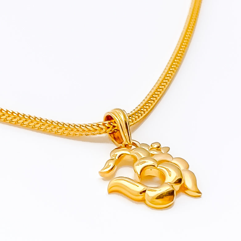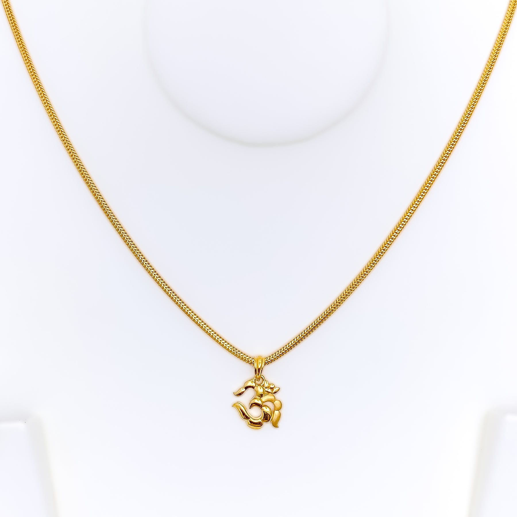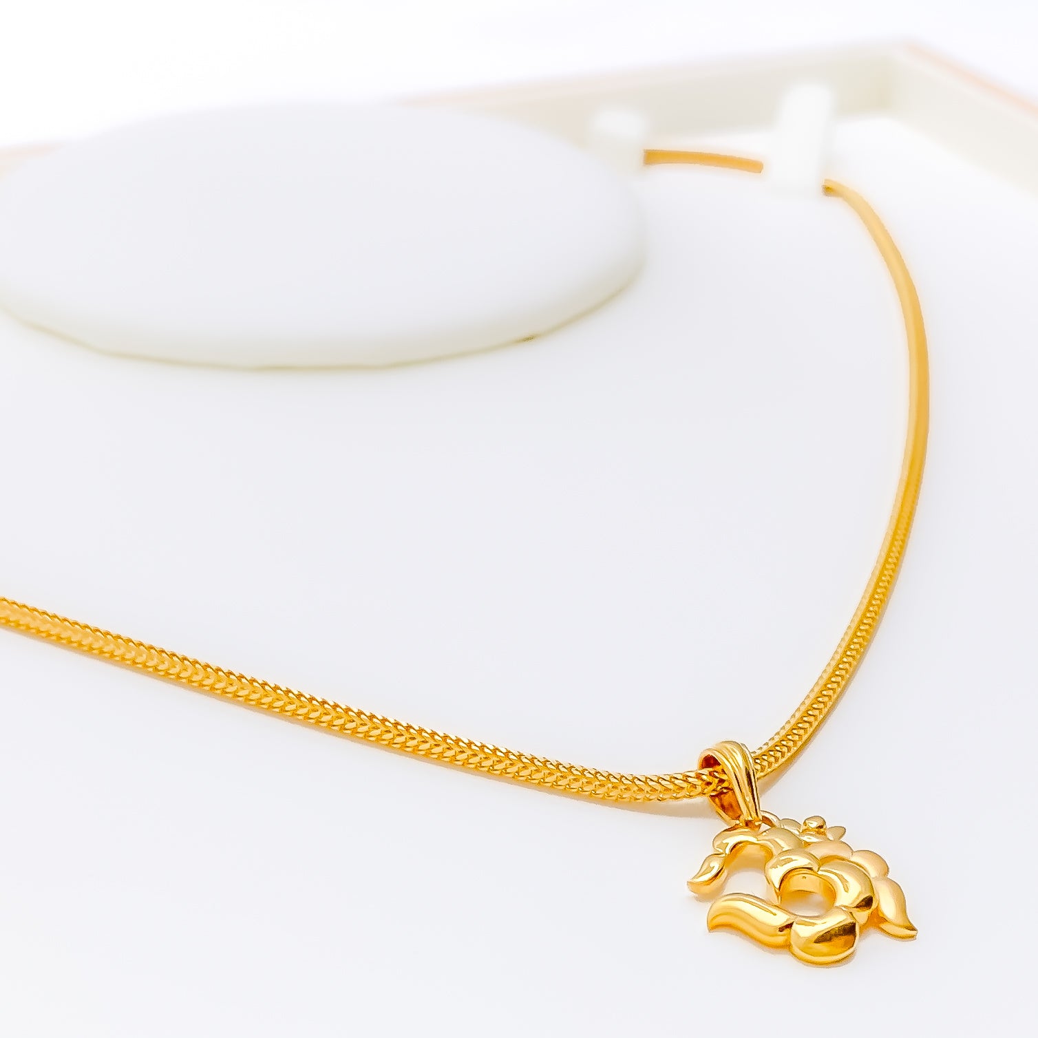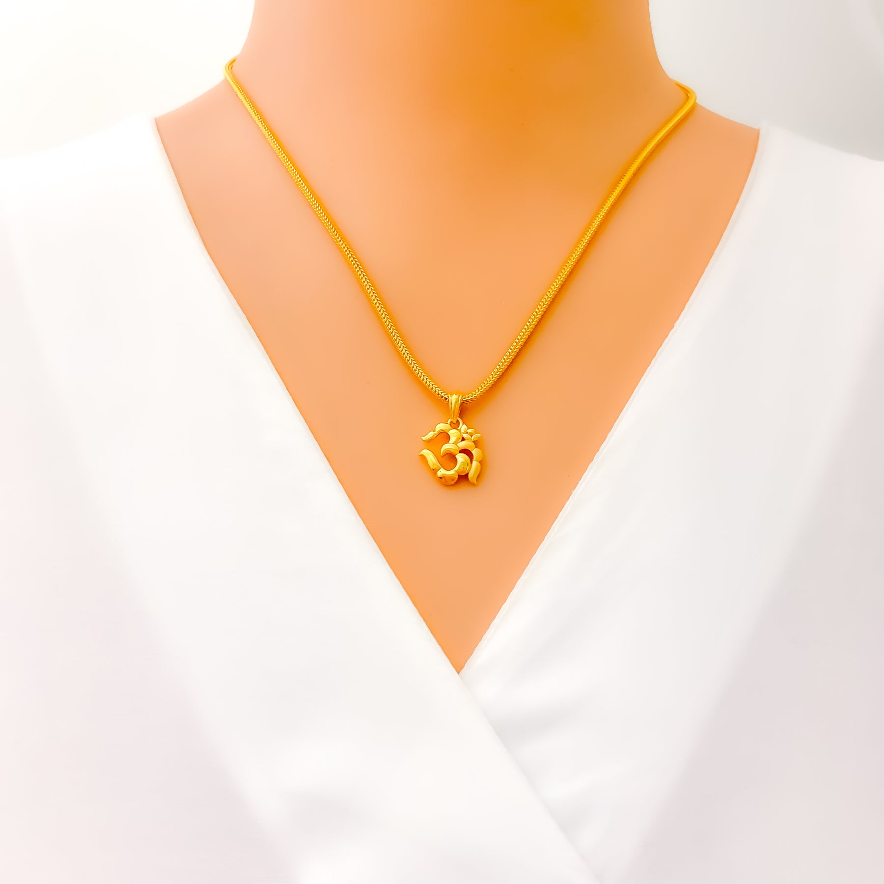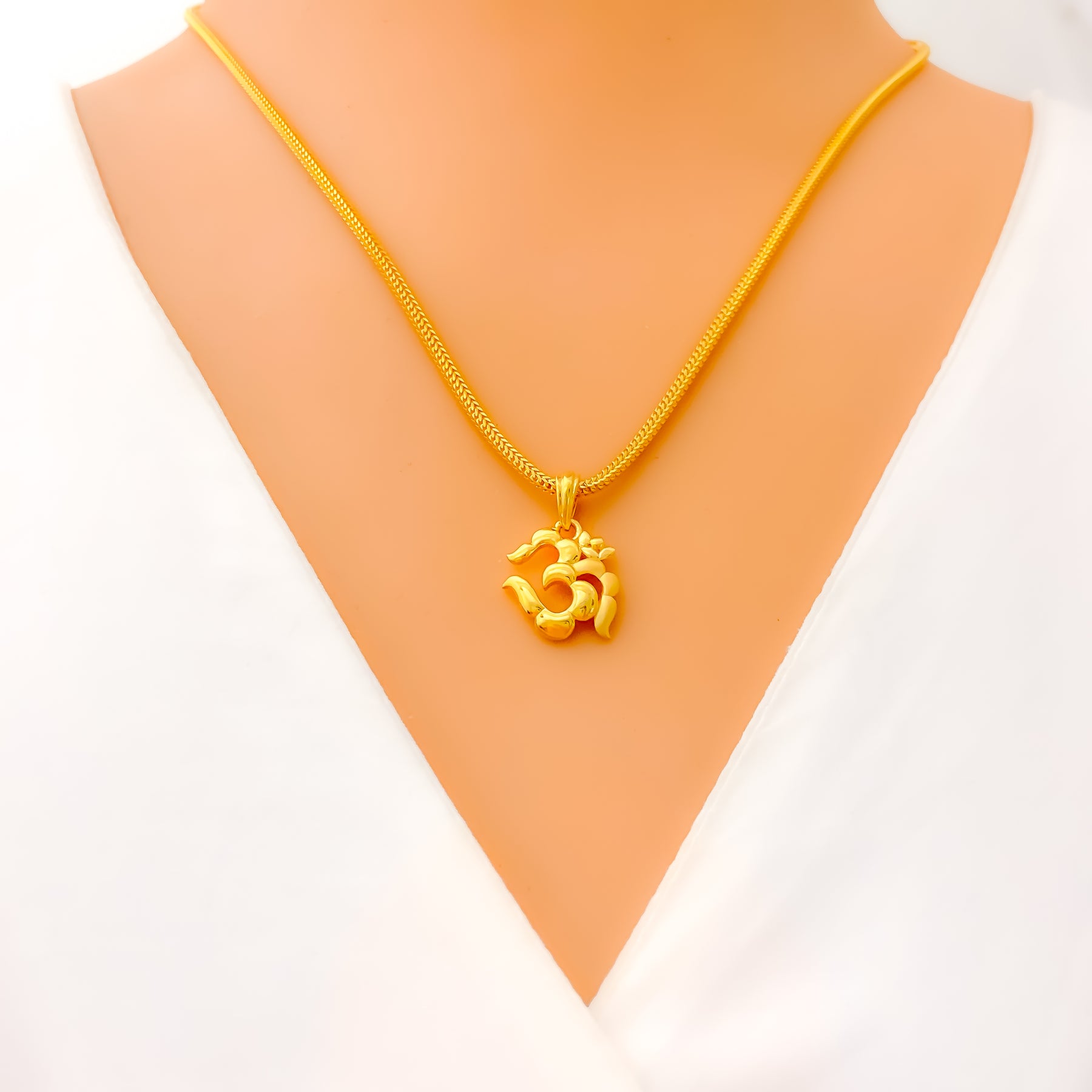 Radiantly styled in 22k yellow gold, this refined pendant weighs 2.1 grams and showcases a luminous polished finish. The sacred OM motif is elegantly defined within a compact 0.8 inch length. Designed without a chain, it allows versatile pairing with various necklaces. Fine detailing enhances its spiritual charm, creating a timeless piece with modern appeal.