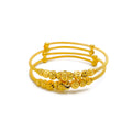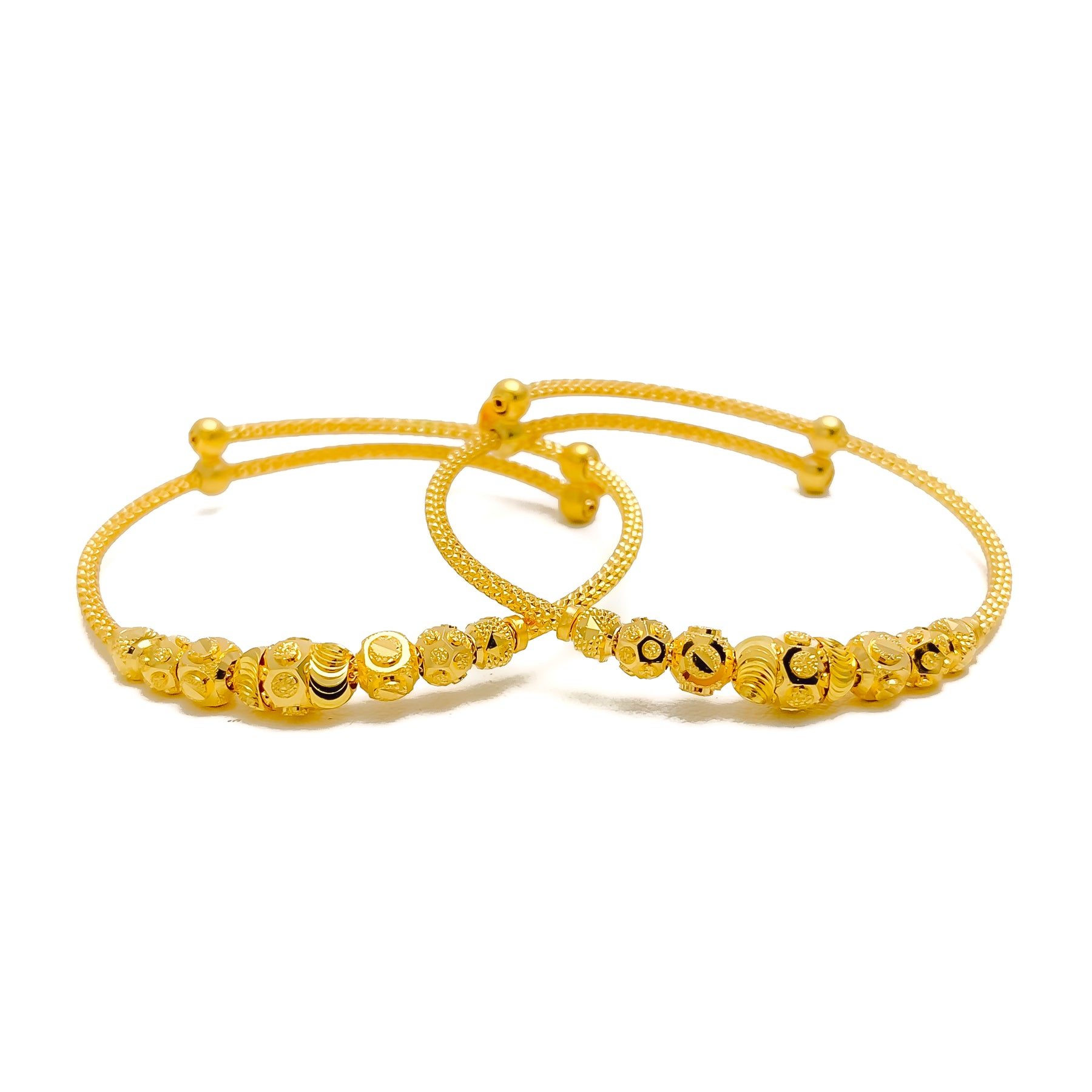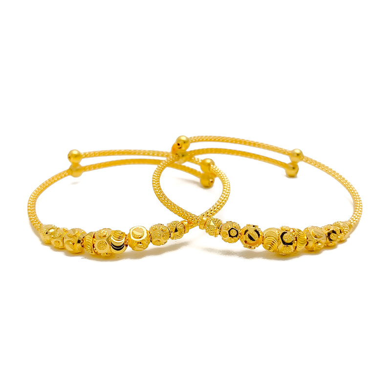 Beautifully crafted in 22k yellow gold and weighing 10.3 grams, this pair of adjustable baby bangles features a 1.75-inch diameter, designed to grow gently with little wrists. The polished finish delivers a warm, radiant glow, while the sleek design offers a modern yet timeless appeal. Perfect as a thoughtful gift or heirloom keepsake, these bangles blend classic elegance with everyday practicality, making them a graceful way to celebrate precious early milestones with refined charm.