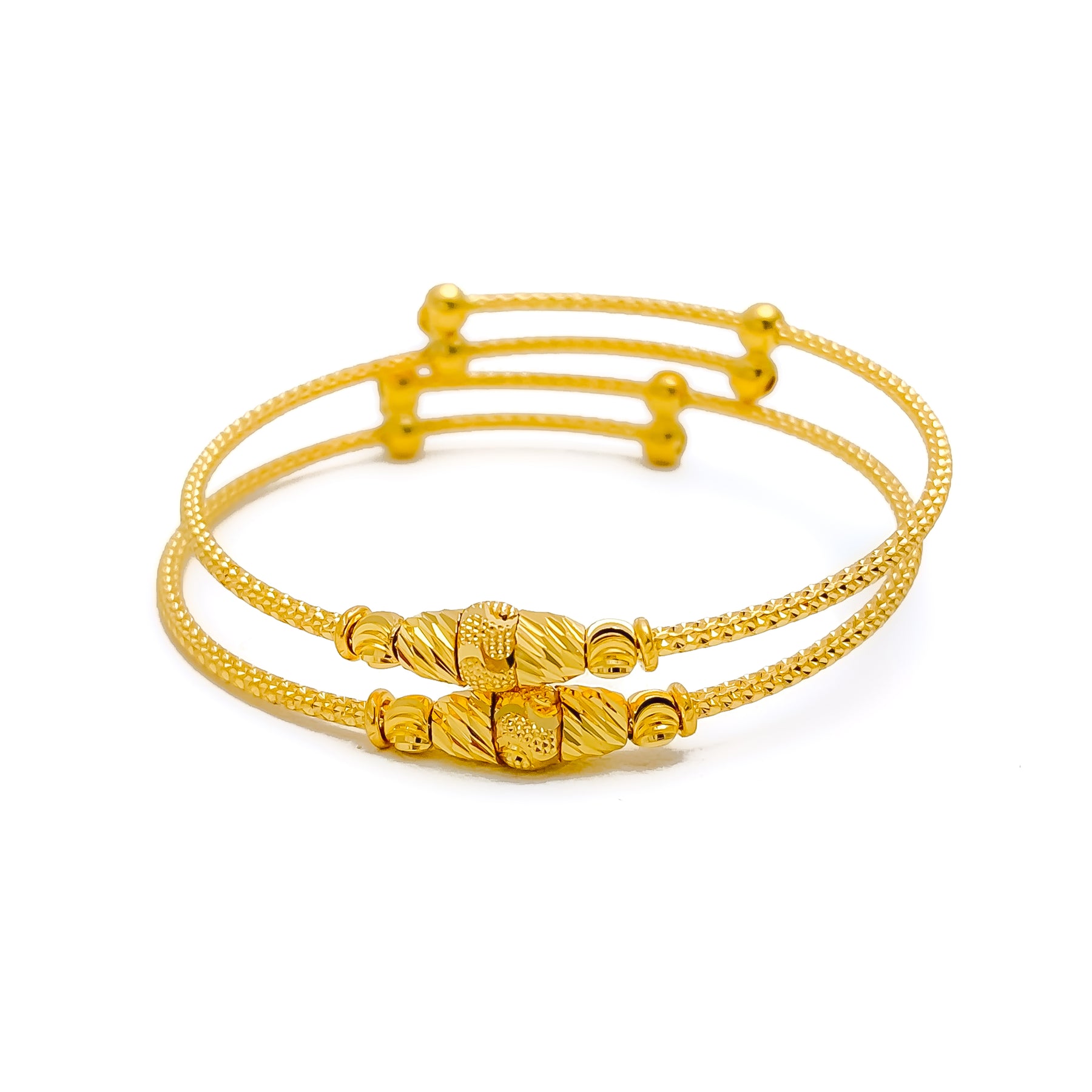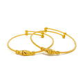 Crafted in radiant 22k yellow gold and weighing 8.3 grams, this pair of baby bangles features a 1.8-inch diameter with an adjustable fit, ensuring comfort as little wrists grow. The polished finish offers a soft, luminous sheen, while the design maintains a delicate balance of charm and elegance. Perfect as a thoughtful gift or lasting keepsake, these bangles blend timeless style with gentle practicality, making them a graceful and meaningful addition to any early jewelry collection.