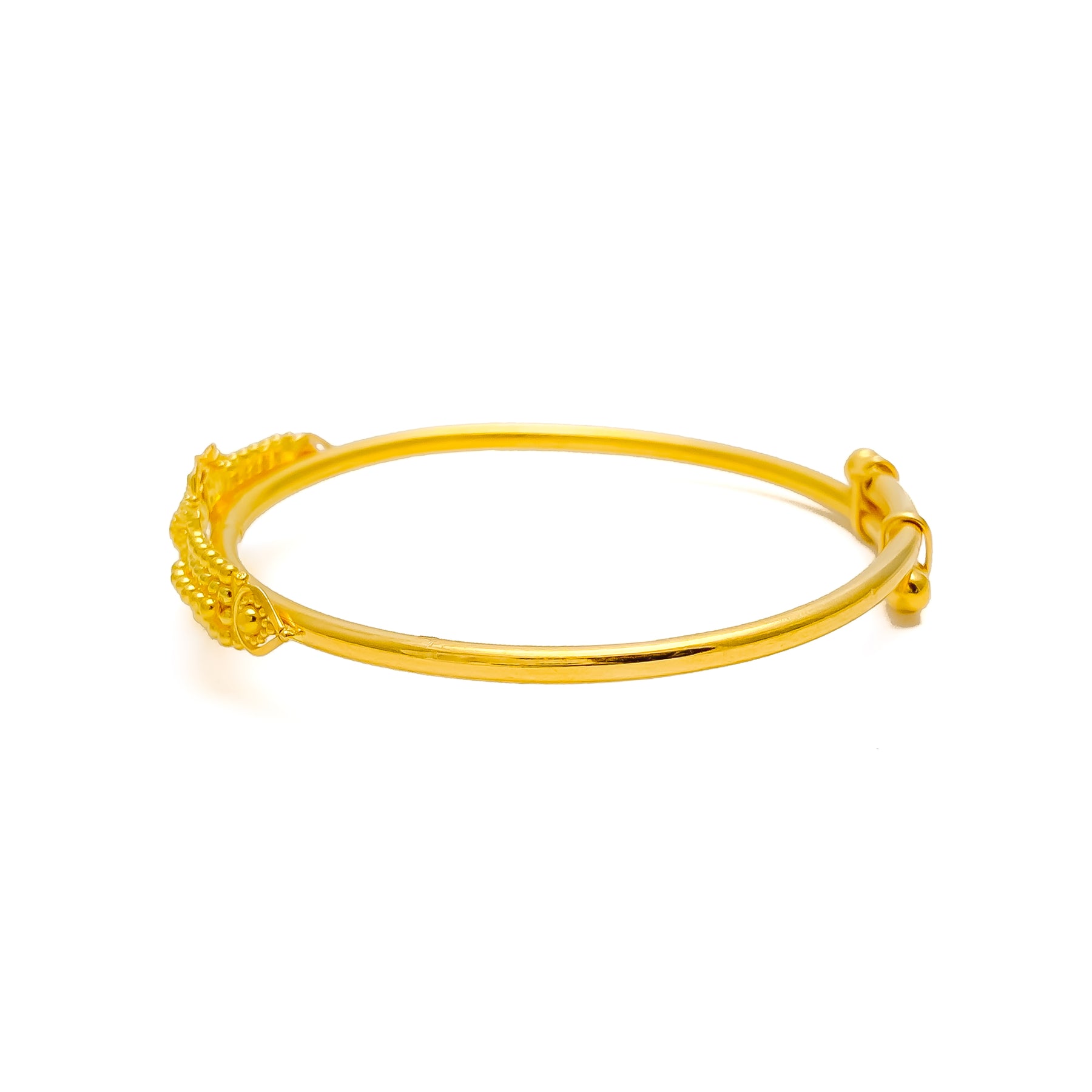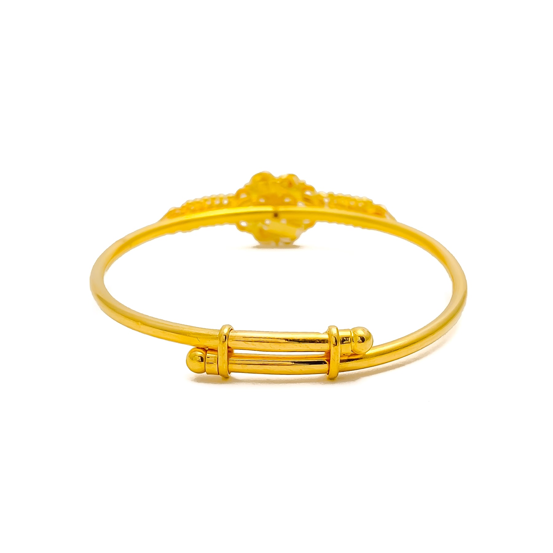 Infused with youthful brilliance, this 22k gold baby bangle captures attention with its vibrant finish and elegant detailing. Weighing 6.8 grams and crafted at a 1.8" diameter, the adjustable design grows with your little one. A striking piece that blends tradition with charm.