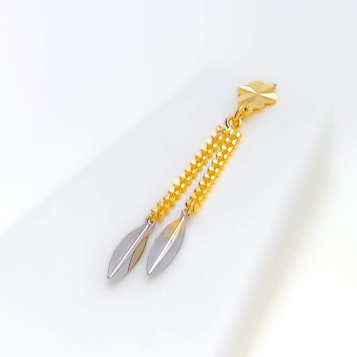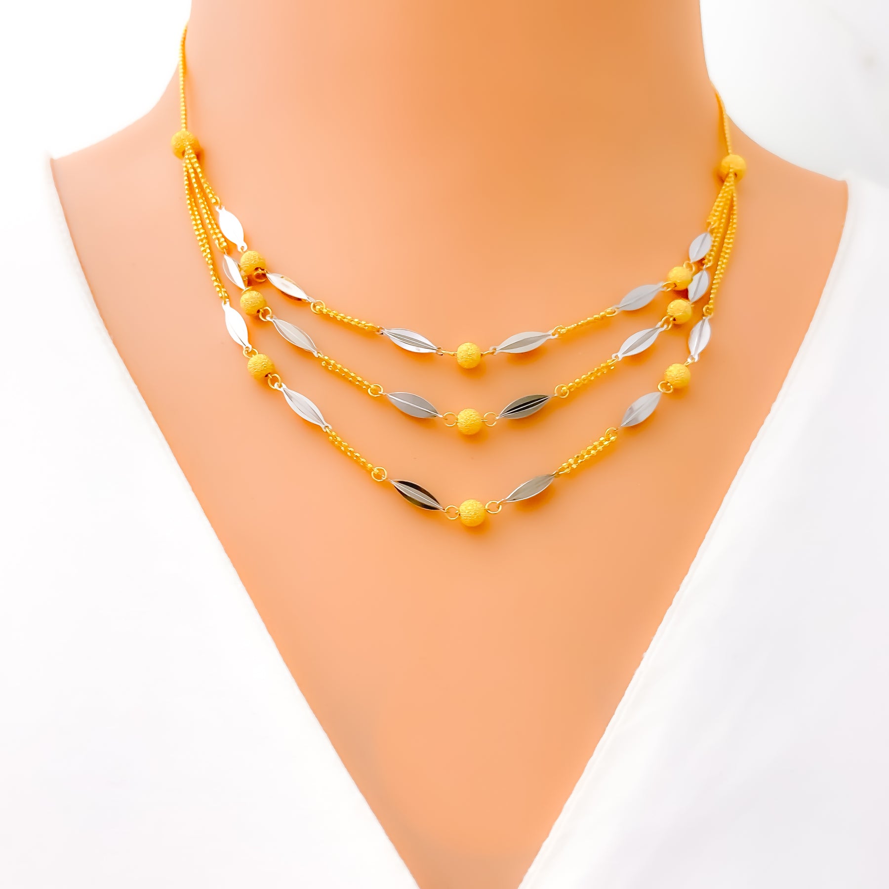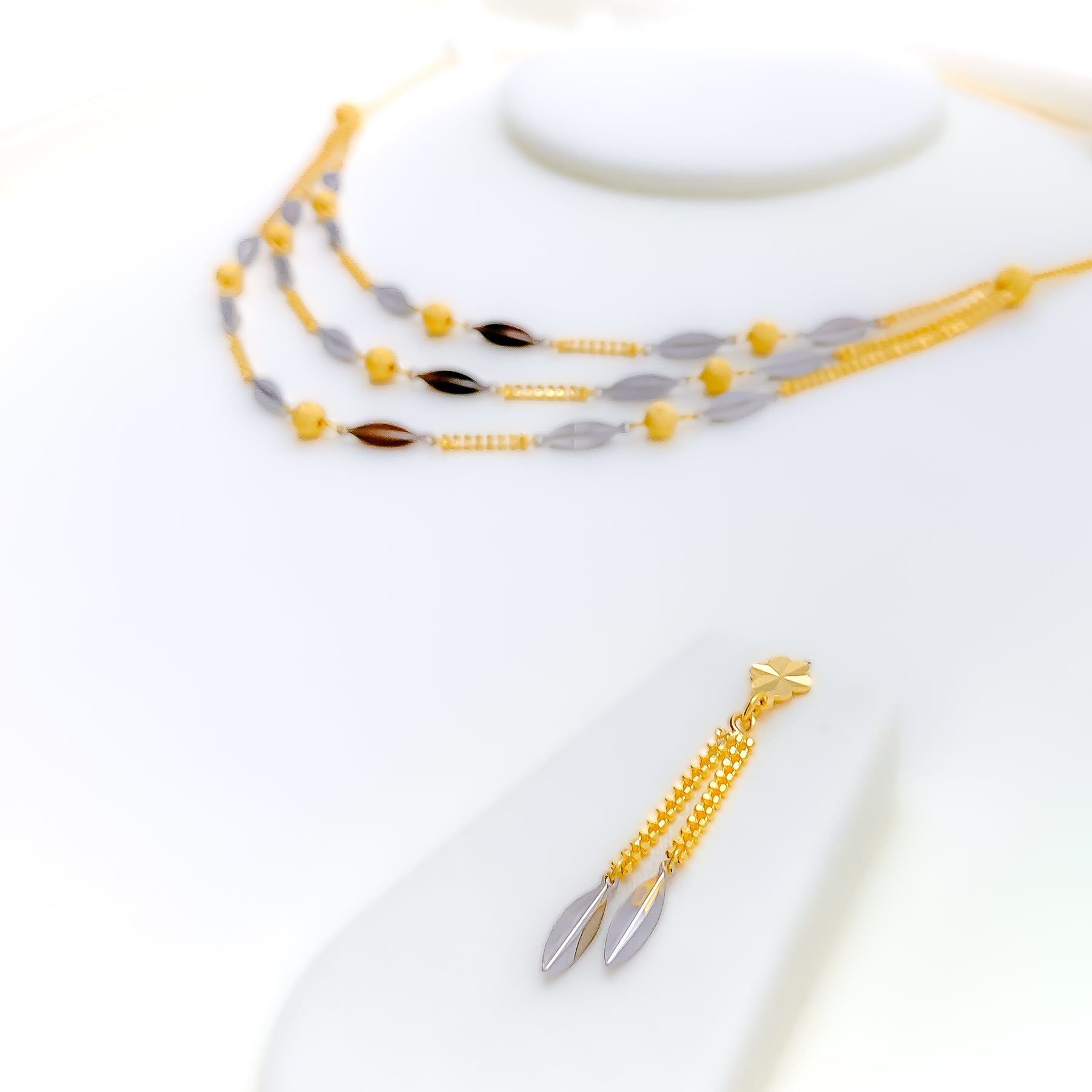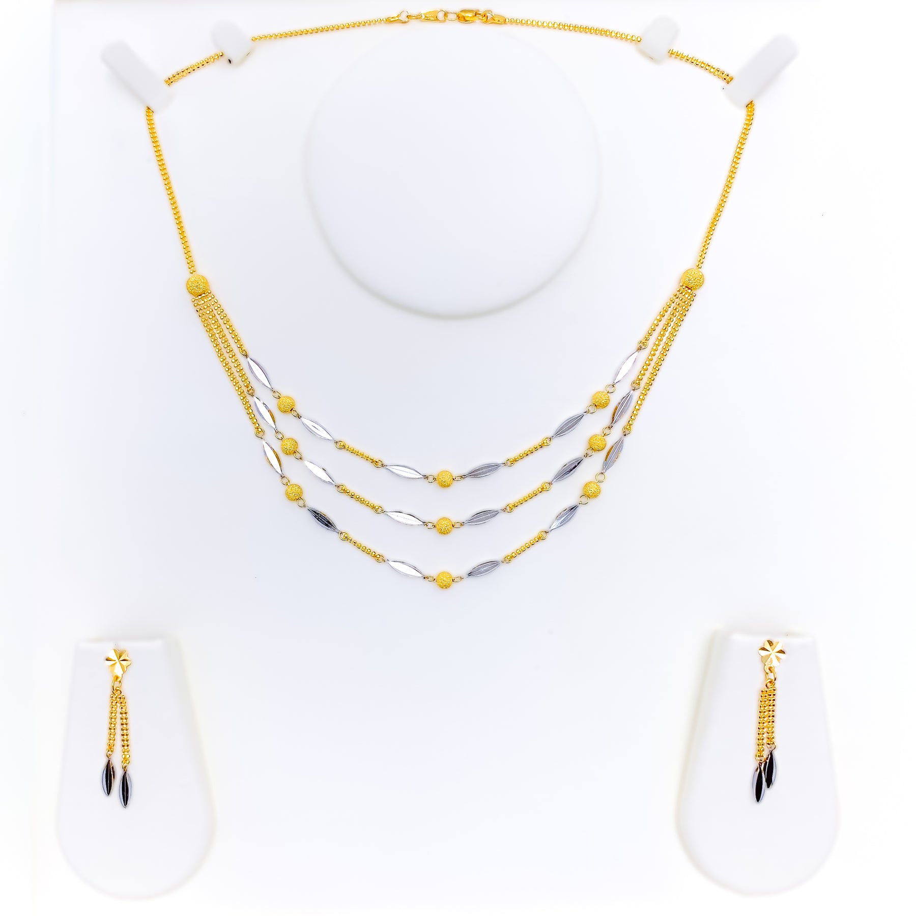 Harmoniously styled, this 22k gold necklace set weighs 13.6 grams and features alternating leaf detailing with a polished blend of yellow and white gold tones. The layered necklace is designed with a first row length of 16 inches and a last row length of 17 inches, creating a graceful, balanced drape along the neckline. Secured with a reliable lobster lock, the set includes matching earrings measuring 1.5 inches, finished with comfortable push-back posts. Elegant and visually distinctive, this set offers timeless sophistication suited for refined daily wear and special occasions alike.
