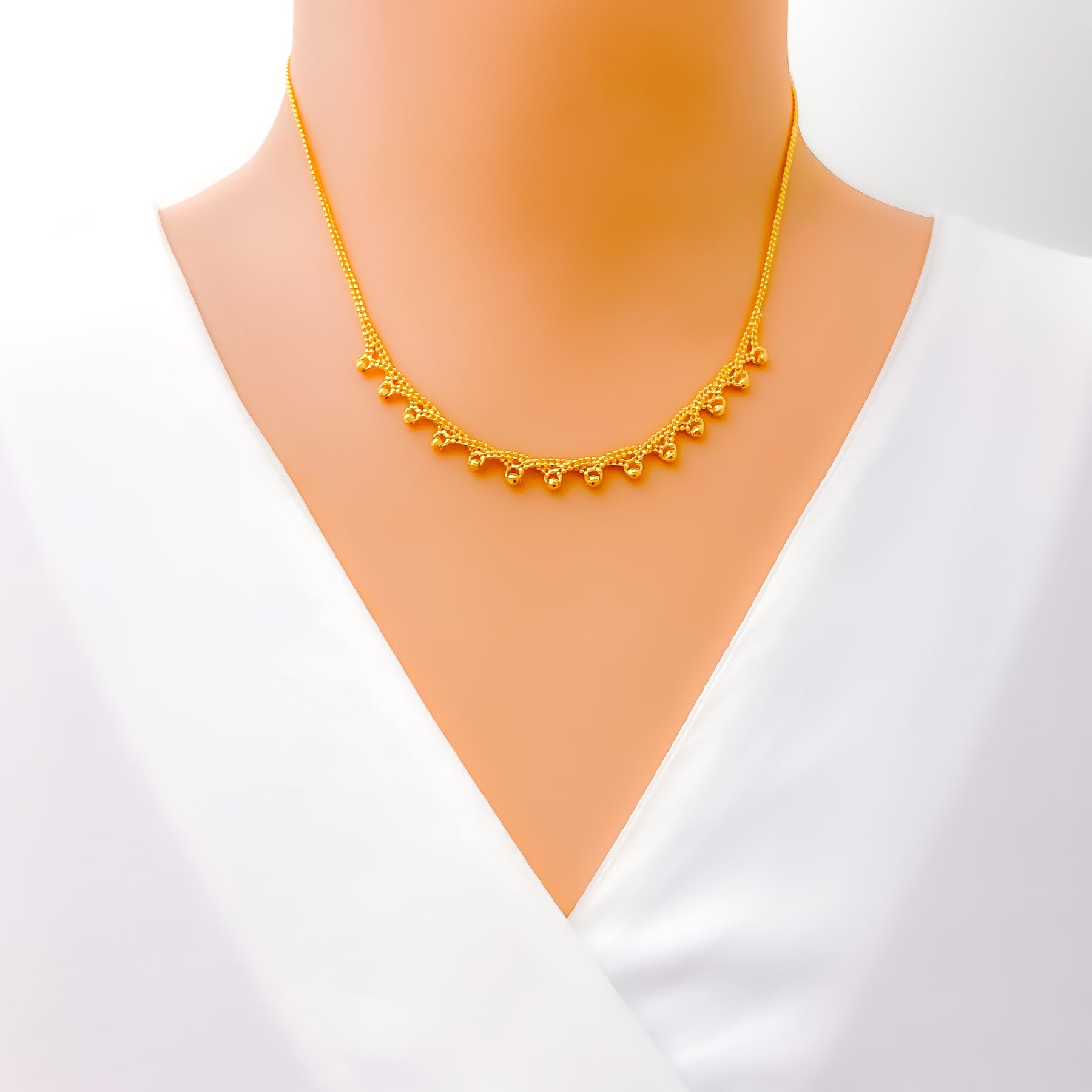 Intricately styled, this 22k yellow gold necklace set weighs 9.3 grams and features detailed beadwork finished with a smooth, radiant polish for refined visual depth. The necklace measures 16 inches in length, resting gracefully along the neckline with a balanced and elegant profile. Secured with a dependable lobster lock, the set includes matching earrings measuring 1.5 inches, designed with comfortable push-back posts. Artful yet timeless, this set delivers classic sophistication ideal for special occasions and elevated everyday wear.