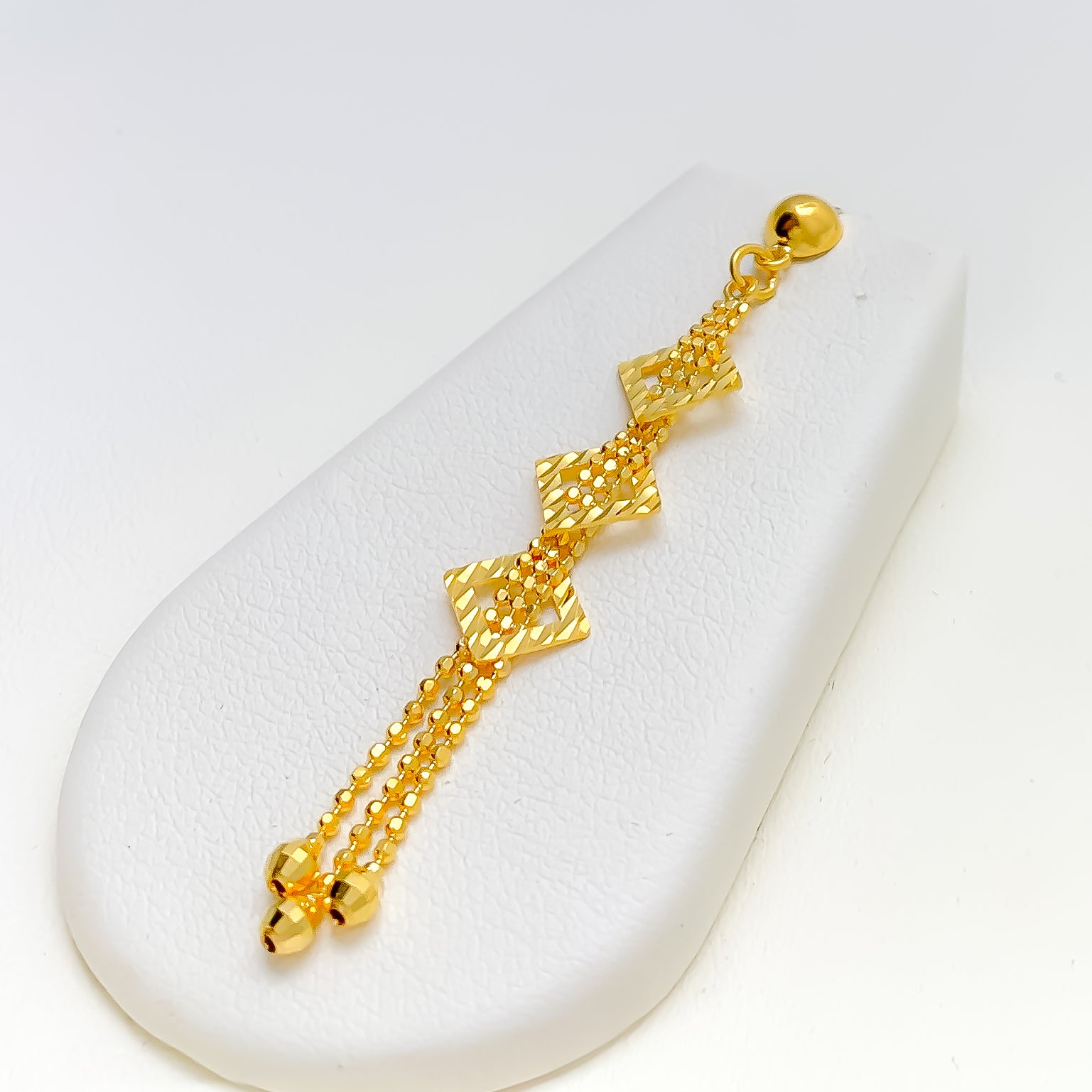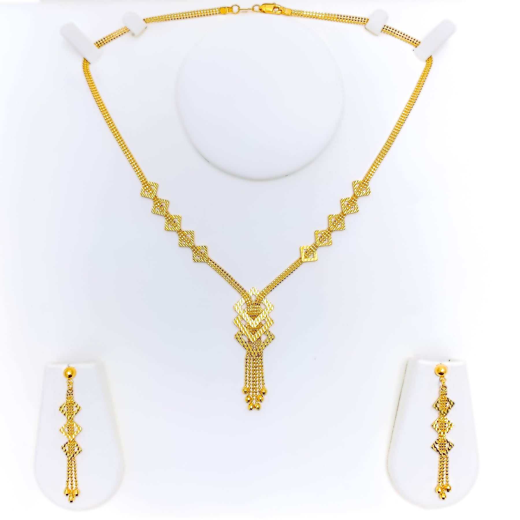 Opulently styled, this 22k yellow gold necklace set weighs 16.3 grams and features a smooth, high-polish finish that amplifies its brilliant, dressy appeal. The necklace measures 16 inches in length and is accented with a striking 2-inch drop, creating a graceful focal point along the neckline. Secured with a dependable lobster lock, the set includes matching earrings measuring 2.25 inches, crafted with comfortable push-back posts. Bold yet refined, this set delivers timeless sophistication ideal for statement occasions and elevated formal wear.