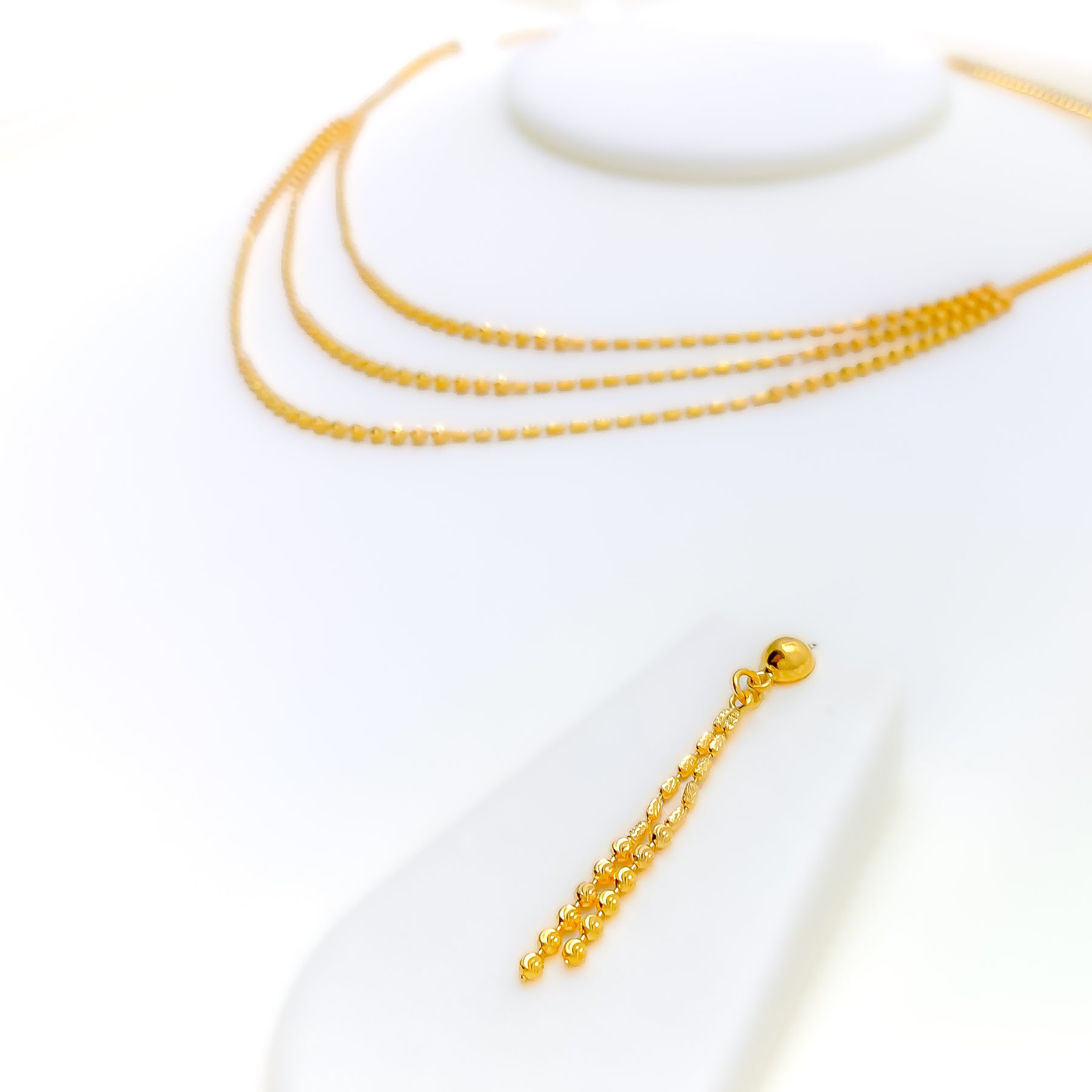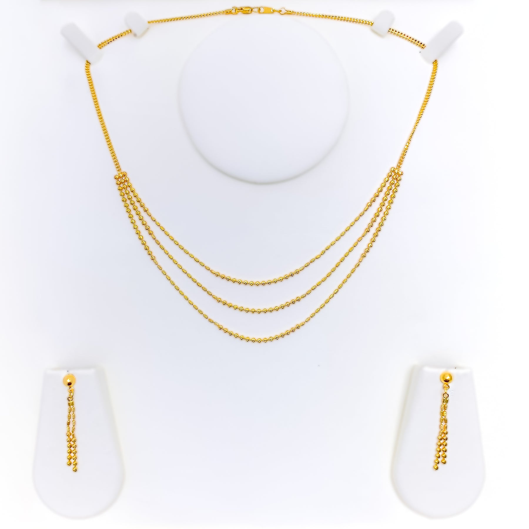 Freshly inspired, this 22k yellow gold beaded necklace set weighs 12.4 grams and features a smooth polished finish that highlights its evergreen, refined character. The layered necklace is styled with a first row length of 16 inches and a last row length of 17 inches, creating a graceful, balanced drape along the neckline. Secured with a dependable lobster lock, the set includes matching earrings measuring 1.6 inches, finished with comfortable push-back posts. Timeless yet versatile, this set delivers elegant charm suited for both elevated everyday wear and special occasions.