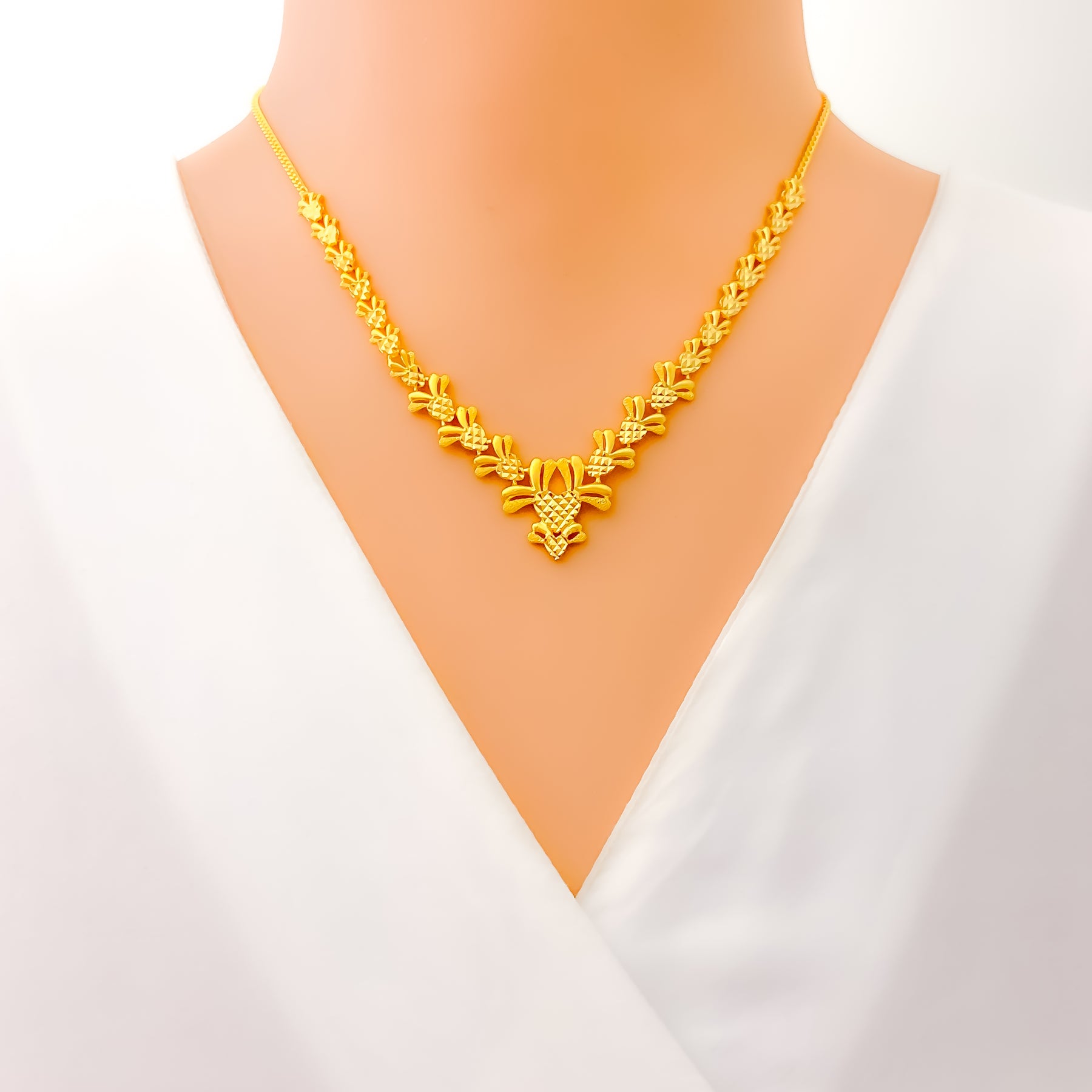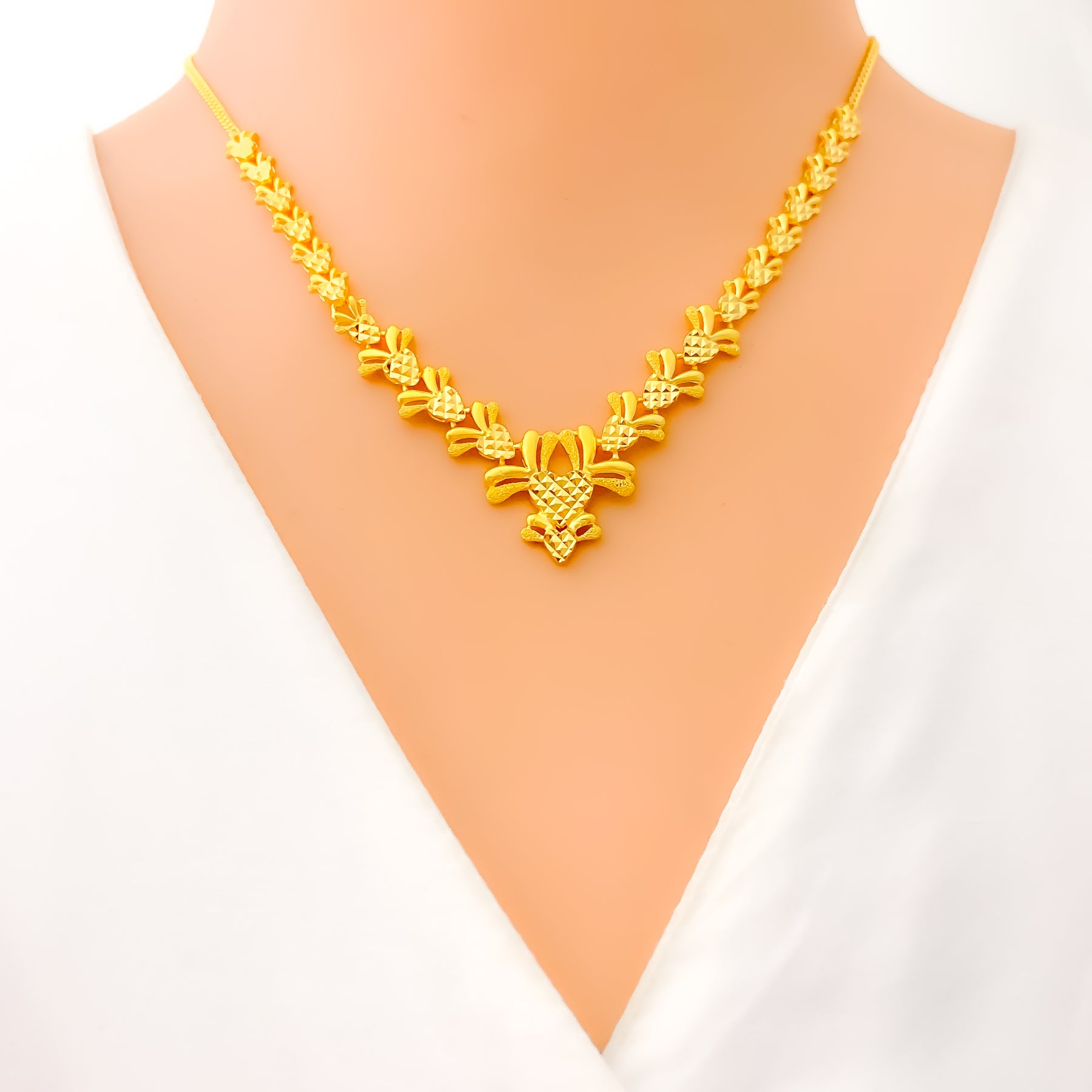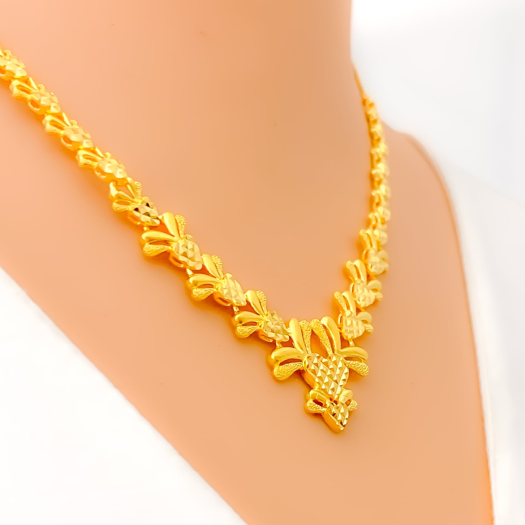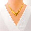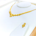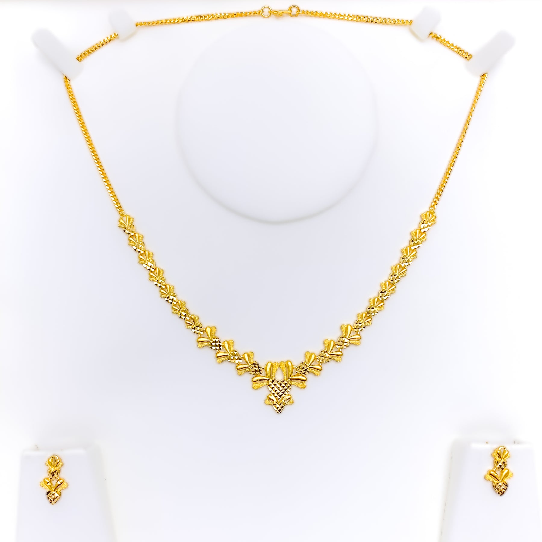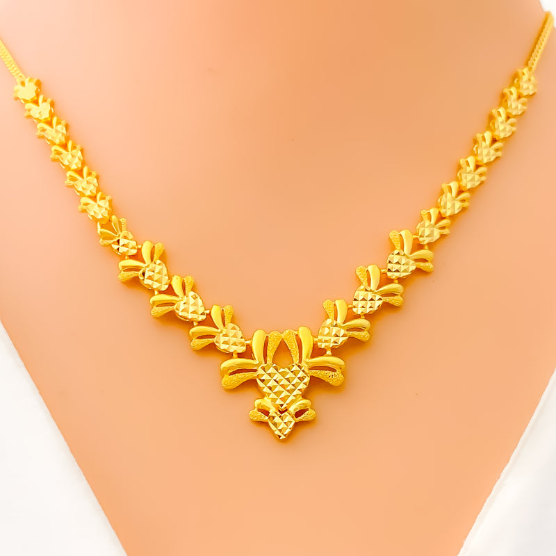 Crafted in radiant 22k yellow gold and weighing 17.2 grams, this necklace set features a delightful fusion of floral and heart motifs, brought to life with a dazzling polished finish. The 16-inch necklace sits elegantly on the neckline and secures with a traditional S lock for reliable wear. Matching 0.7-inch earrings with push-back posts mirror the design’s romantic elegance. A charming blend of sentiment and sophistication, this set is perfect for special occasions and graceful everyday adornment.