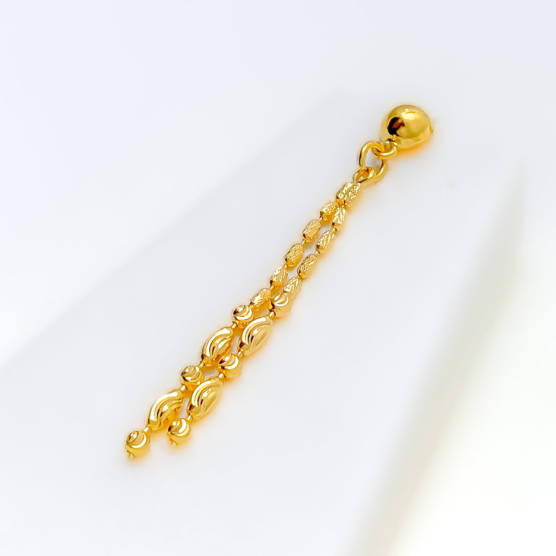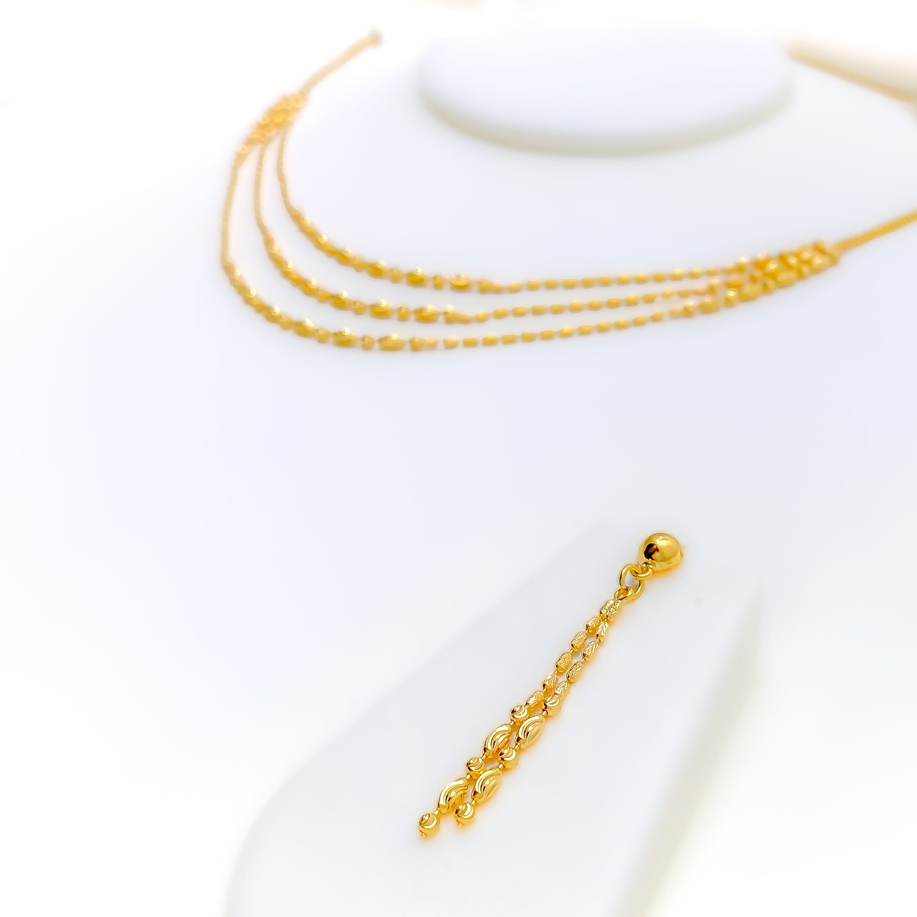 Gracefully detailed, this 22k yellow gold necklace set weighs 11.7 grams and features fine beaded craftsmanship enhanced by a smooth, polished finish for refined visual texture. The layered necklace is designed with a first row length of 16 inches and a last row length of 17 inches, creating a balanced, elegant drape along the neckline. Secured with a dependable lobster lock, the set includes matching earrings measuring 1.7 inches, finished with comfortable push-back posts. Delicate yet distinctive, this set offers timeless sophistication ideal for special occasions and elevated everyday wear.