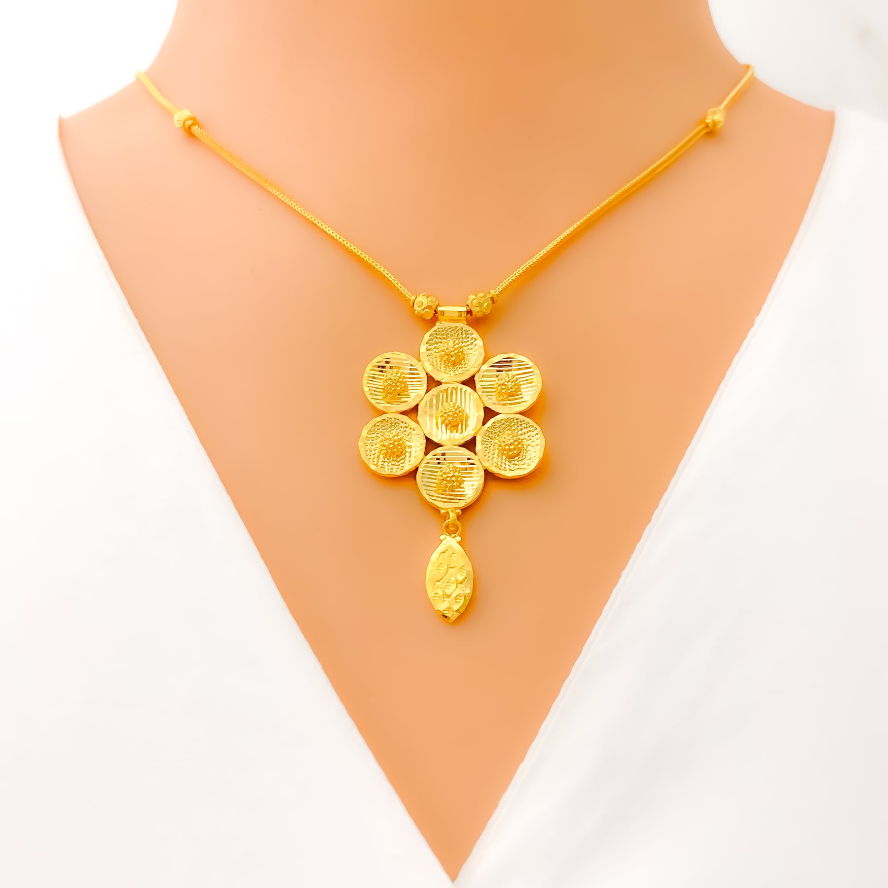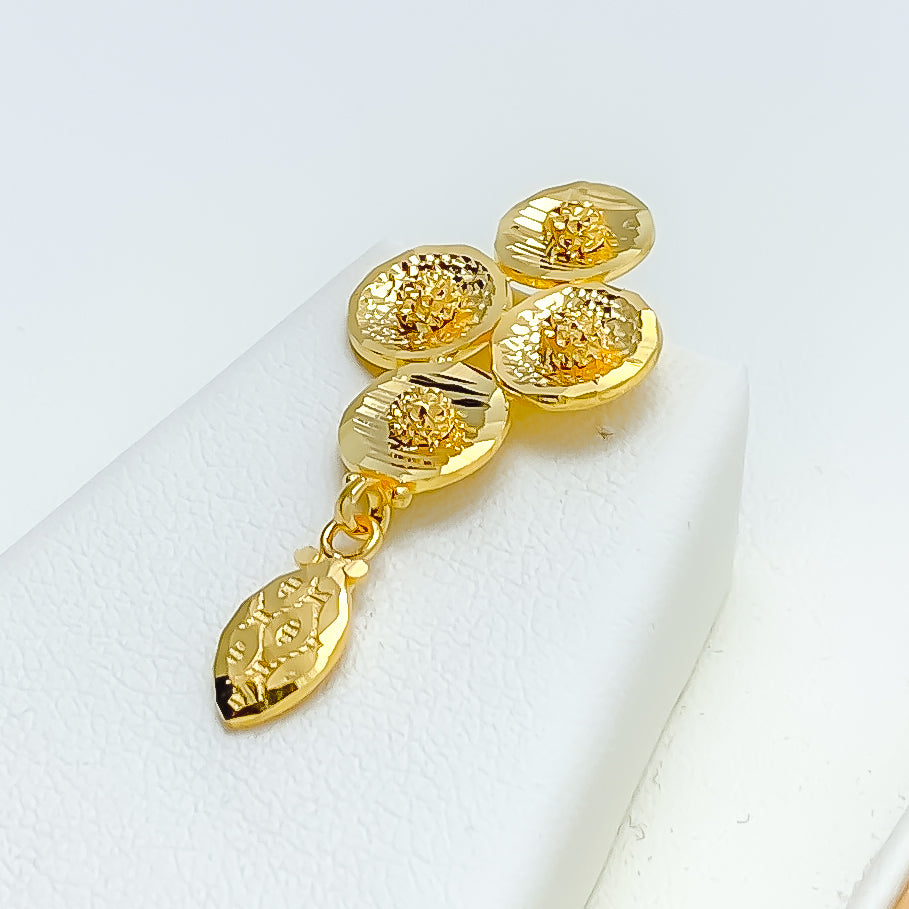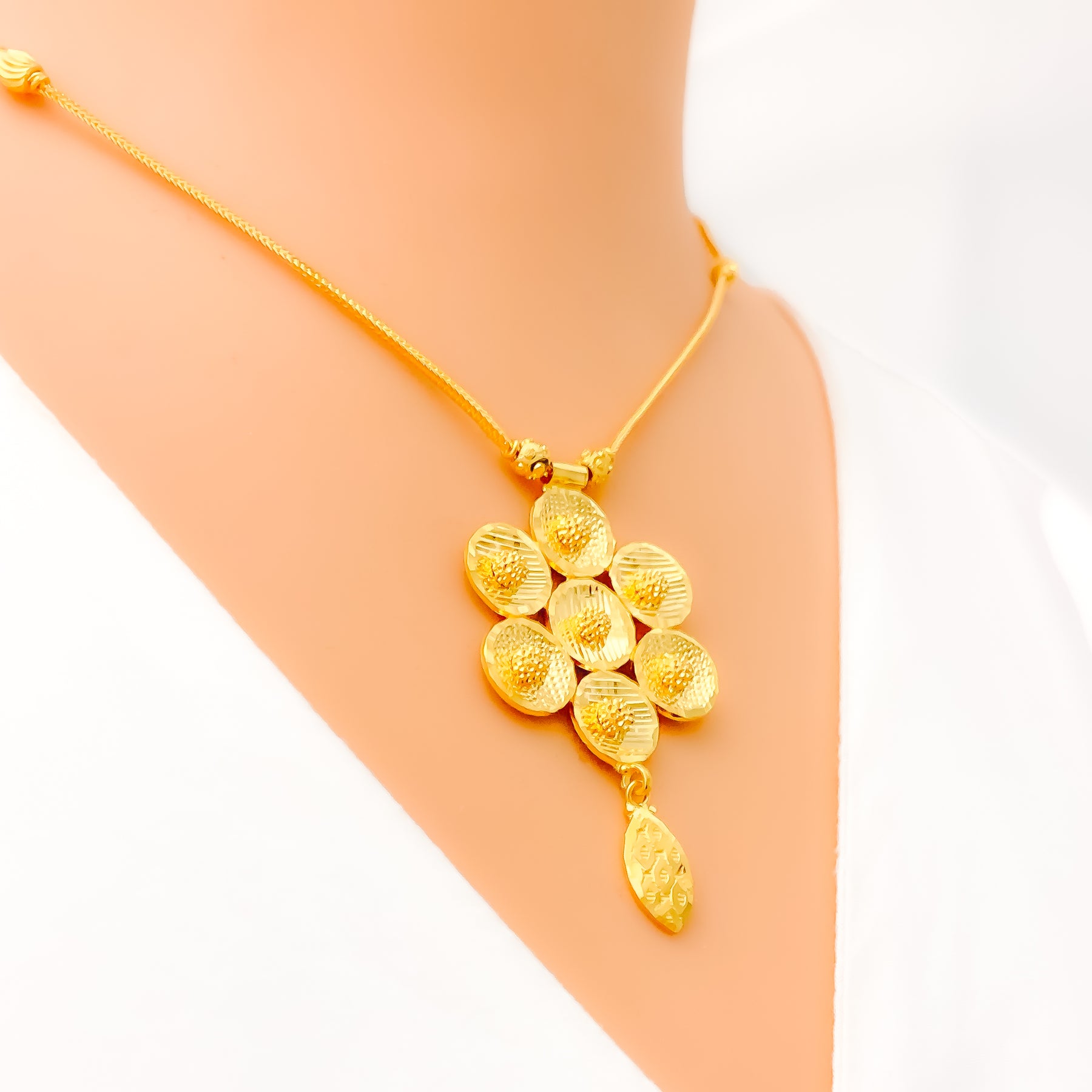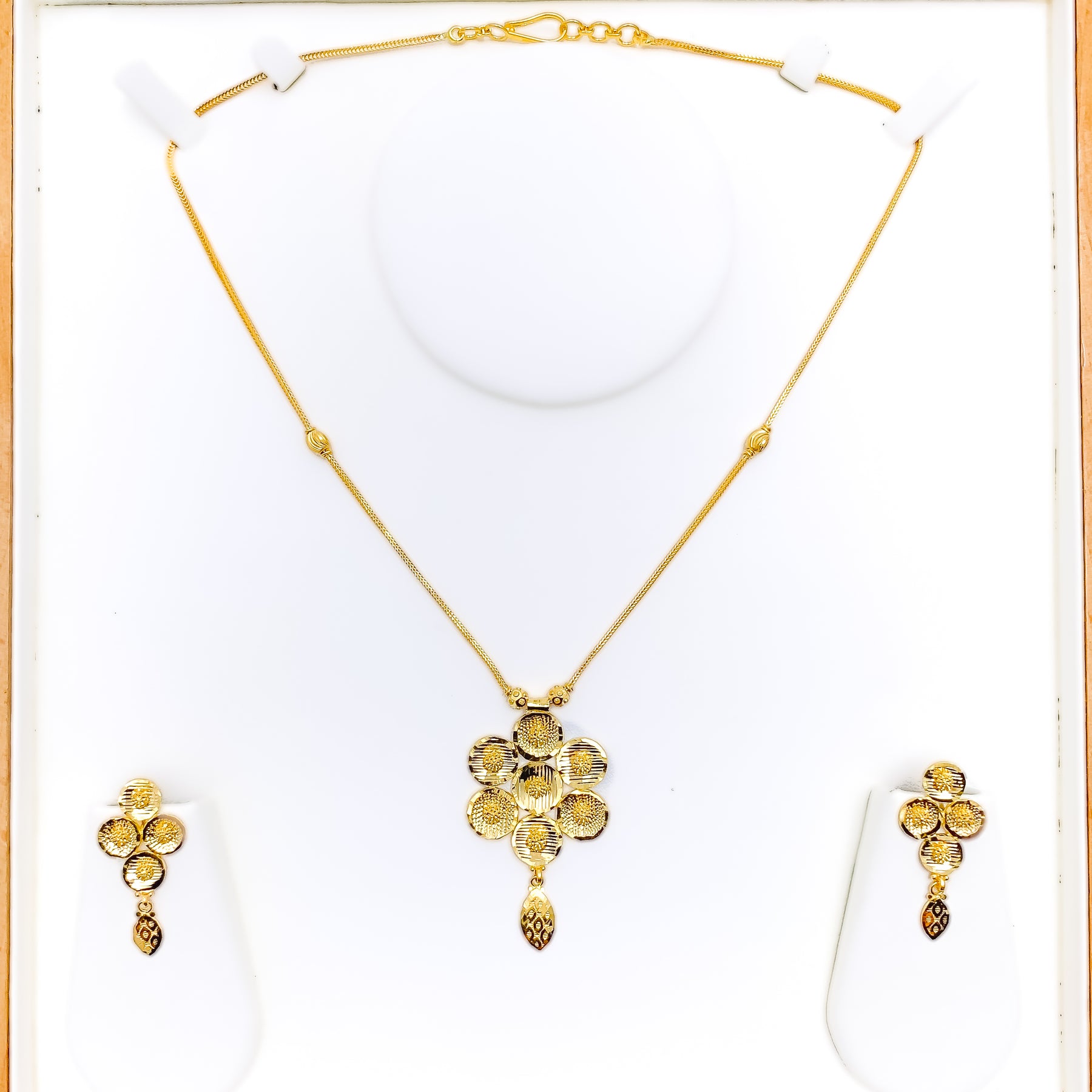 Understated in elegance, this 22k yellow gold Floral necklace set weighs 15.0 grams and features a smooth polished finish that enhances its subtle, glamorous appeal. The necklace measures 16 inches in length, resting gracefully along the neckline with a refined, balanced presence. Secured with a Hook lock, the set includes matching earrings measuring 1.4 inches, designed with comfortable screw-back posts. Effortlessly sophisticated, this set offers timeless beauty ideal for elevated everyday wear and graceful occasions.