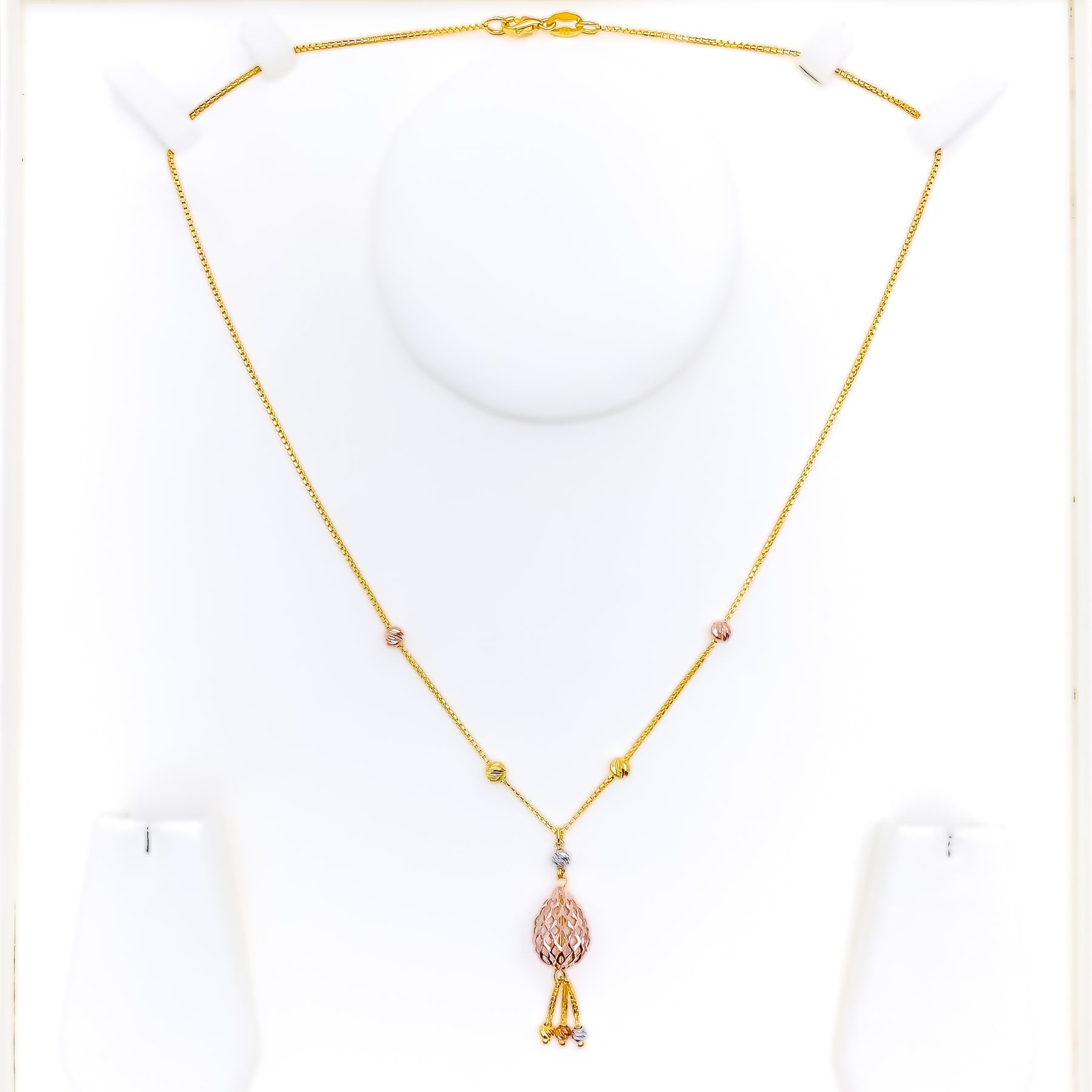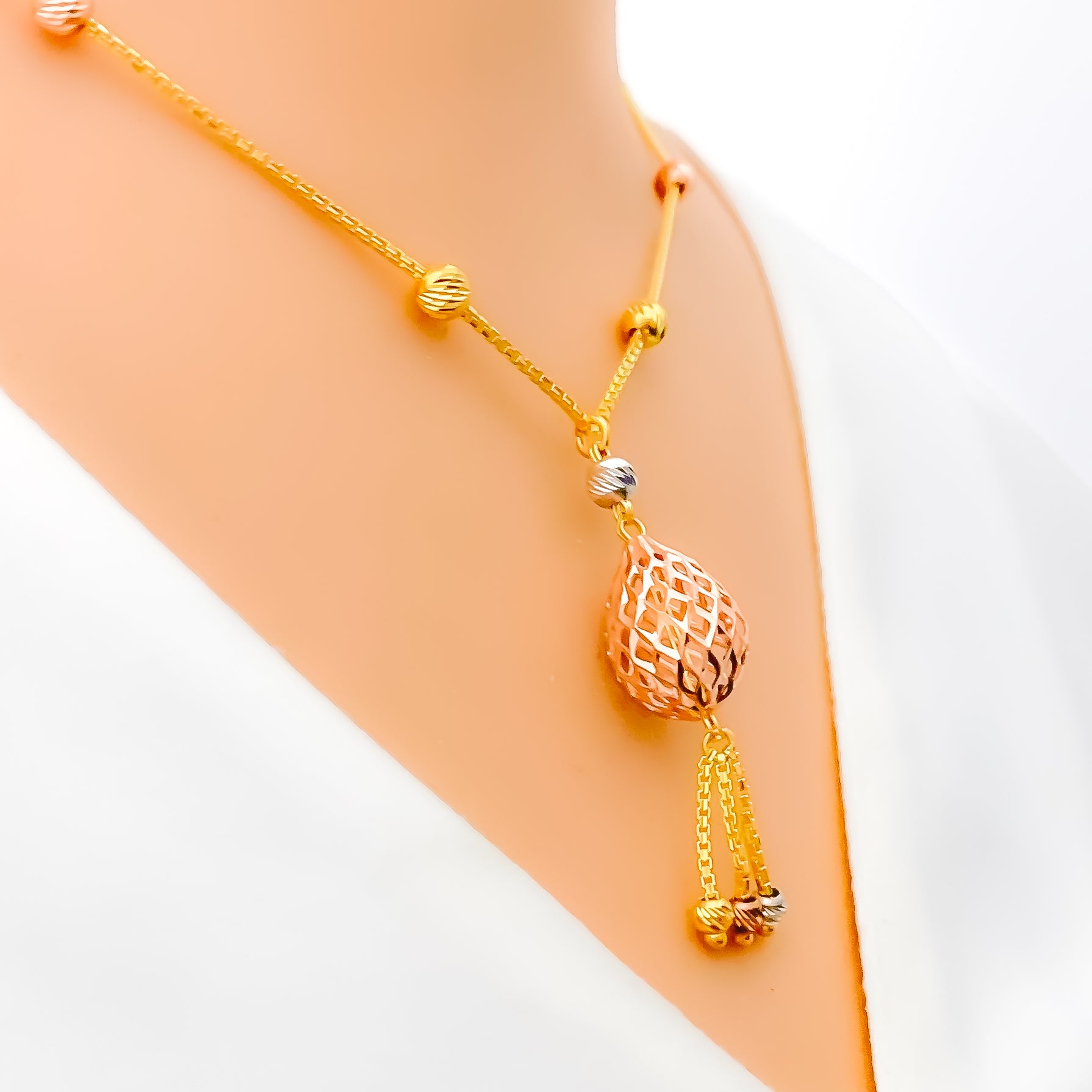 Splendidly crafted, this 22k three-tone gold necklace is the epitome of elegance. The weight is 8.0 grams, combining yellow, rose, and white gold in a mesh drop design. The necklace measures 18 inches in length with a 1.5-inch drop pendant. Secured by a sturdy lobster lock, this piece is a fusion of traditional craftsmanship and modern design. A beautiful accessory for any occasion.