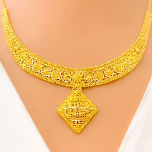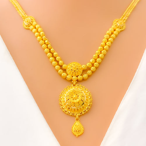 Magnificently crafted in 21k gold and weighing 52.3 grams, this luxurious set features a 30-inch long necklace with adjustable 3-inch links for a custom fit. Secured with a lobster lock, the radiant yellow gold finish exudes sophistication. Matching 1.6-inch earrings with hook backs complete this exquisite three-piece set, perfect for making a grand statement.