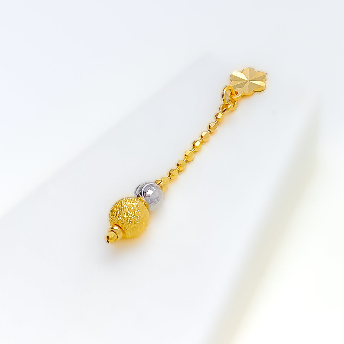 Textured in allure, this 22k gold necklace set weighs 14.0 grams and features a distinctive sand-finished surface highlighted by a polished blend of yellow and white gold tones. The layered design showcases a first row length of 16 inches and an extended last row length of 18 inches, creating a graceful, dimensional drape along the neckline. Secured with a dependable lobster lock, the set includes matching earrings measuring 1.5 inches, crafted with comfortable push-back posts. Artistic yet refined, this set offers timeless sophistication ideal for statement occasions and elevated everyday styling.