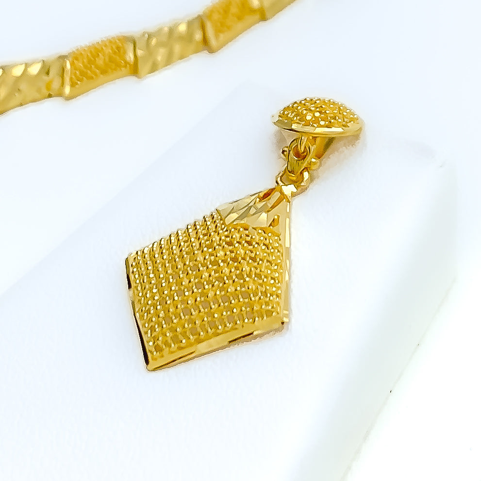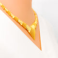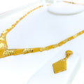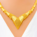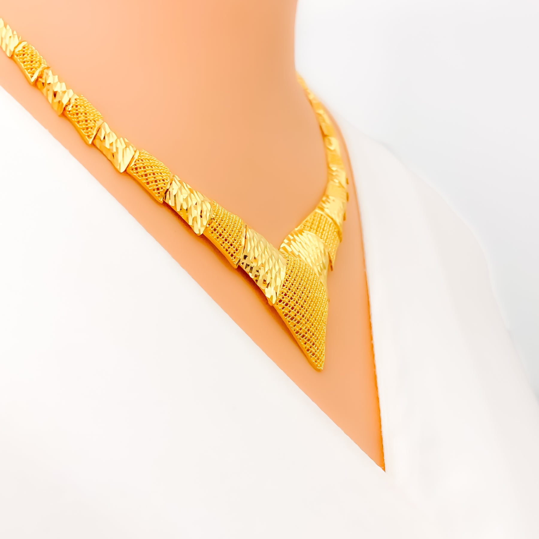 Stylishly sculpted, this 22k gold necklace set weighs 29.4 grams and features a striking V-shaped silhouette that reflects light beautifully with its polished yellow gold finish. The 18-inch necklace includes generous 1.75-inch adjustable links and secures with a lobster lock for a comfortable, customizable fit. Paired with 1.3-inch earrings featuring screw-back posts, the set delivers elegant symmetry and contemporary charm. Perfect for special occasions or refined daily wear, this piece offers a bold yet graceful statement.