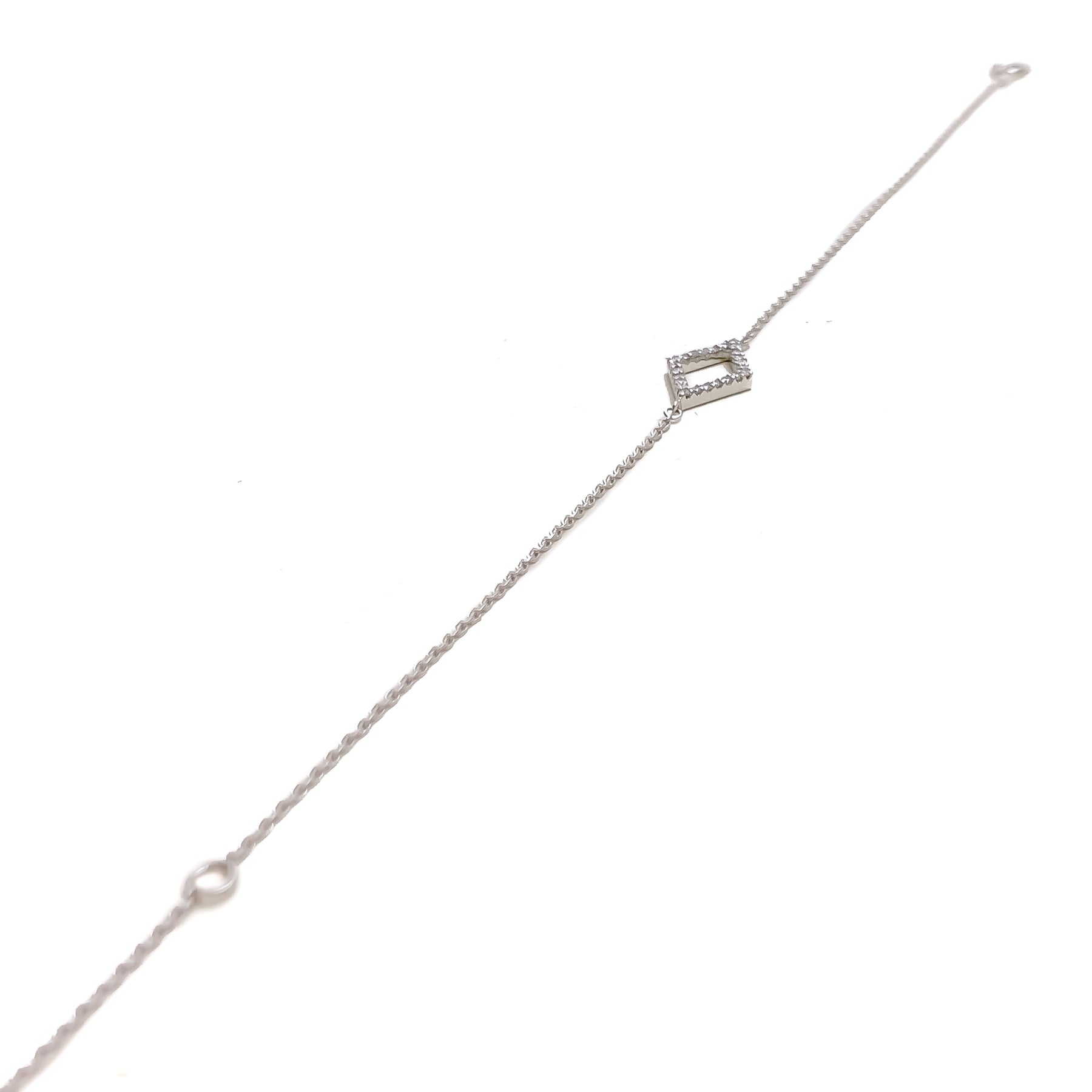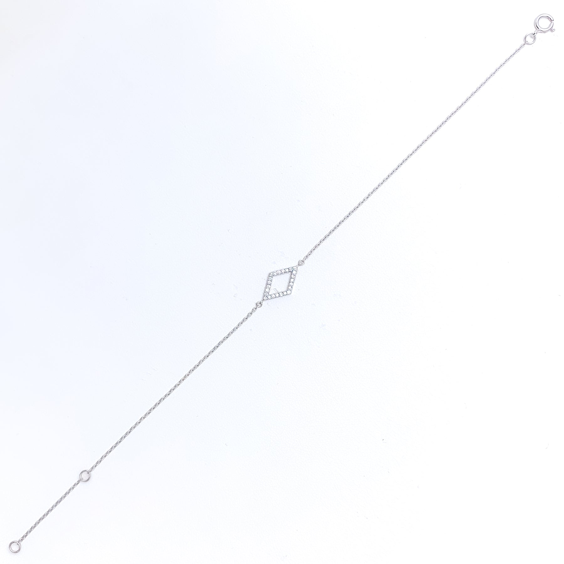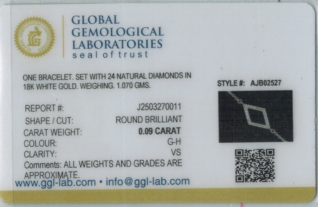 Stylishly refined, this 18k white gold bracelet weighs 1.07 grams and features a 0.09ct round brilliant diamond in an intricately decorative setting. With G-H color, VS clarity, and GGL certification, it gleams with sophistication. At 7.5", it’s secured with a lobster ring lock for graceful, everyday brilliance.