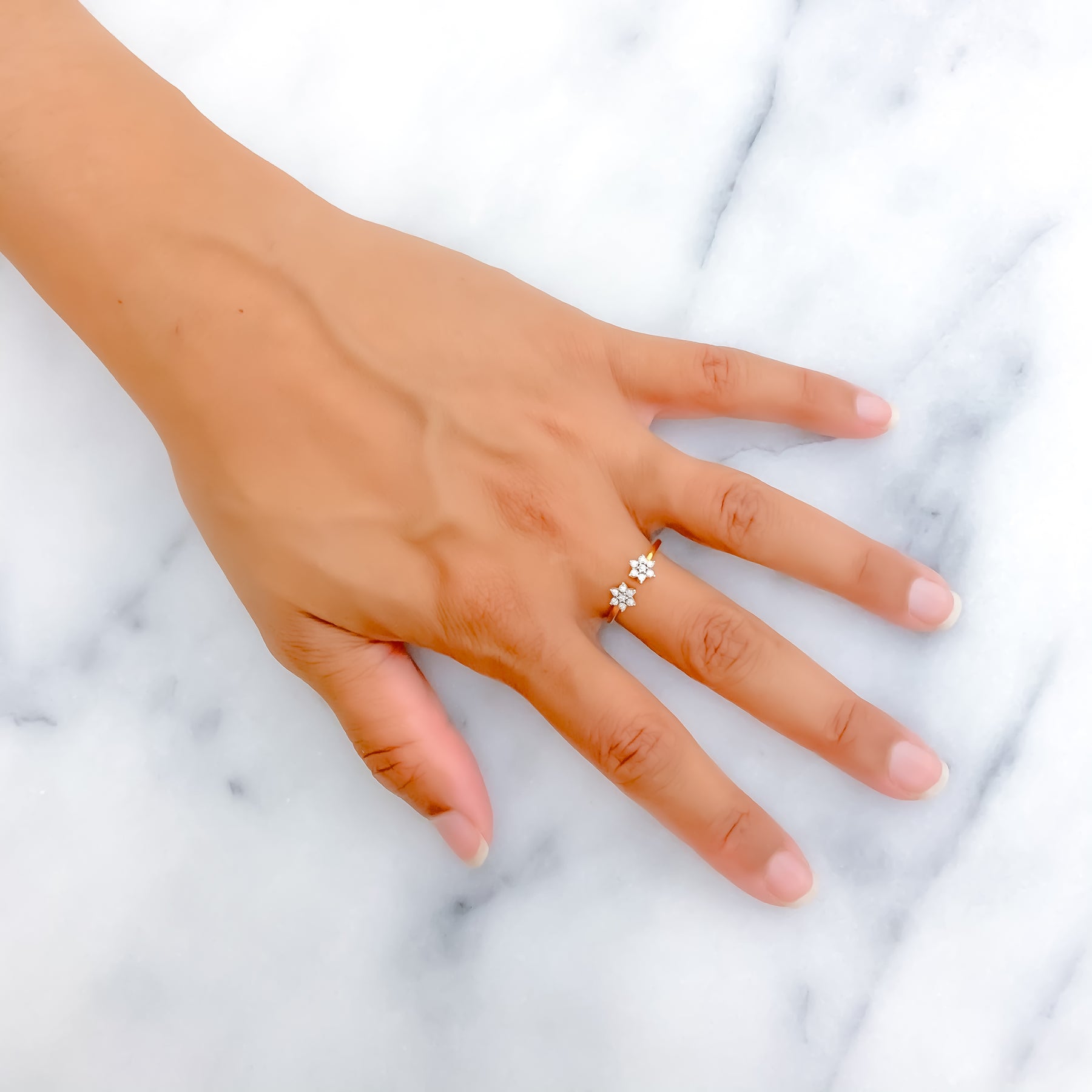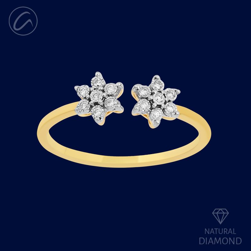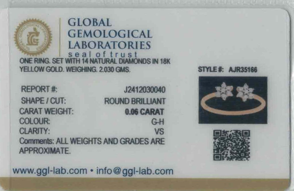 Charming and graceful, this 2.03-gram ring in 18k yellow gold features a delicate twin flower motif accented with 0.06ct of G-H color, VS clarity round brilliant diamonds. Sized at 7.5 with resizing available, it offers a light, elegant feel. GGL certified, it’s an iconic symbol of floral beauty and subtle sparkle.