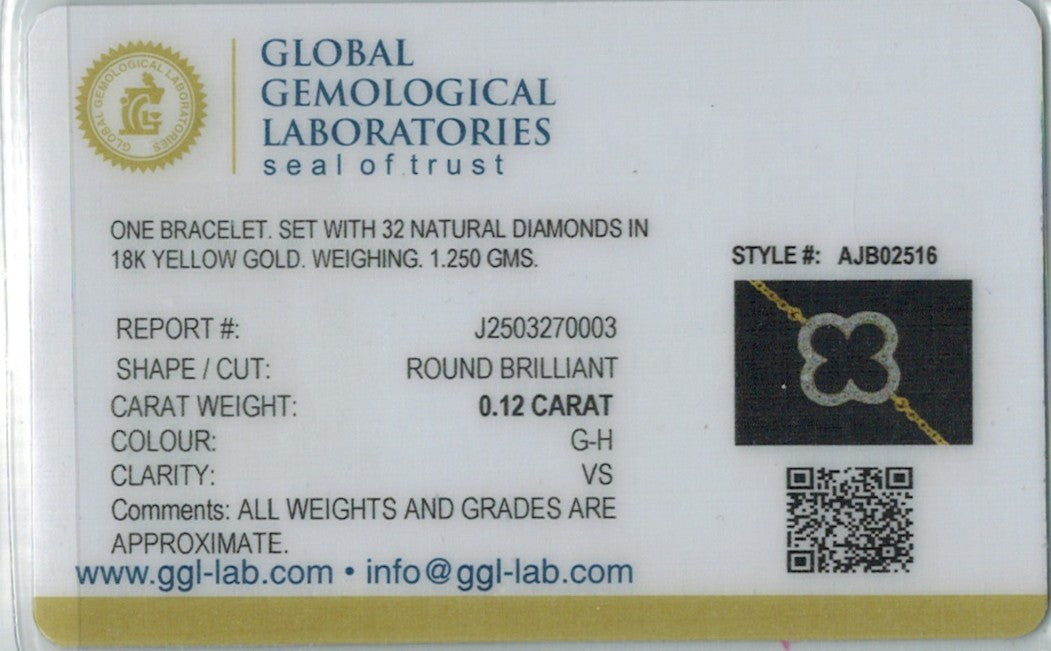 Delicately enchanting, this 18k yellow gold bracelet weighs 1.2 grams and features a captivating floral motif highlighted by a 0.12ct round brilliant diamond. With G-H color, VS clarity, and GGL certification, it radiates refined beauty. At 7.5" and secured with a lobster ring lock, it’s a rich and timeless expression of floral elegance.
