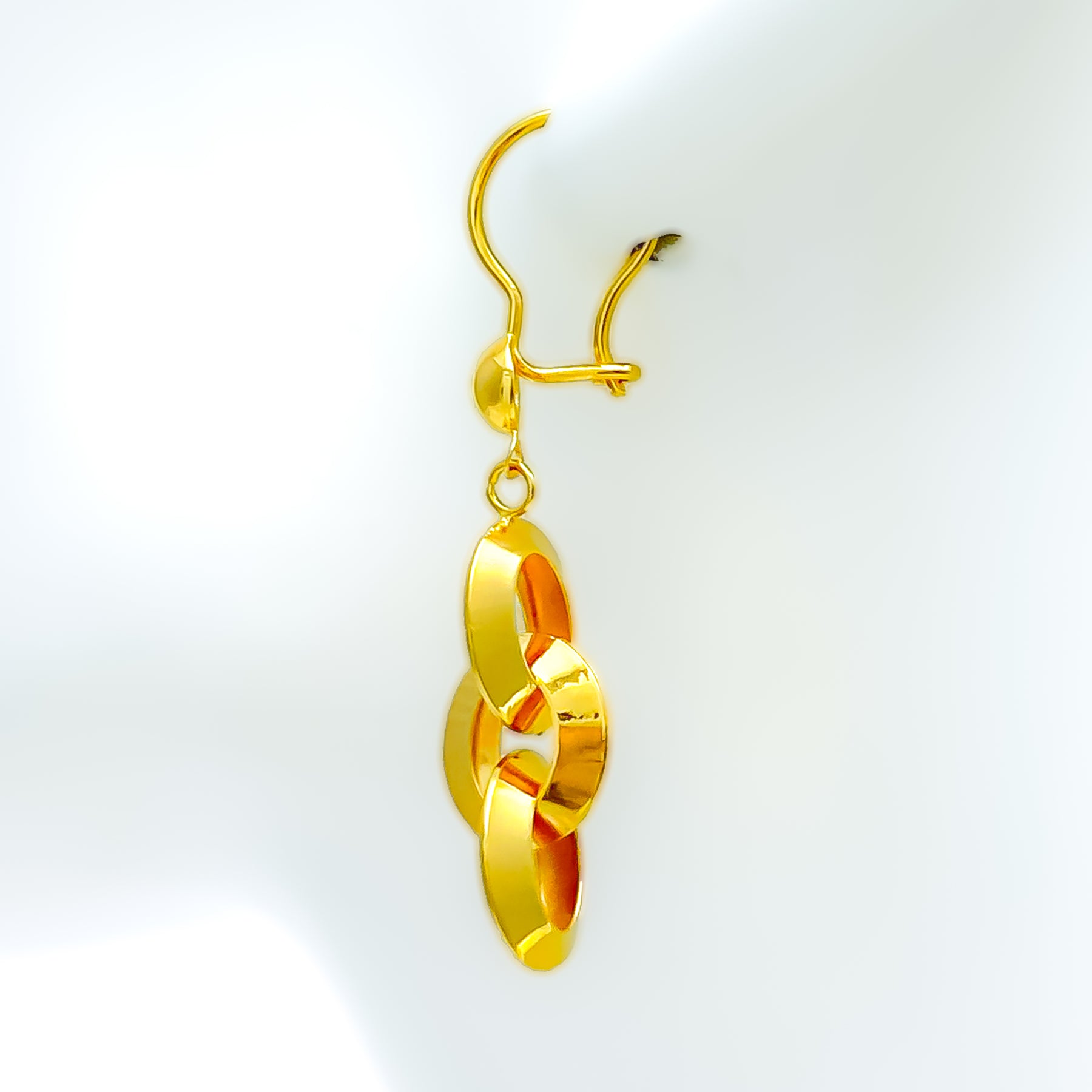 Crafted in radiant 21k yellow gold, these 4.2-gram earrings feature an elegant oval silhouette with a high-gloss finish. Measuring 1.75 inches in length, they hang gracefully from classic hook backs. Their polished form brings a sophisticated touch to both daily and special occasion wear.