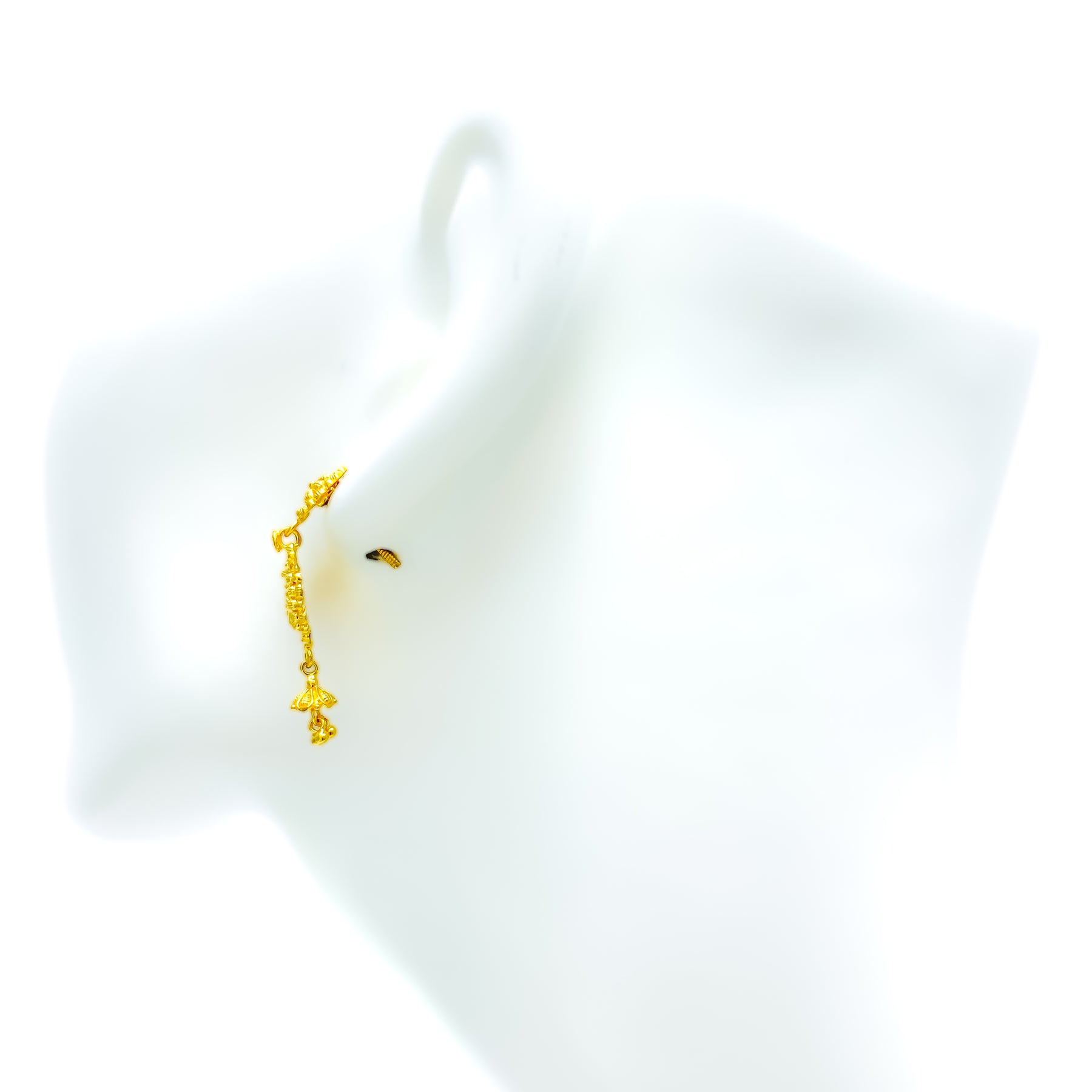 Blending intricate floral motifs with a classic checkered pattern, these 22k yellow gold Jhumki earrings offer a refined balance of elegance and design. Weighing 7.7 grams with a 1.5-inch length, they showcase a graceful drop that captures traditional charm. The detailed craftsmanship enhances their timeless appeal. Secured with a screw back, they’re a sophisticated choice for festive and cultural occasions.