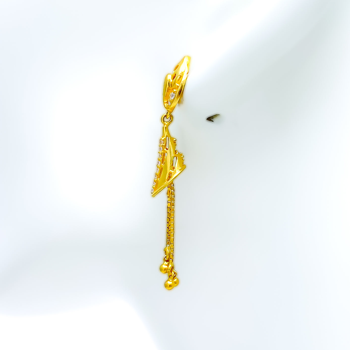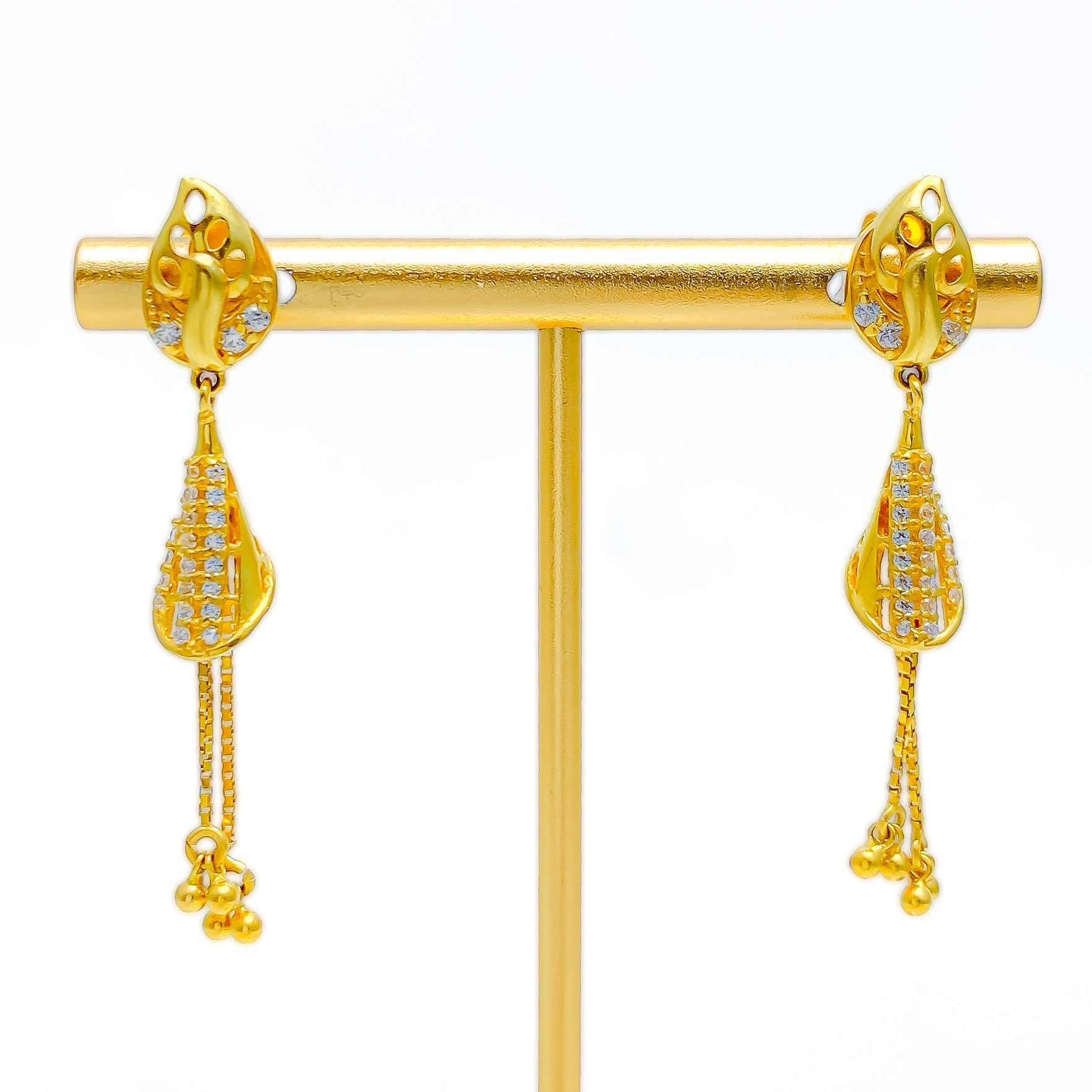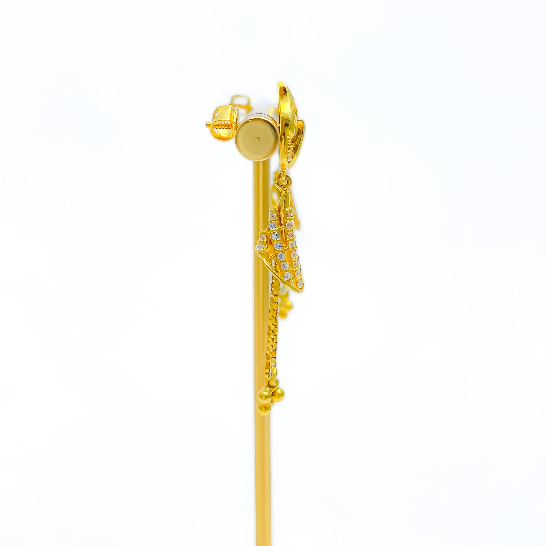 Radiantly designed, these 22k gold earrings shimmer with brilliance through meticulously set CZ stones. Weighing 6.3 grams, their 1.9-inch hanging design creates graceful movement and sparkle. The yellow gold finish enhances their luxurious tone. Ideal for elevating both festive and formal ensembles with refined allure.