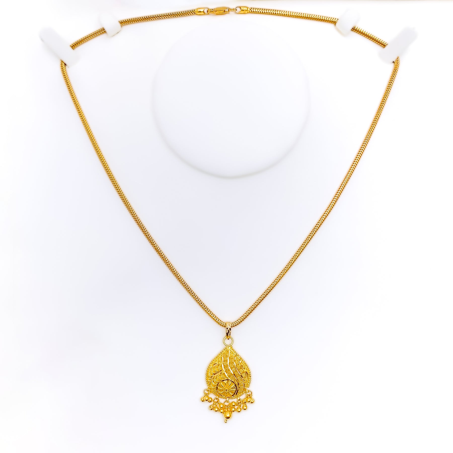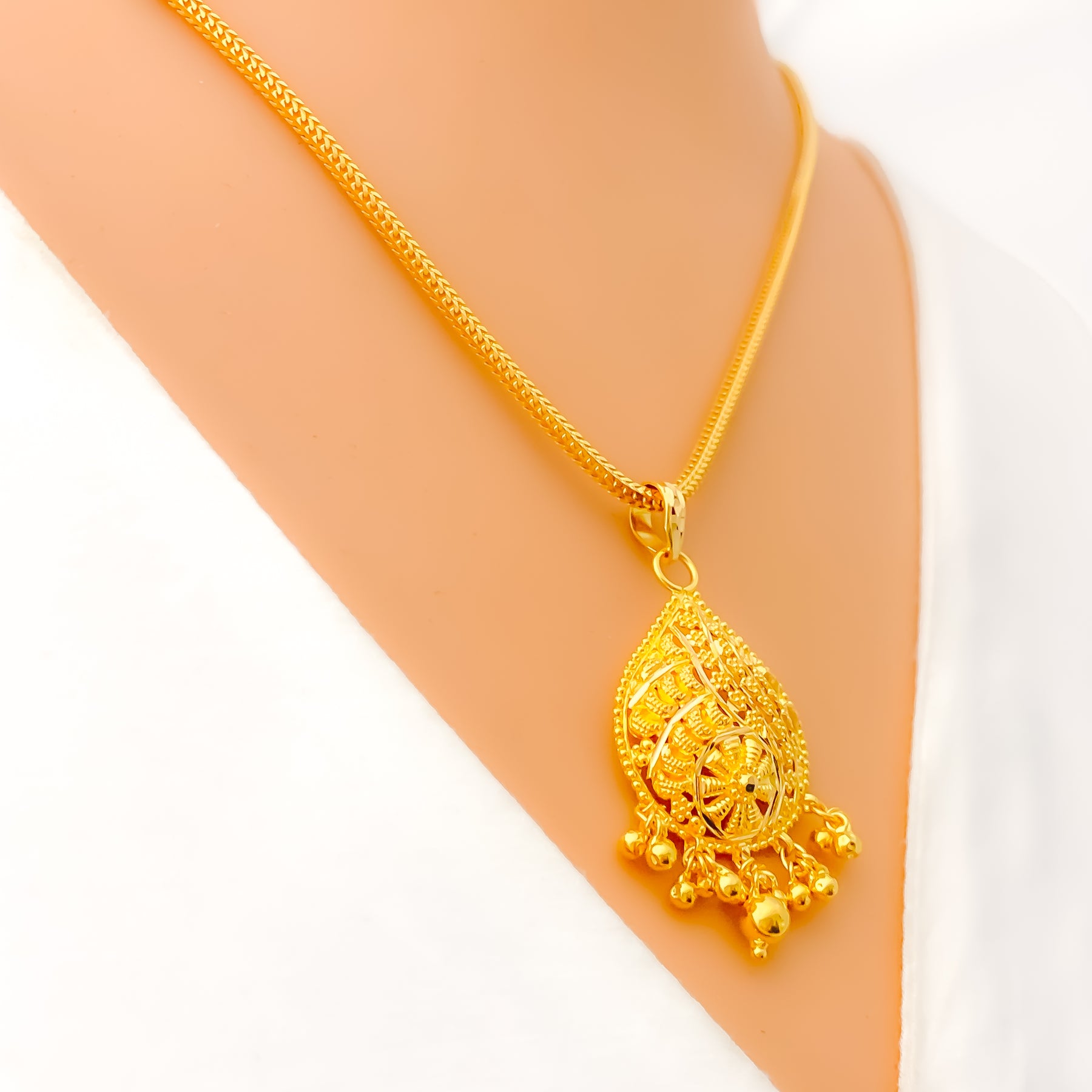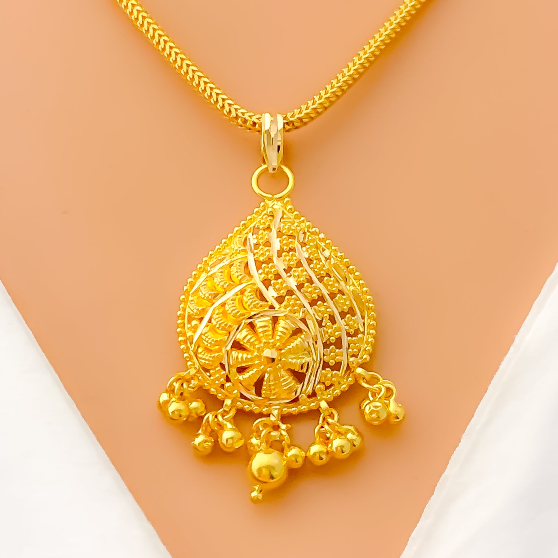 This exquisite 22k yellow gold pendant, weighing 4.6 grams, showcases an adorned design that radiates regal elegance. The polished finish enhances its golden brilliance, offering timeless sophistication. Measuring 1.7" in length, it presents a graceful yet striking presence. A luxurious accessory that beautifully blends traditional artistry with refined charm, perfect for both everyday wear and special occasions, with chain not included.