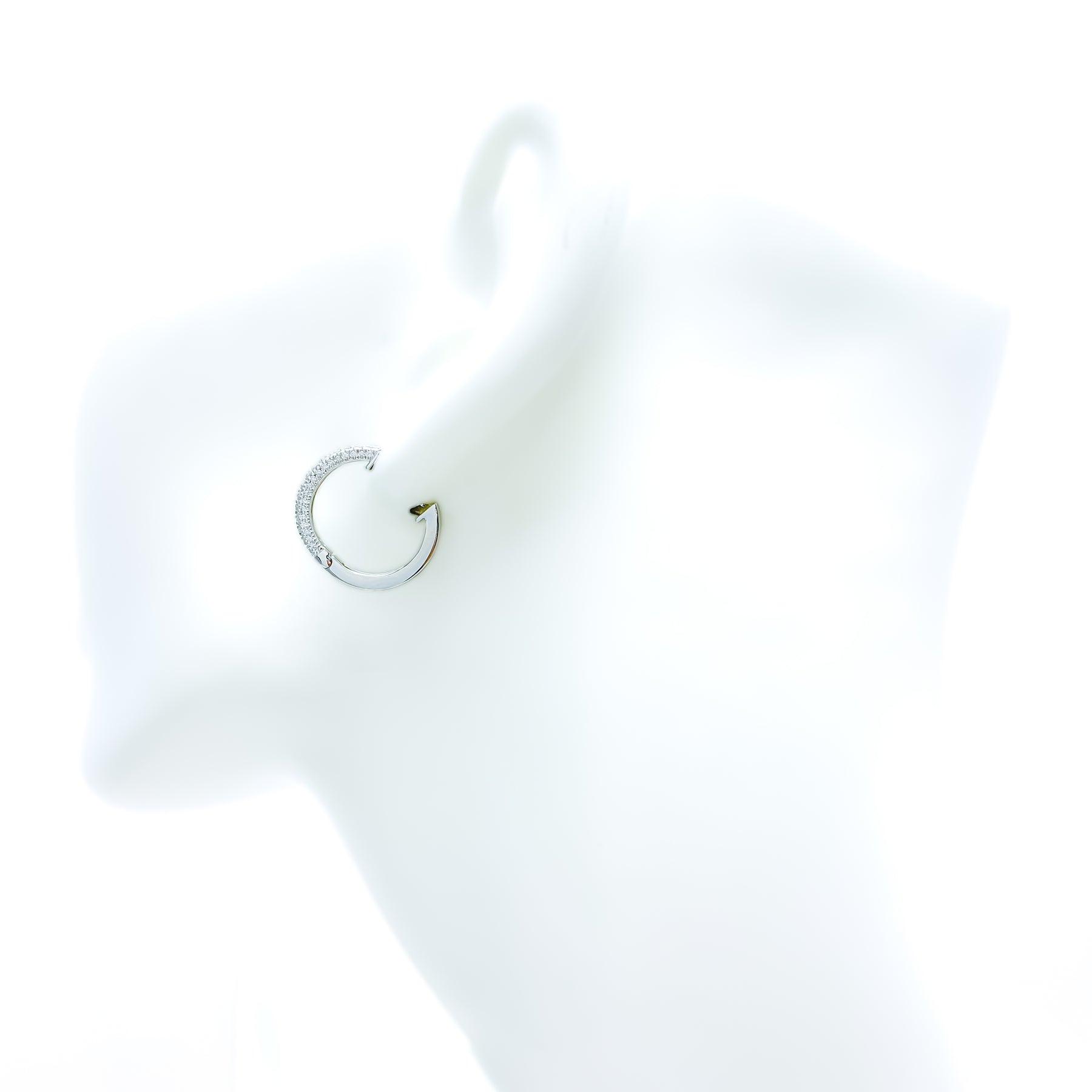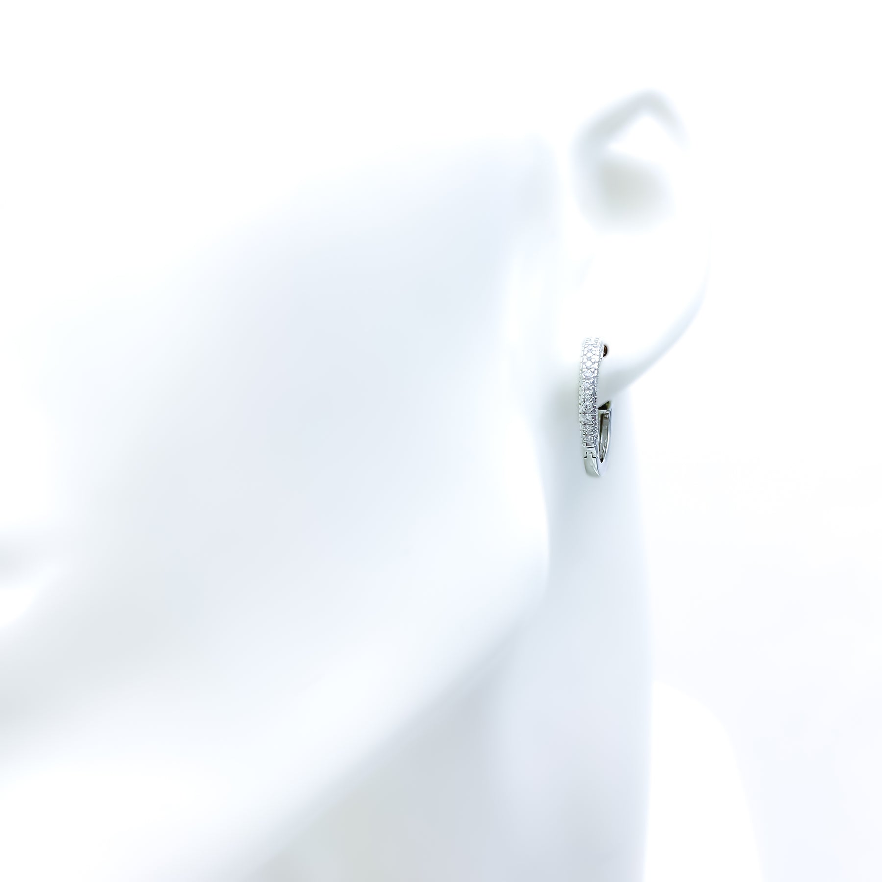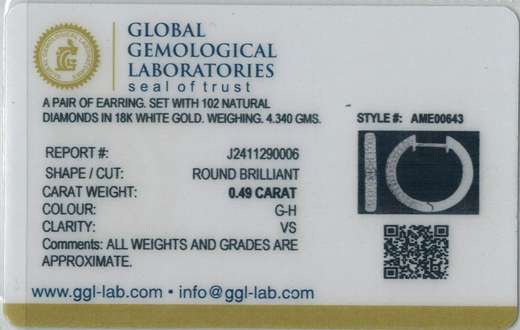 Eye-catching and refined, these 18k white gold Bali earrings weigh 4.3 grams and shine with 0.49ct of round brilliant-cut diamonds in G-H color and VS clarity. Measuring 0.7" in length, they offer a classic hoop silhouette with a push lock for secure wear. GGL certified, this pair blends graceful curves with dazzling sparkle—perfect for adding elegance to both formal attire and everyday sophistication.
