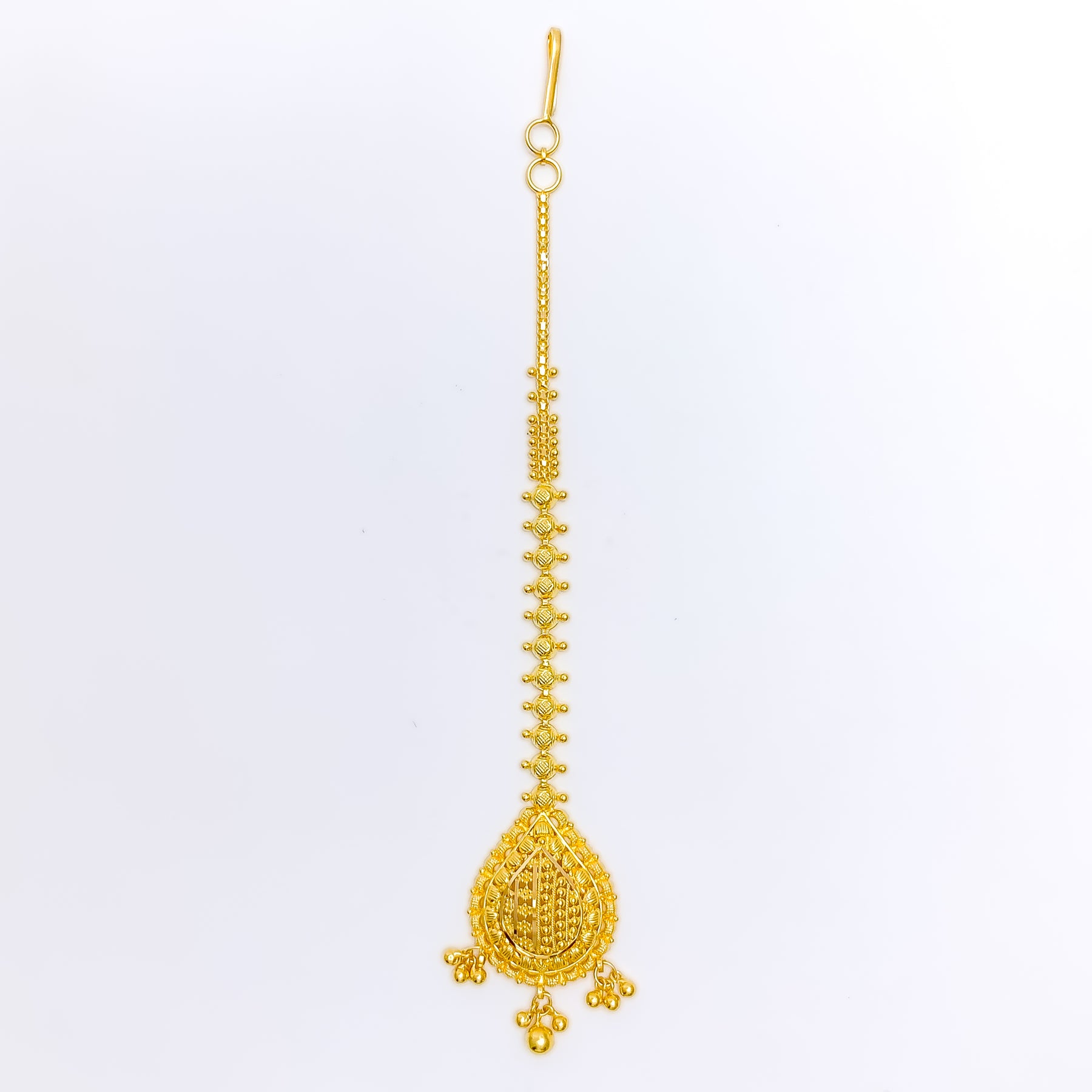 Delicately accented with graceful beading, this 22k yellow gold tikka weighs 6.3 grams and spans 5.5 inches. Its finely lined design offers subtle texture and charm, complemented by a polished finish. Secured with a classic hook clasp, it’s a beautiful choice for enhancing traditional elegance.