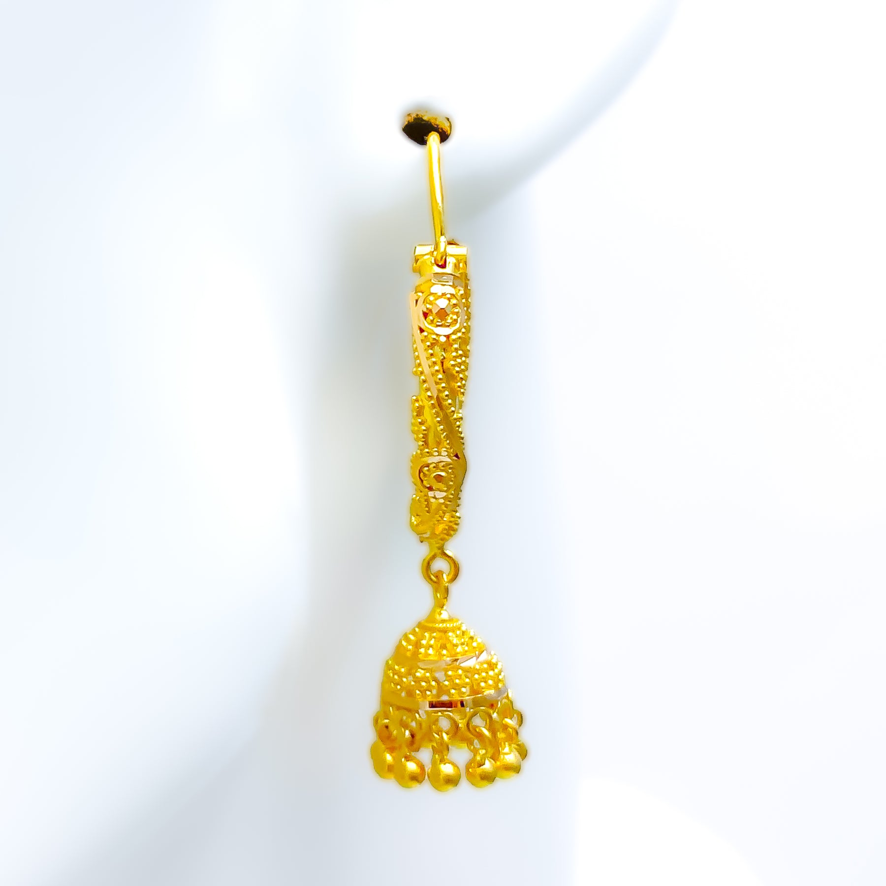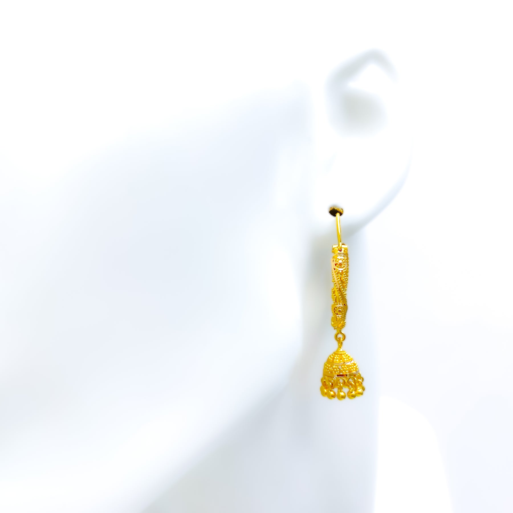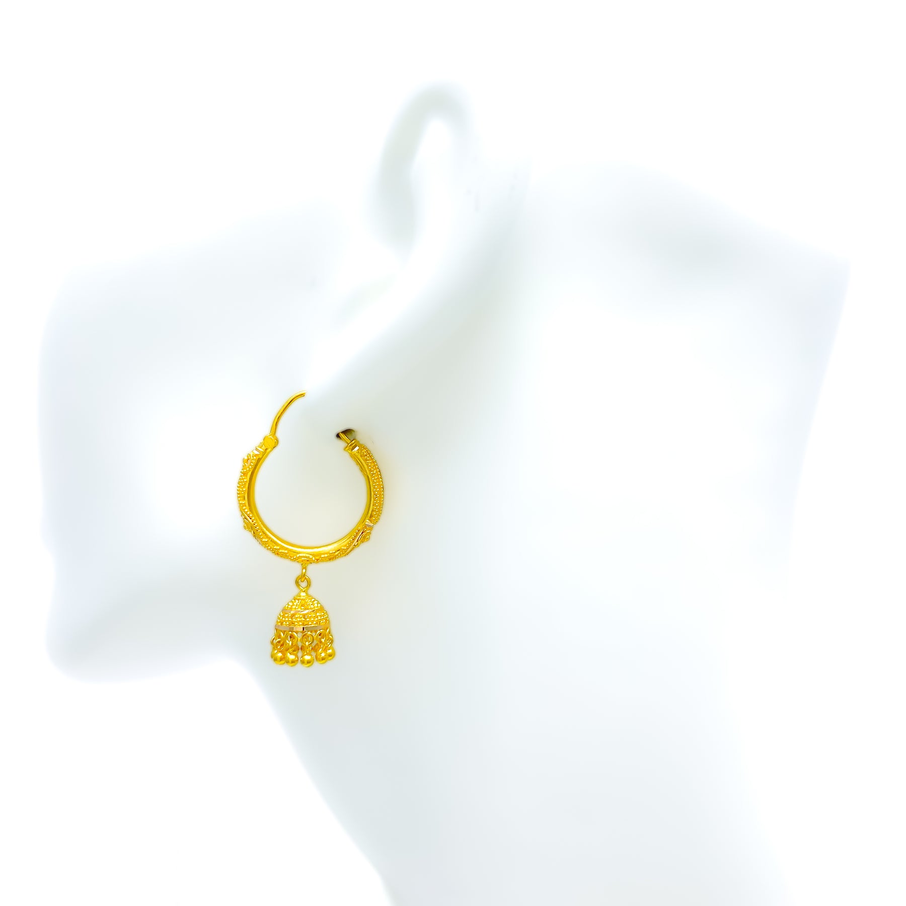 This striking pair of 22k yellow gold Bali earrings, weighing 10.3 grams, features a bold hoop design that radiates blooming elegance. The polished finish enhances their luminous brilliance, giving them timeless appeal. With a 0.8" diameter, they present a graceful yet strong presence. A refined accessory that seamlessly transitions from everyday wear to festive occasions with sophistication.