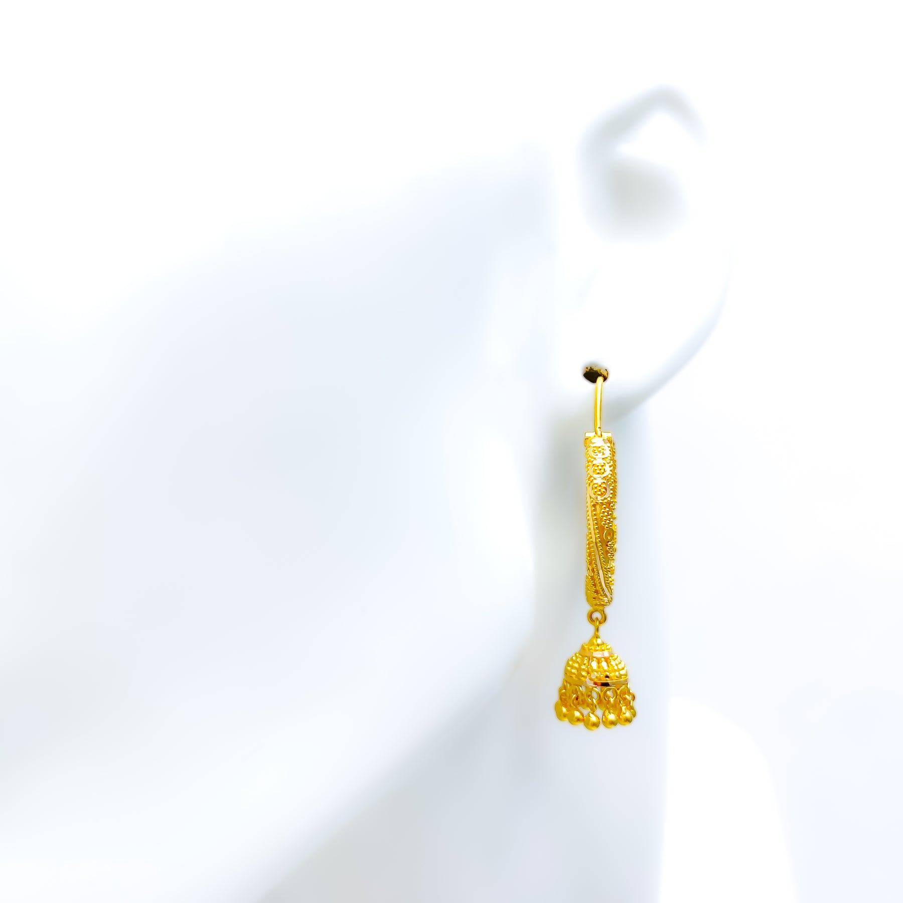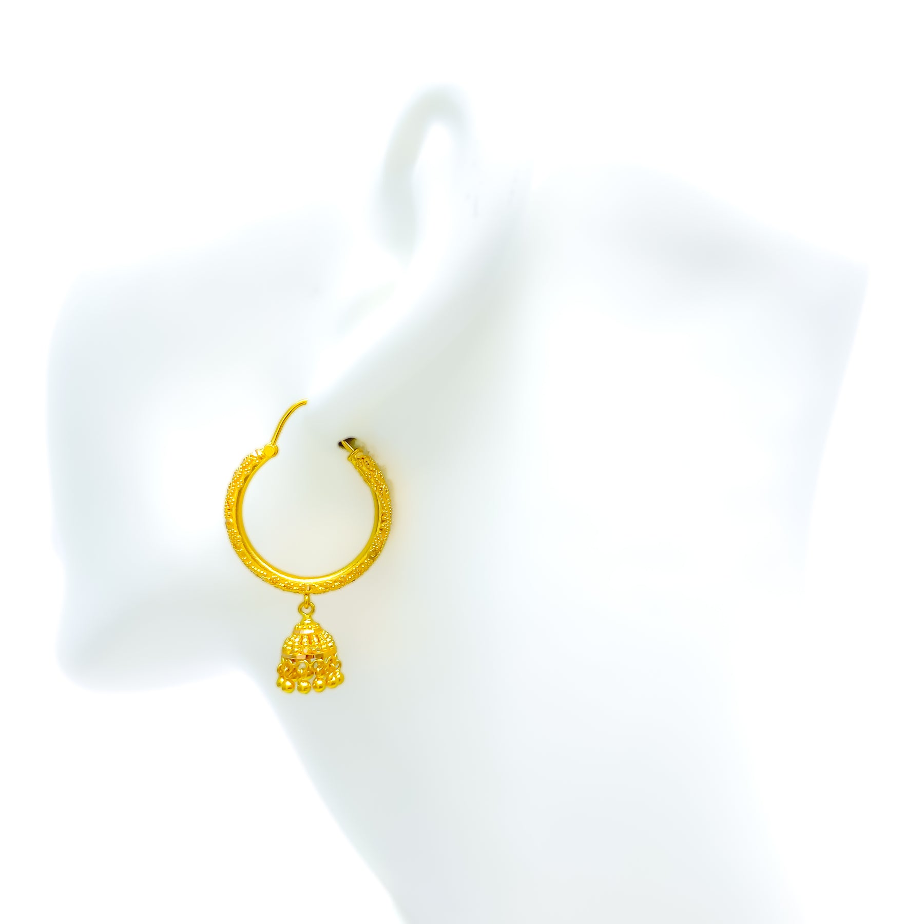 This striking pair of 22k yellow gold Bali earrings, weighing 11.4 grams, showcases a bold hoop design that radiates elevated sophistication. The polished finish enhances their luminous brilliance, offering a radiant glow. With a 1.2" diameter, they create a perfect balance of presence and elegance. A refined accessory that transitions seamlessly from daily wear to festive occasions with timeless charm.
