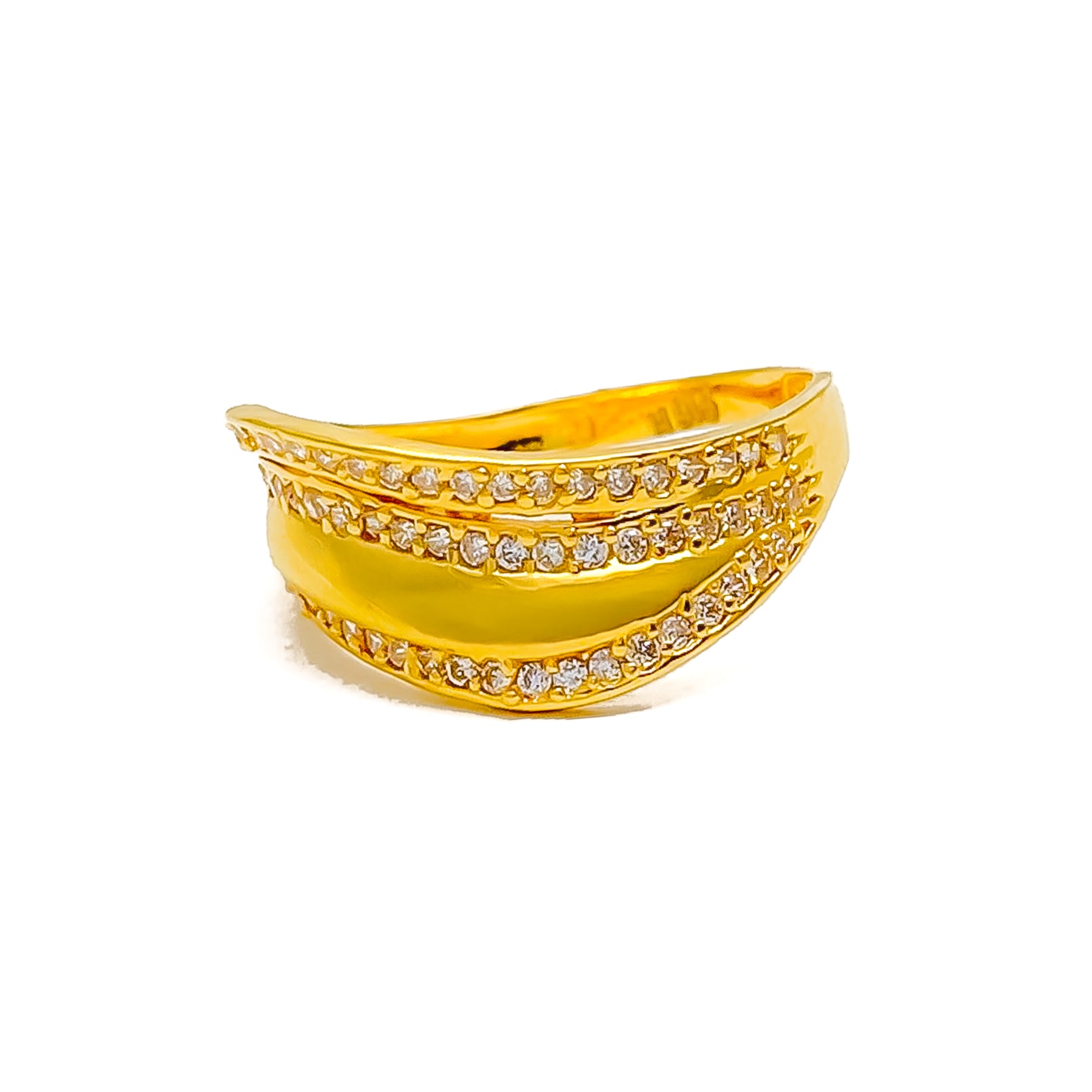 This refined ring blends luminous 22k yellow gold with the radiant sparkle of cubic zirconia, creating a look of timeless elegance. Weighing 3.3 grams, it offers a comfortable yet luxurious presence on the hand. Designed in size 6.75 with re-sizing available, it ensures a perfect tailored fit. A versatile piece, it seamlessly transitions from daily wear to special occasions with sophistication.