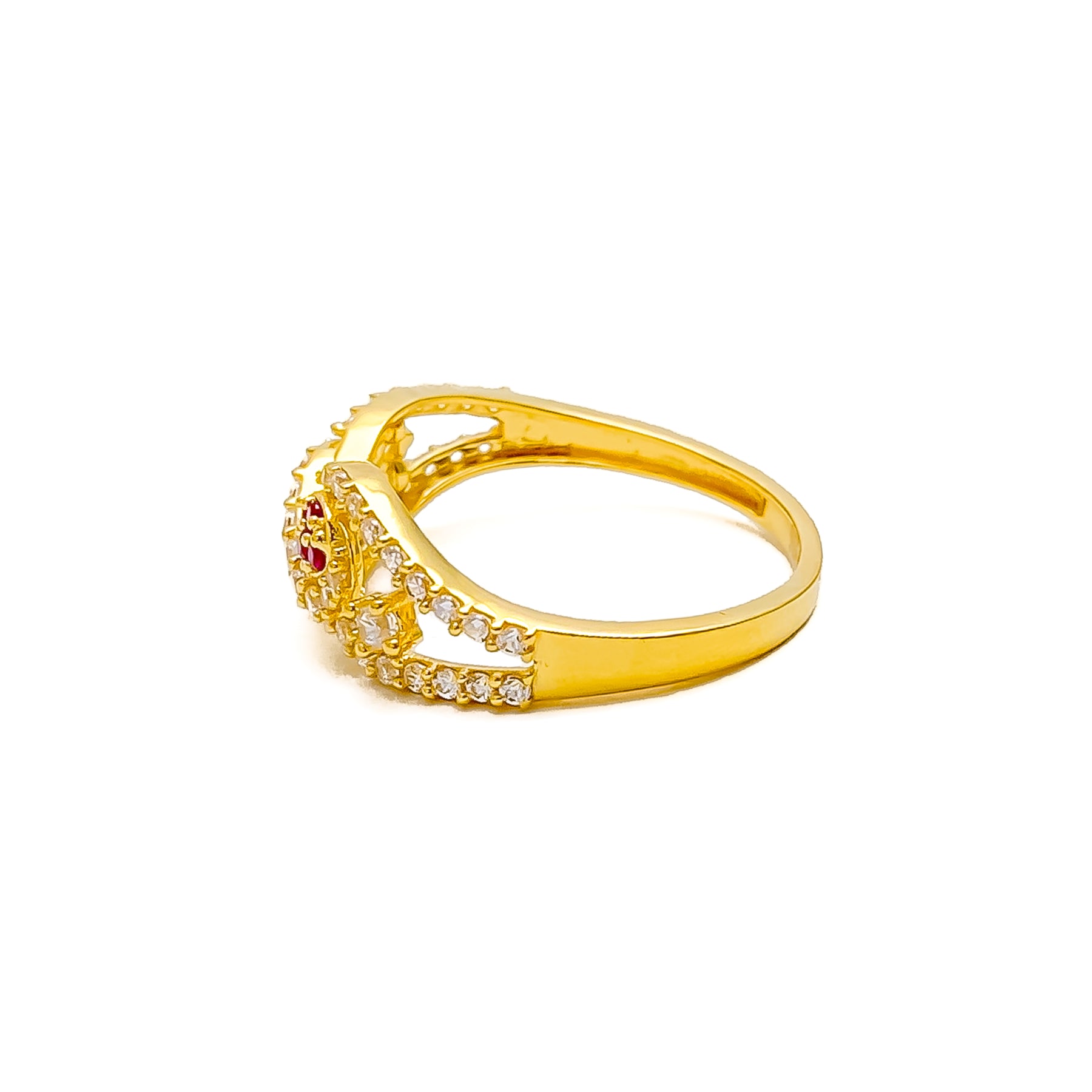 Gracefully crafted in radiant 22k yellow gold, this ring shimmers with precision-set cubic zirconia for a timeless, elegant appeal. The delicate profile balances sparkle with subtlety, making it perfect for both daily wear and refined occasions. Its clean lines and classic silhouette ensure lasting charm. Custom ring sizing is available for the ideal fit.