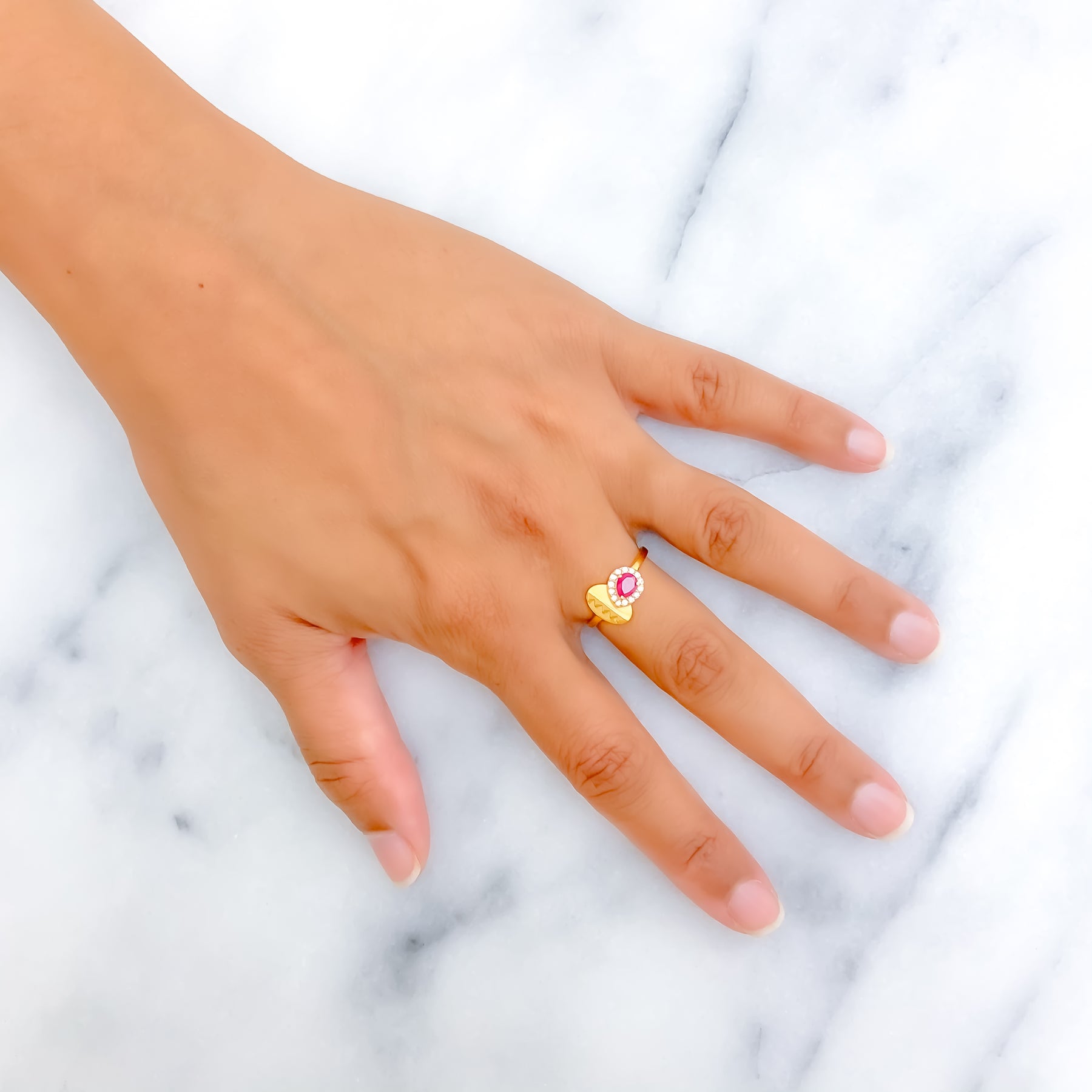 Crafted in radiant 22k yellow gold, this chic ring showcases dazzling cubic zirconia accents that enhance its refined charm. The sleek design makes it a versatile addition to any jewelry rotation. With a comfortable 2.5g weight, it balances elegance and everyday wear beautifully. A timeless piece that pairs effortlessly with modern or traditional ensembles.