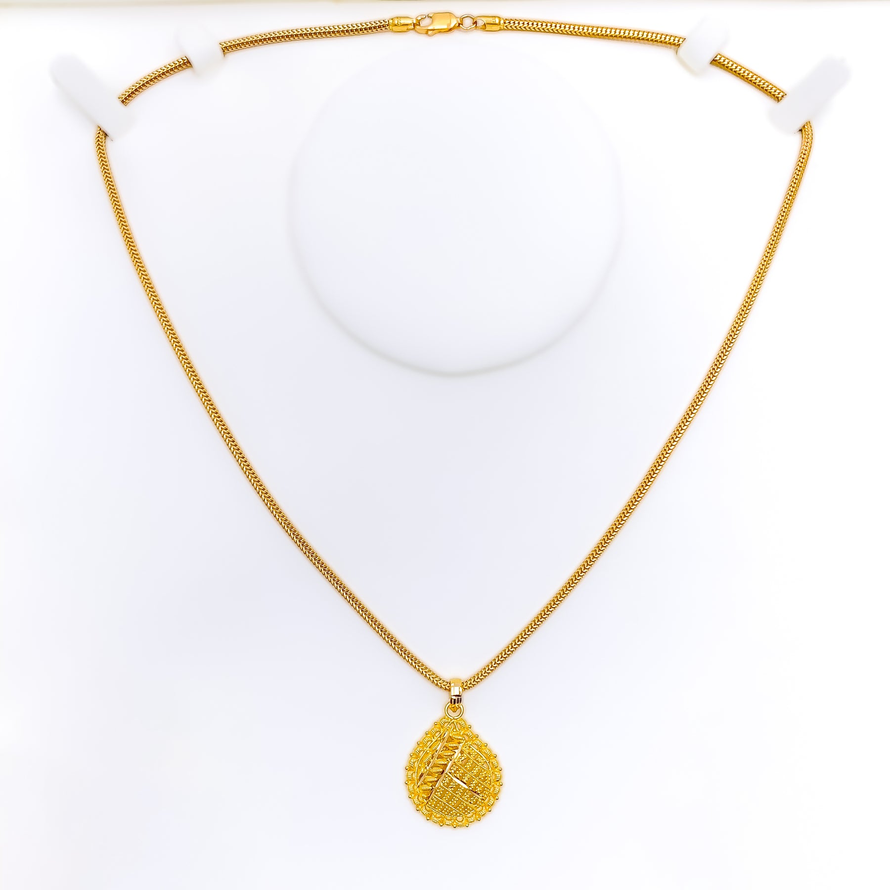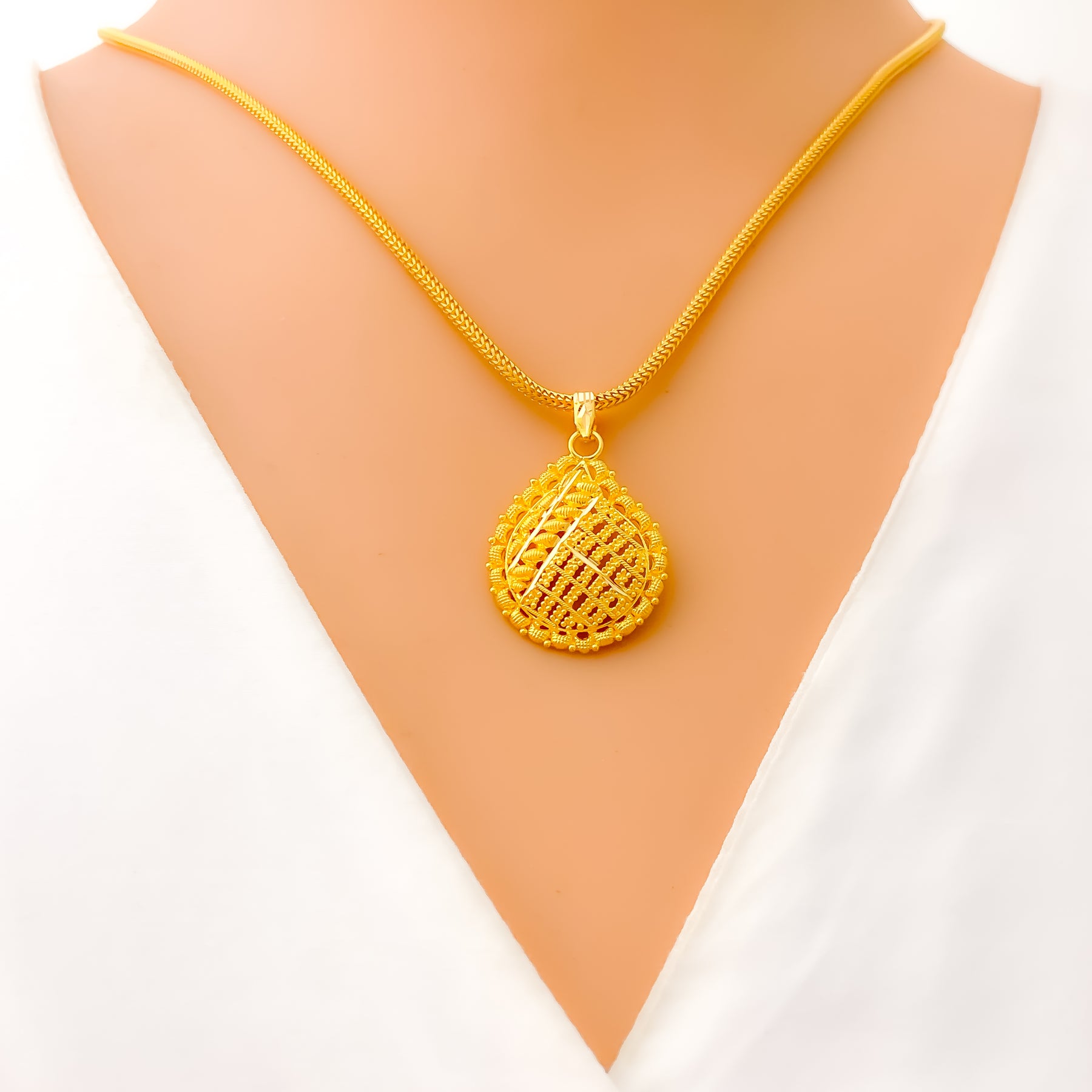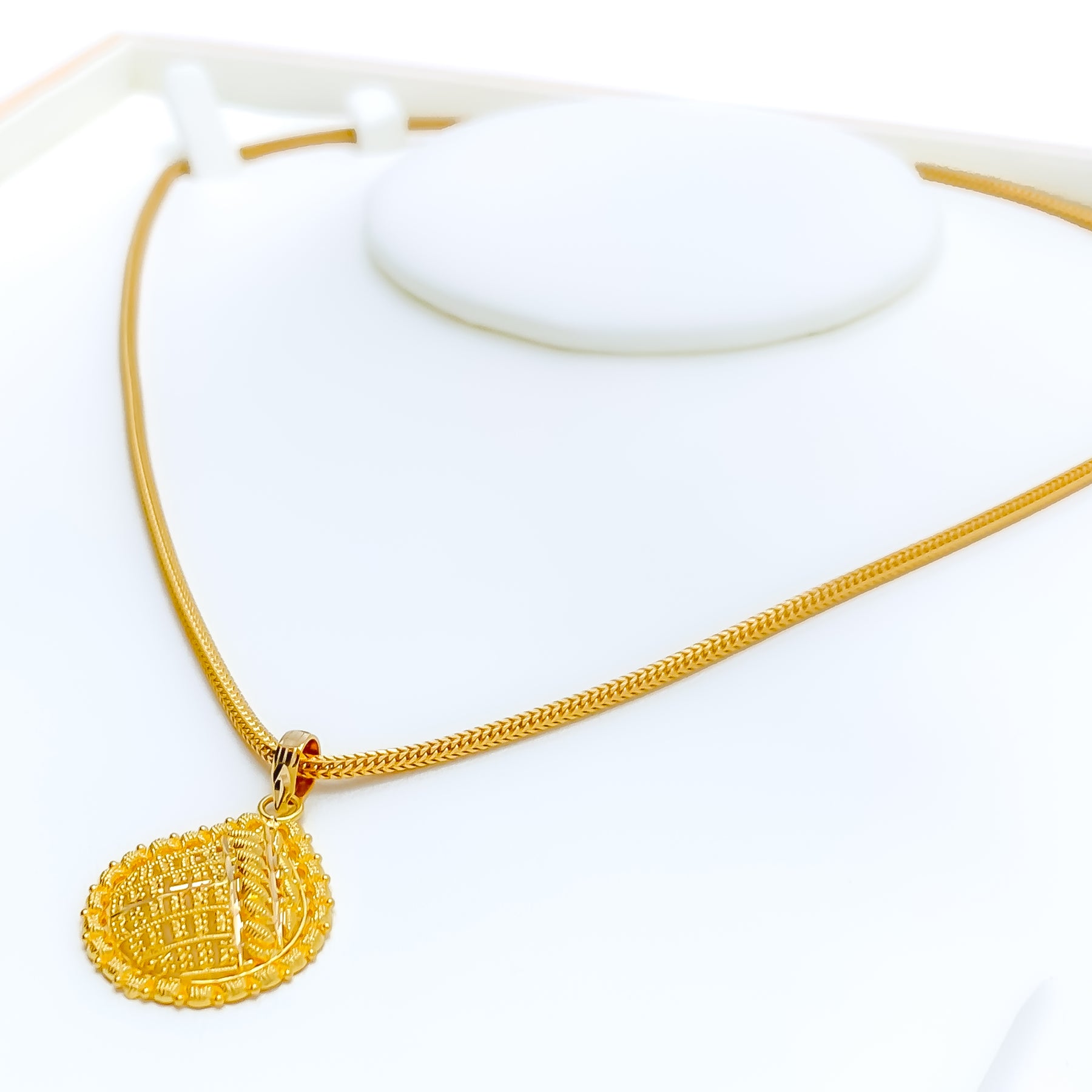 This refined 22k yellow gold pendant, weighing 3.0 grams, showcases a stylish design that radiates dapper sophistication. The polished finish enhances its golden brilliance, adding timeless allure. Measuring 1.2" in length, it presents a graceful yet versatile presence. A sleek accessory that beautifully blends modern flair with classic elegance, perfect for both everyday wear and festive occasions, with chain not included.